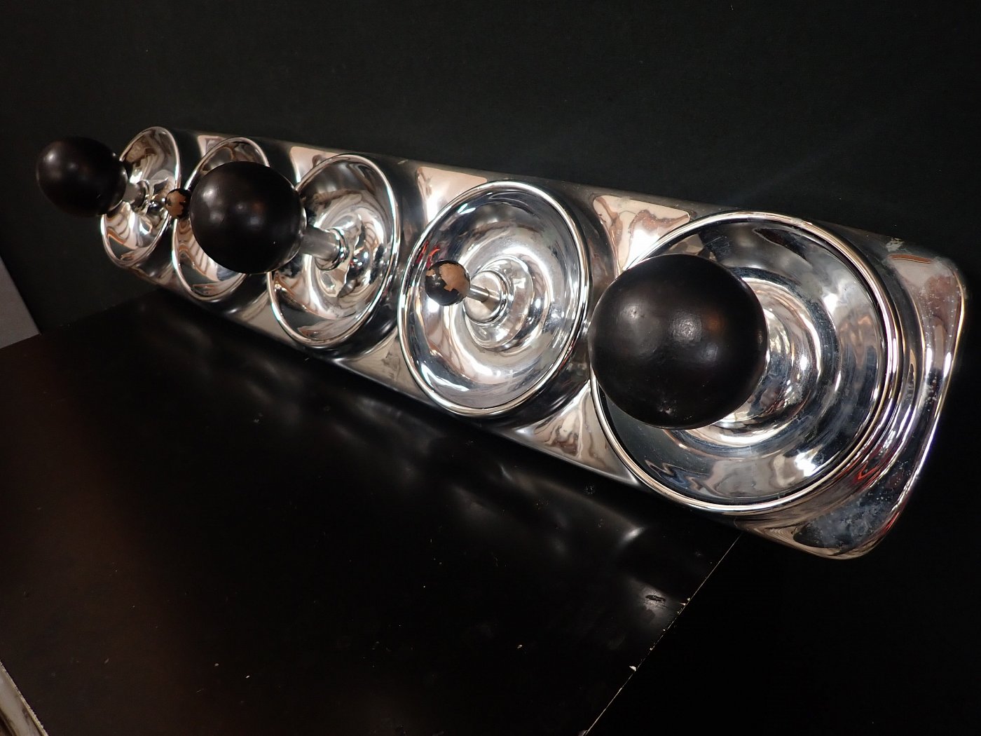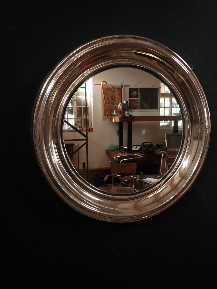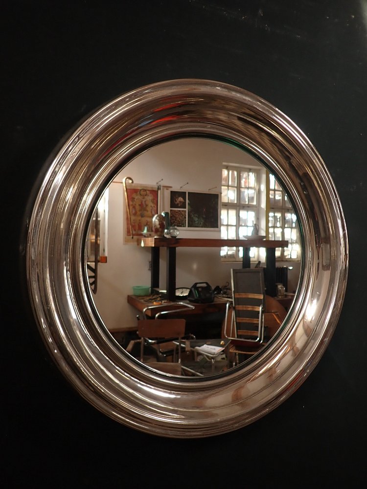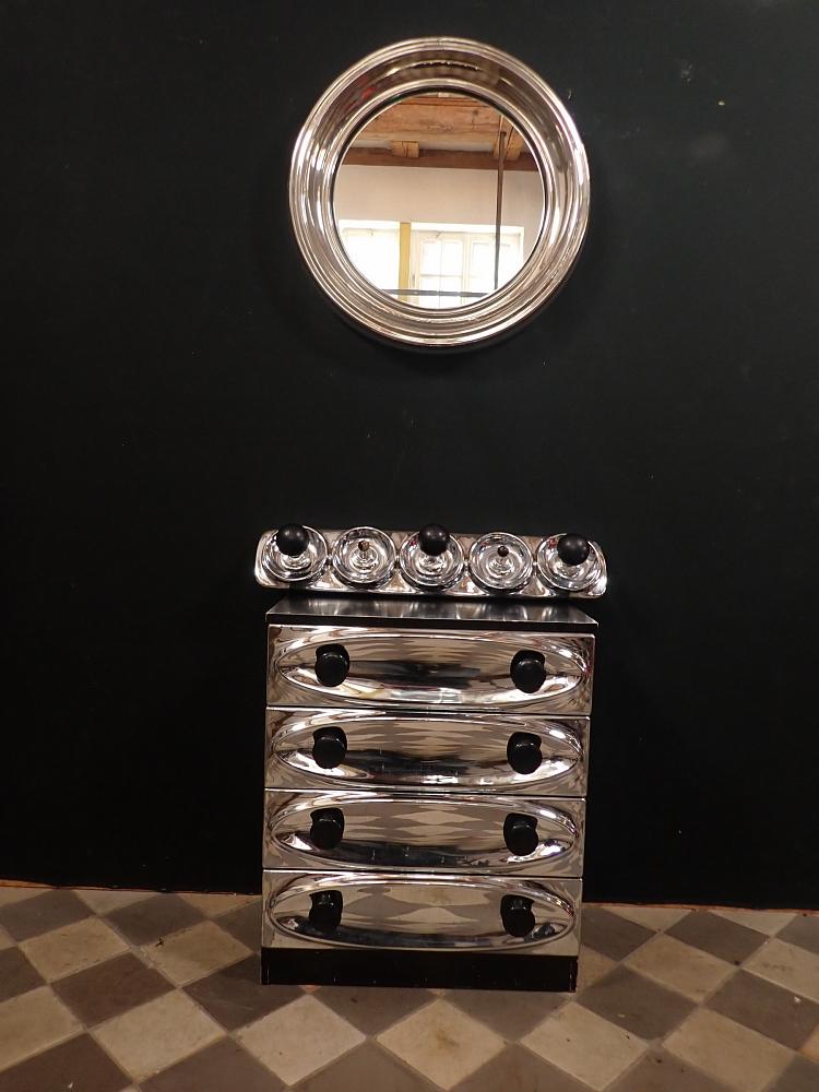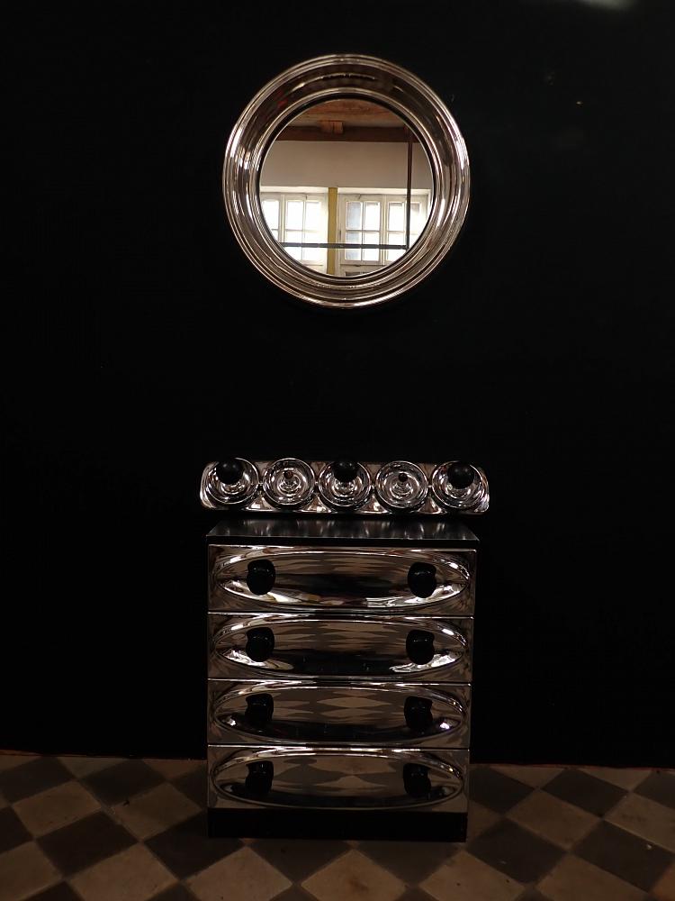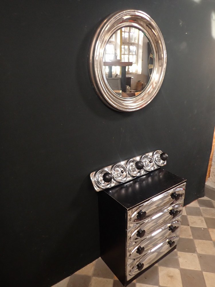 Das Garderobenset besteht aus einem runden Spiegel aus Fiberglas und Kunststoff, einer Garderobenleiste aus Kunststoff-Holz und einer Kommode aus schwarz lackiertem Holz mit einer Kunststoffschubladenfront.