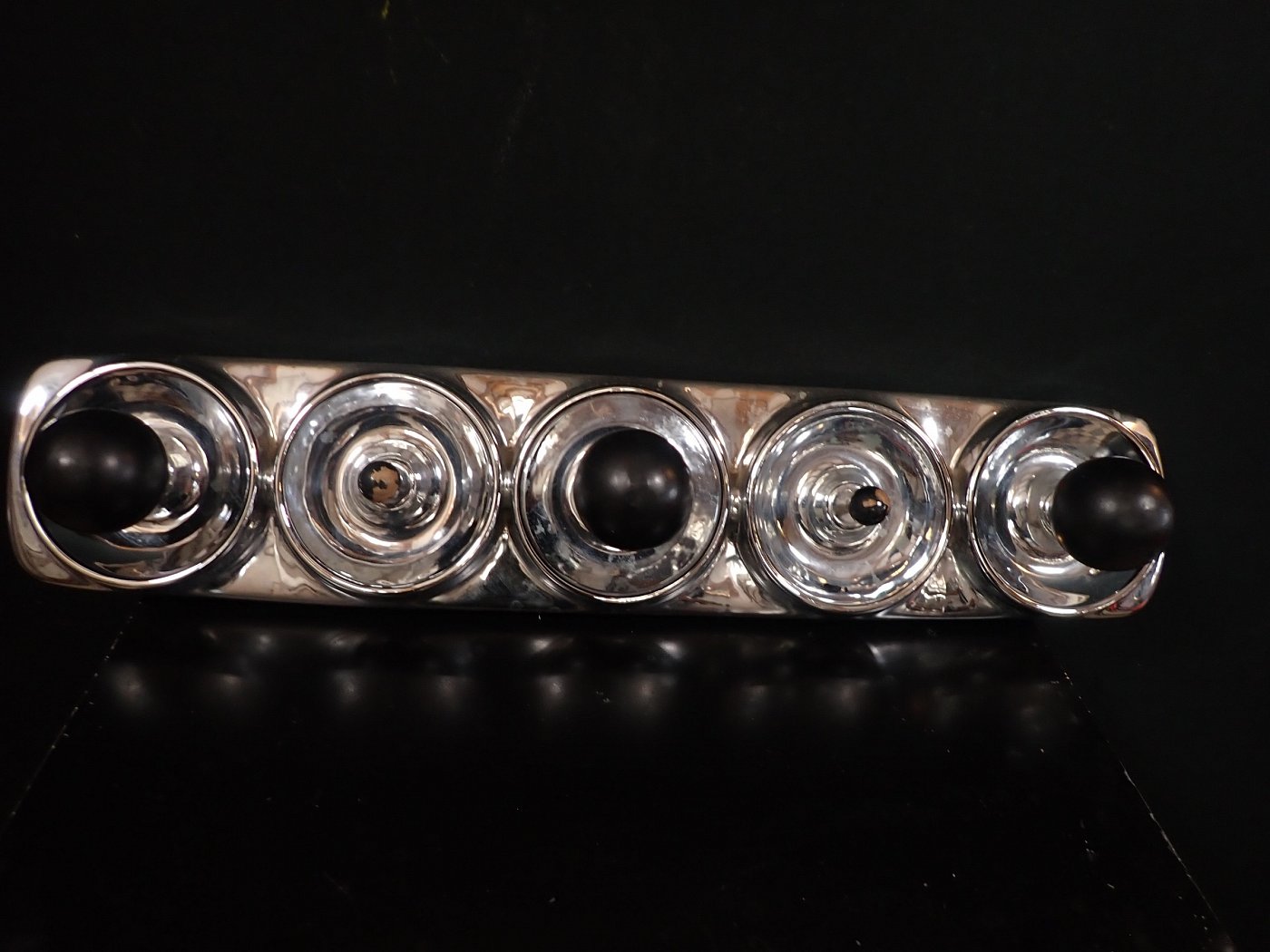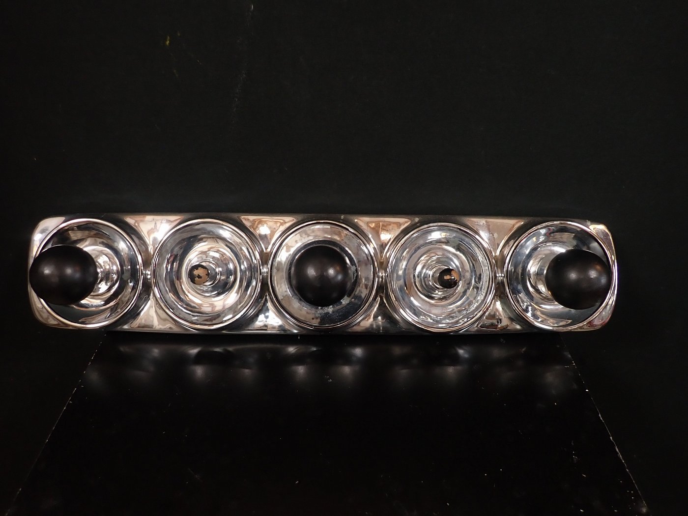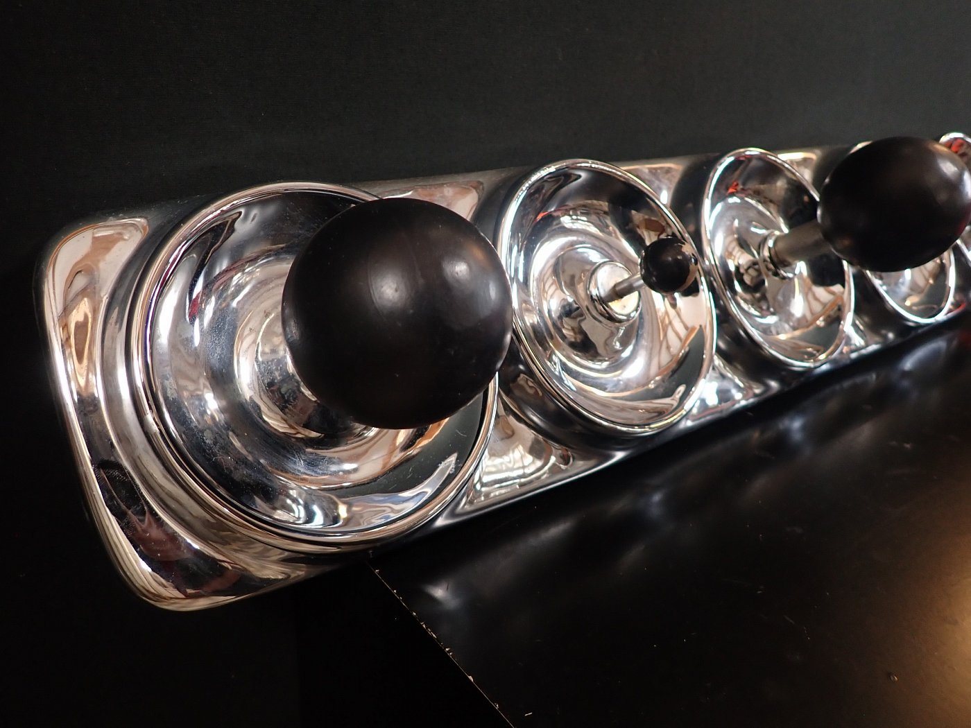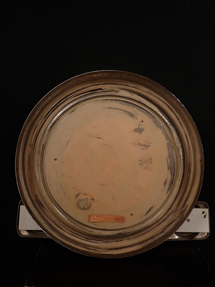 Das Garderobenset besteht aus einem runden Spiegel aus Fiberglas und Kunststoff, einer Garderobenleiste aus Kunststoff-Holz und einer Kommode aus schwarz lackiertem Holz mit einer Kunststoffschubladenfront.