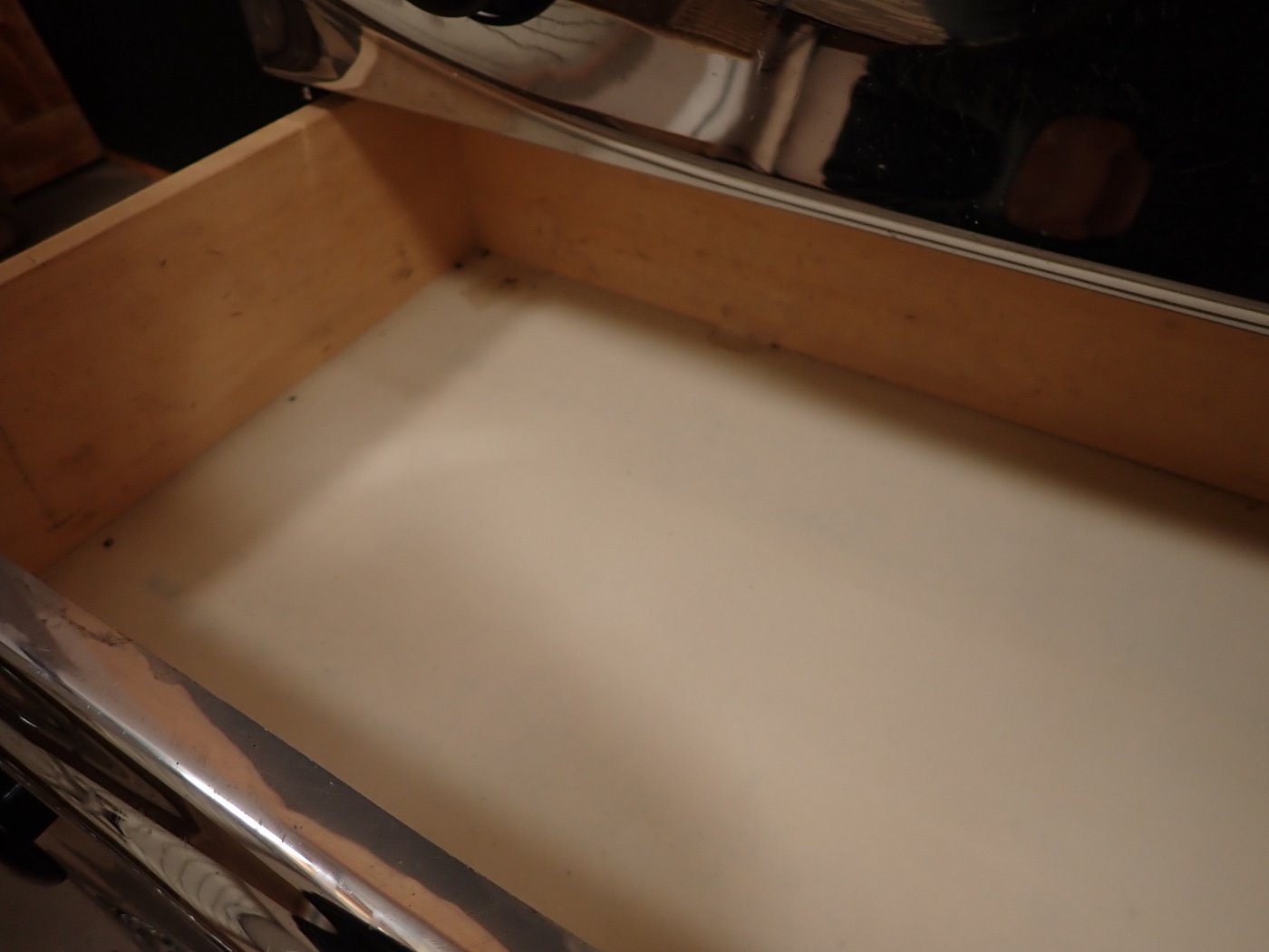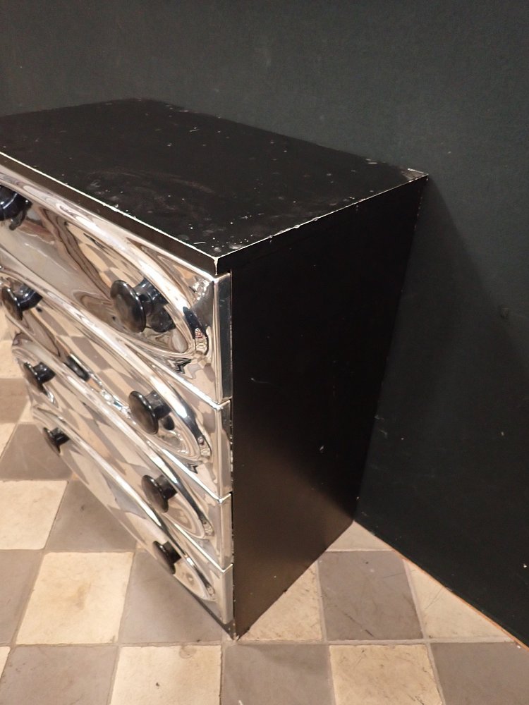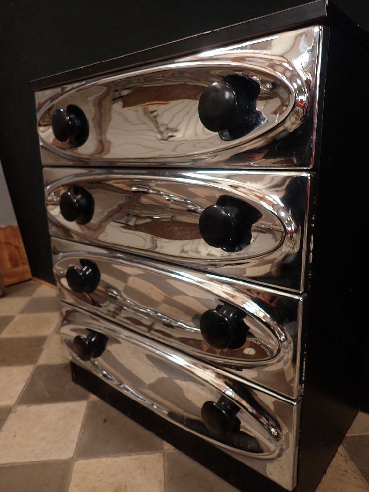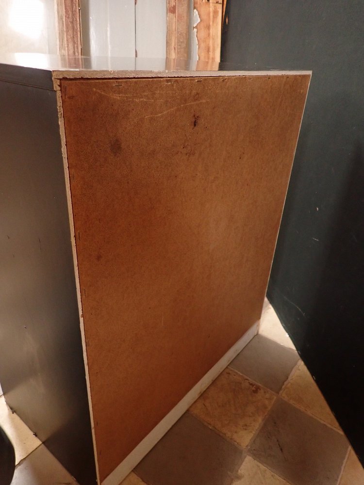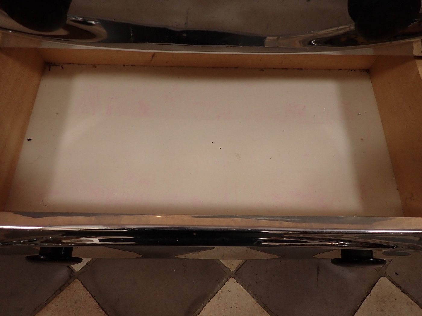 Auf der Ablagefläche der Kommode sind einige Gebrauchspuren zu erkennen. Die glänzenden Kunststoffschichten sind stellenweise angelaufen und haben Kratzer. In den Schubladen sind ebenfalls einige Gebrauchsspuren.