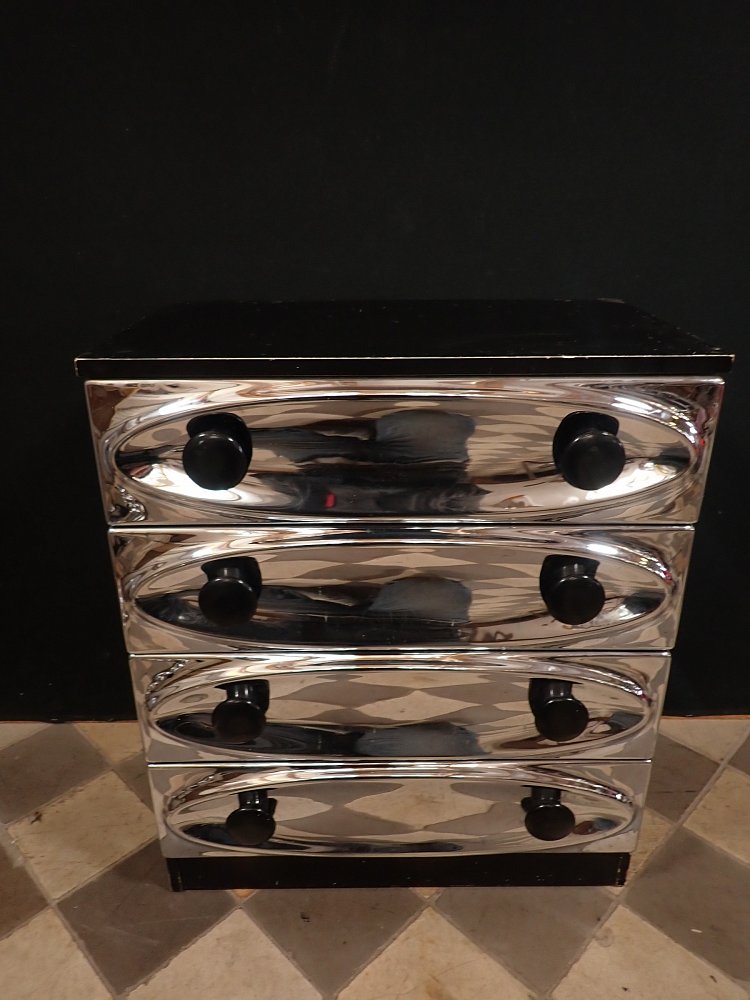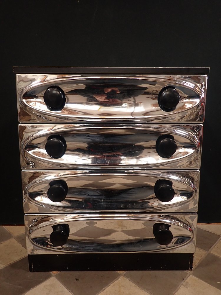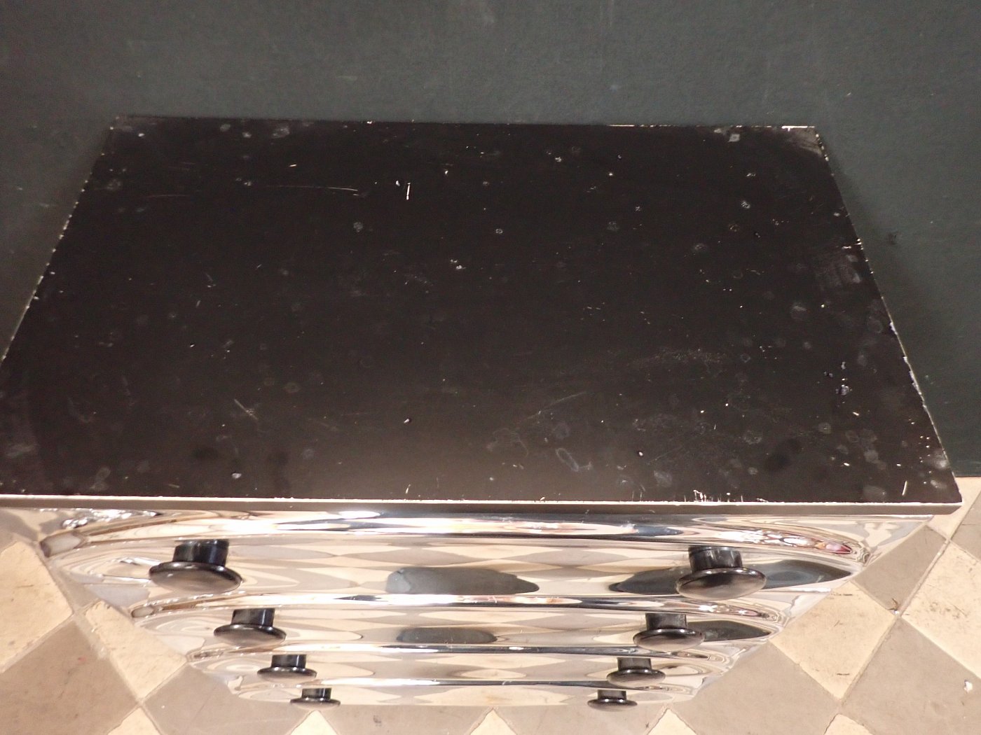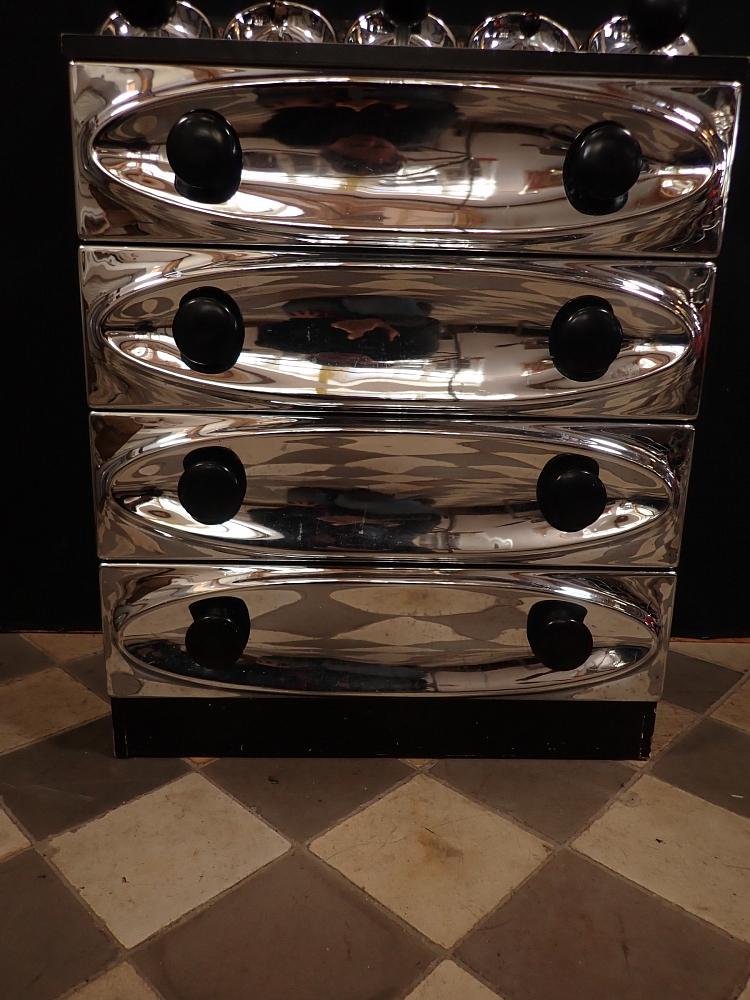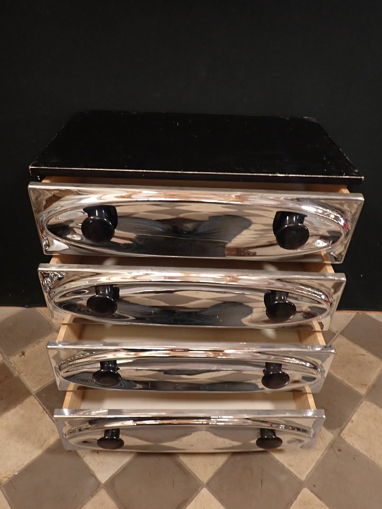 Auf der Ablagefläche der Kommode sind einige Gebrauchspuren zu erkennen. Die glänzenden Kunststoffschichten sind stellenweise angelaufen und haben Kratzer. In den Schubladen sind ebenfalls einige Gebrauchsspuren.