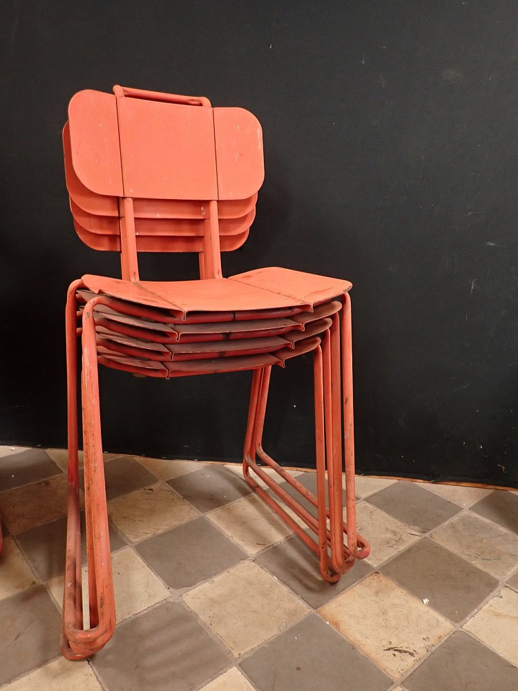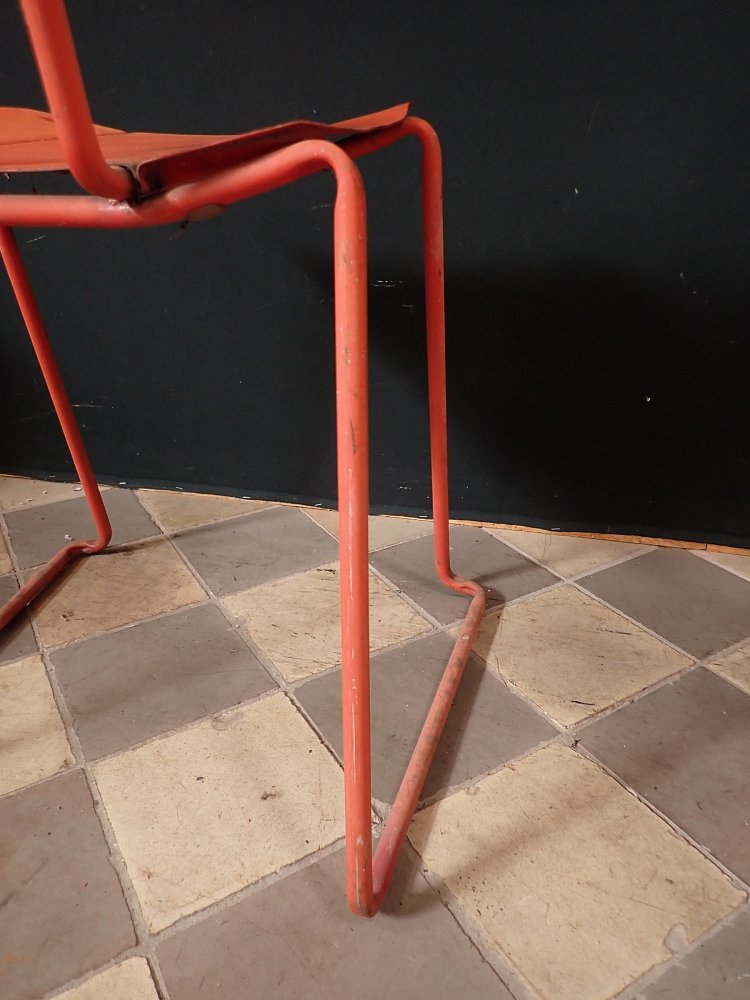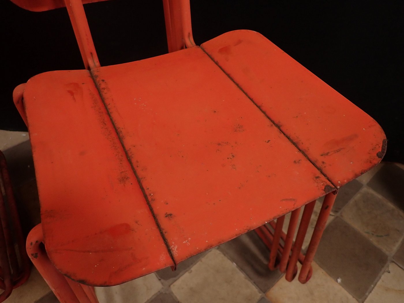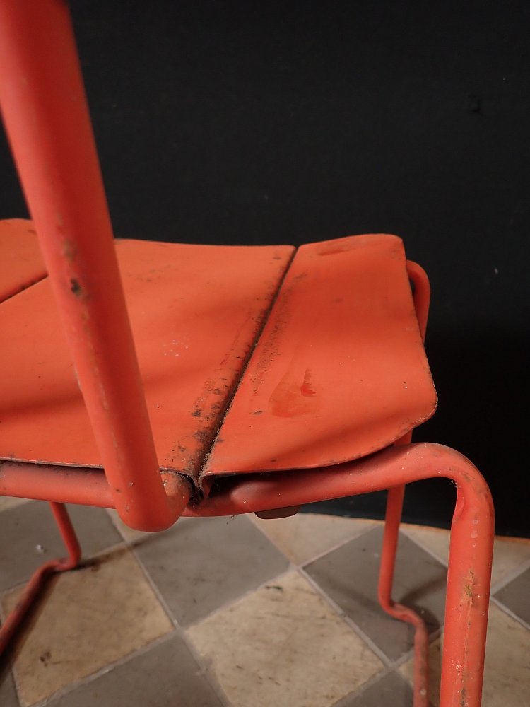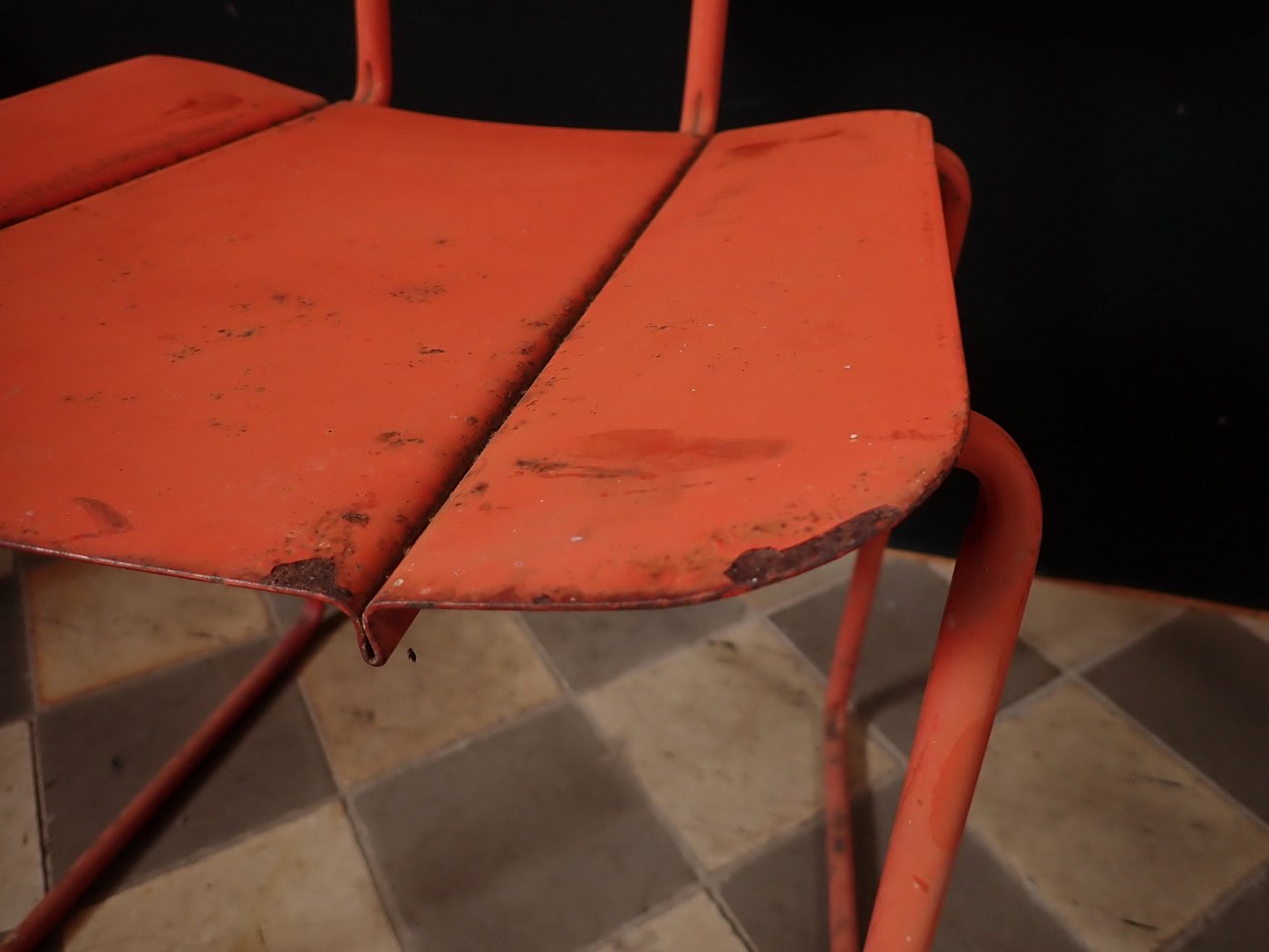 Insgesamt befinden sich die Stühle in einem soliden Zustand, auch wenn die orangefarbene bzw. ursprünglich vermutlich rote Lackierung ziemlich ausgeblichen ist und einige Roststellen aufweist.