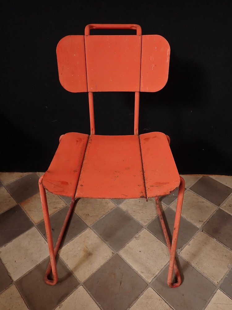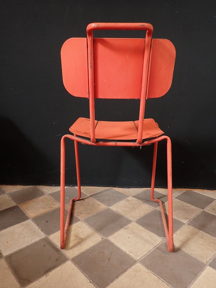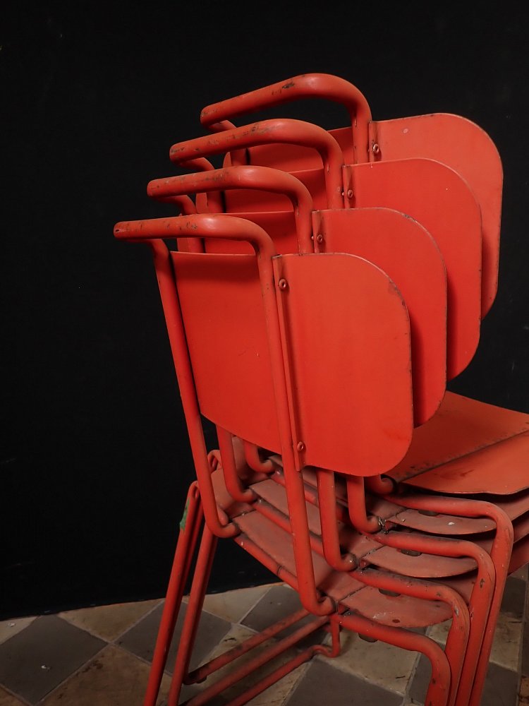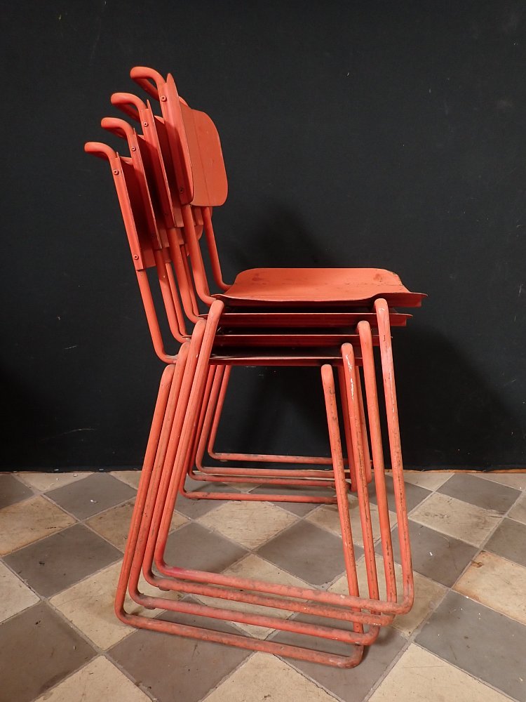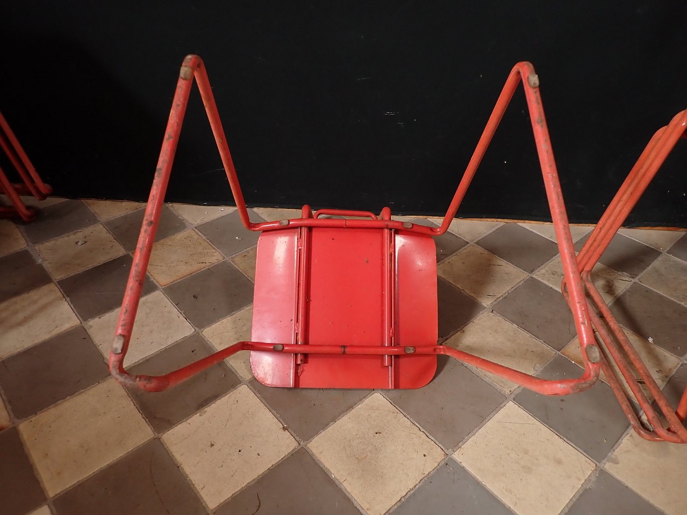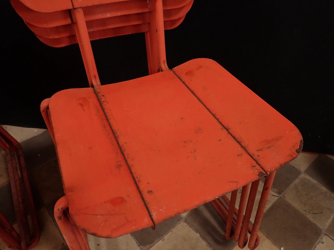 Insgesamt befinden sich die Stühle in einem soliden Zustand, auch wenn die orangefarbene bzw. ursprünglich vermutlich rote Lackierung ziemlich ausgeblichen ist und einige Roststellen aufweist.