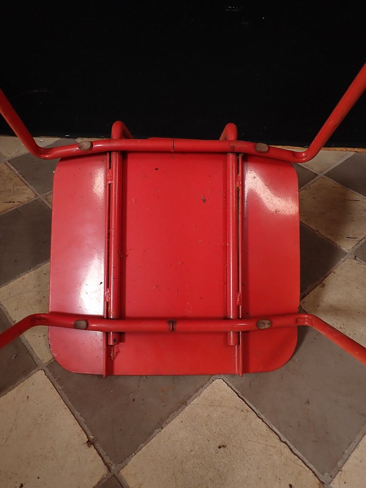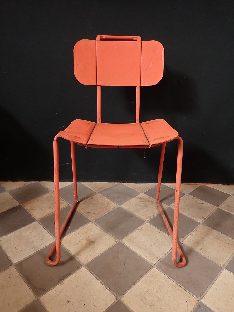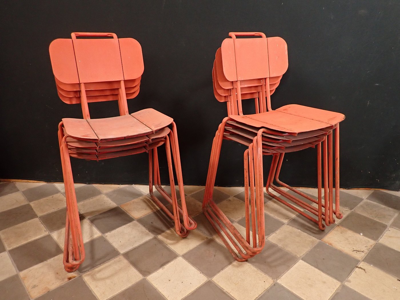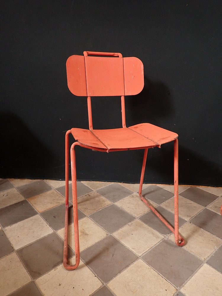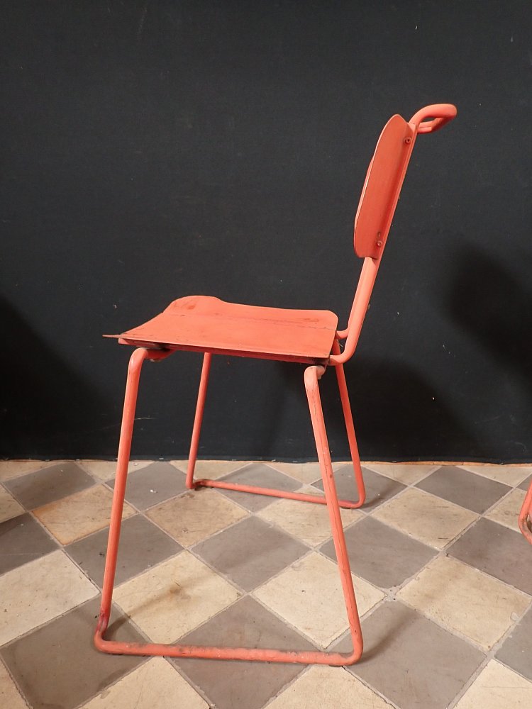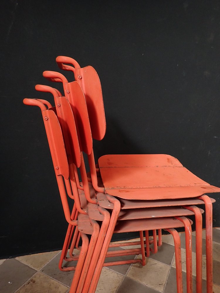 Insgesamt befinden sich die Stühle in einem soliden Zustand, auch wenn die orangefarbene bzw. ursprünglich vermutlich rote Lackierung ziemlich ausgeblichen ist und einige Roststellen aufweist.