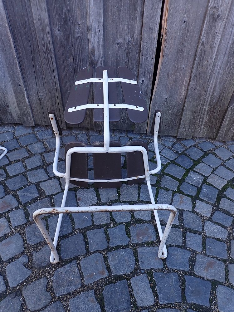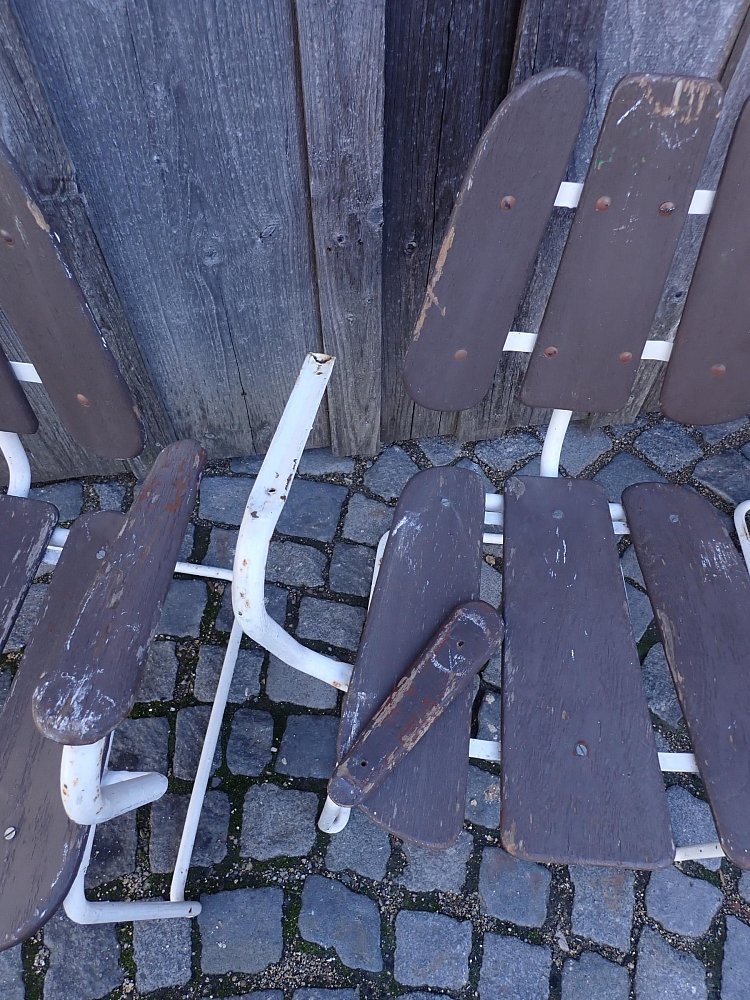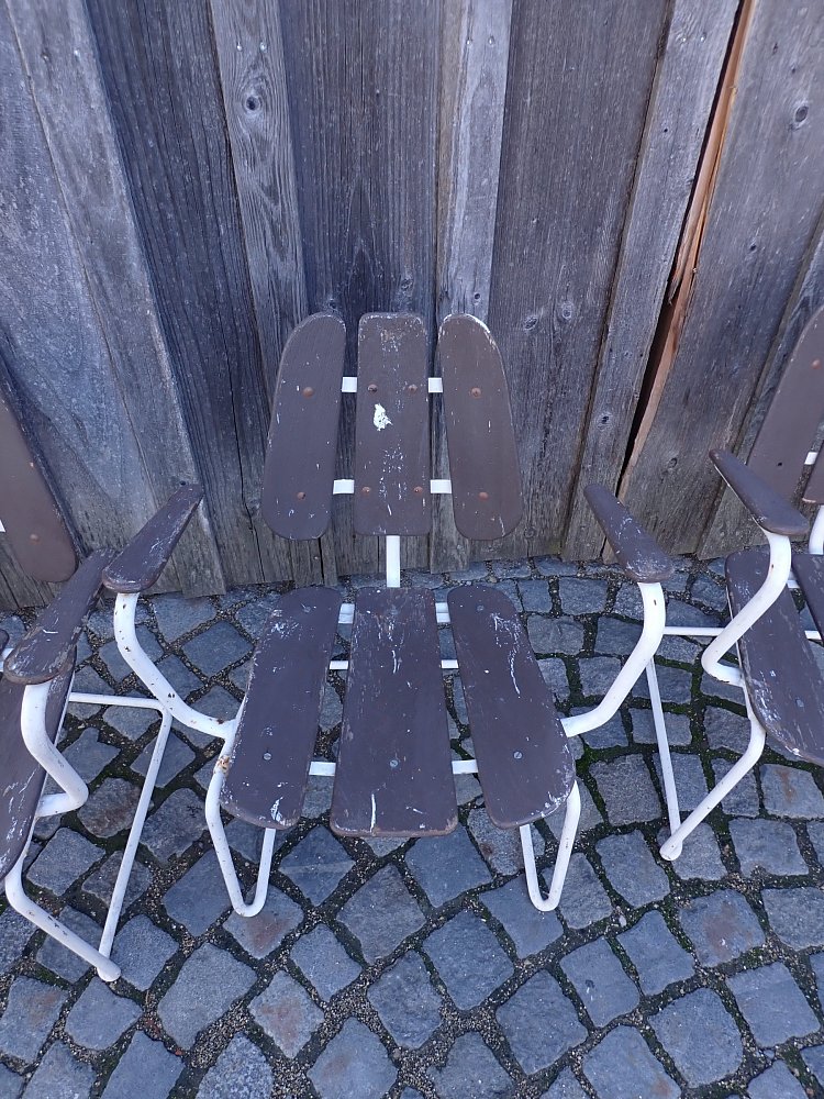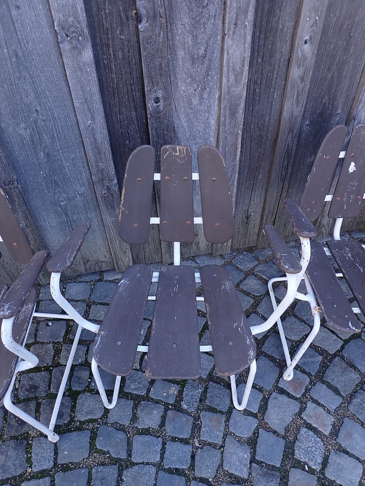 Aktuell befinden sich die Stühle in einem intensiv genutzten Zustand und brauchen dringend einige Arbeitsstunden Zuwendung, bevor sie wieder zum Einsatz kommen, doch die Grundsubstanz ist nach wie vor gut. Die fehlenden Schrauben können im Rahmen einer Überarbeitung ersetzt werden und die Holzteile sind alle vorhanden.