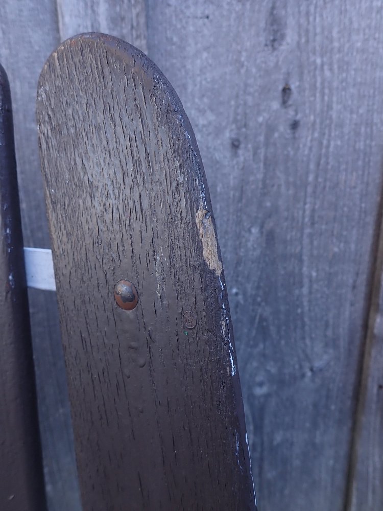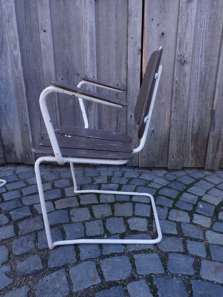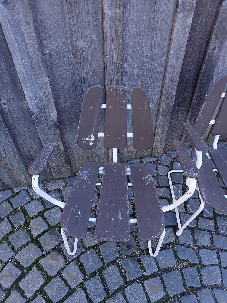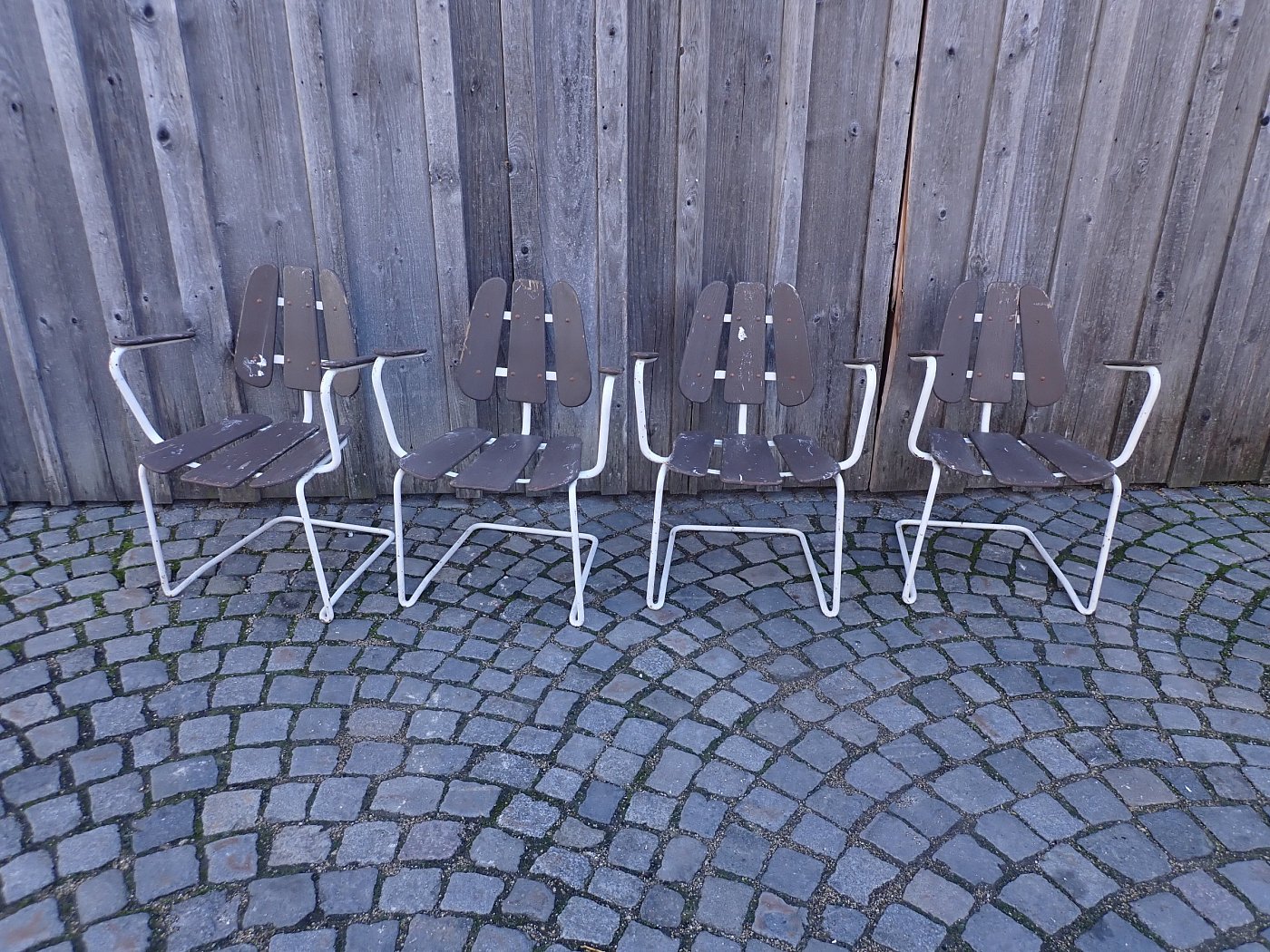 Aktuell befinden sich die Stühle in einem intensiv genutzten Zustand und brauchen dringend einige Arbeitsstunden Zuwendung, bevor sie wieder zum Einsatz kommen, doch die Grundsubstanz ist nach wie vor gut. Die fehlenden Schrauben können im Rahmen einer Überarbeitung ersetzt werden und die Holzteile sind alle vorhanden.