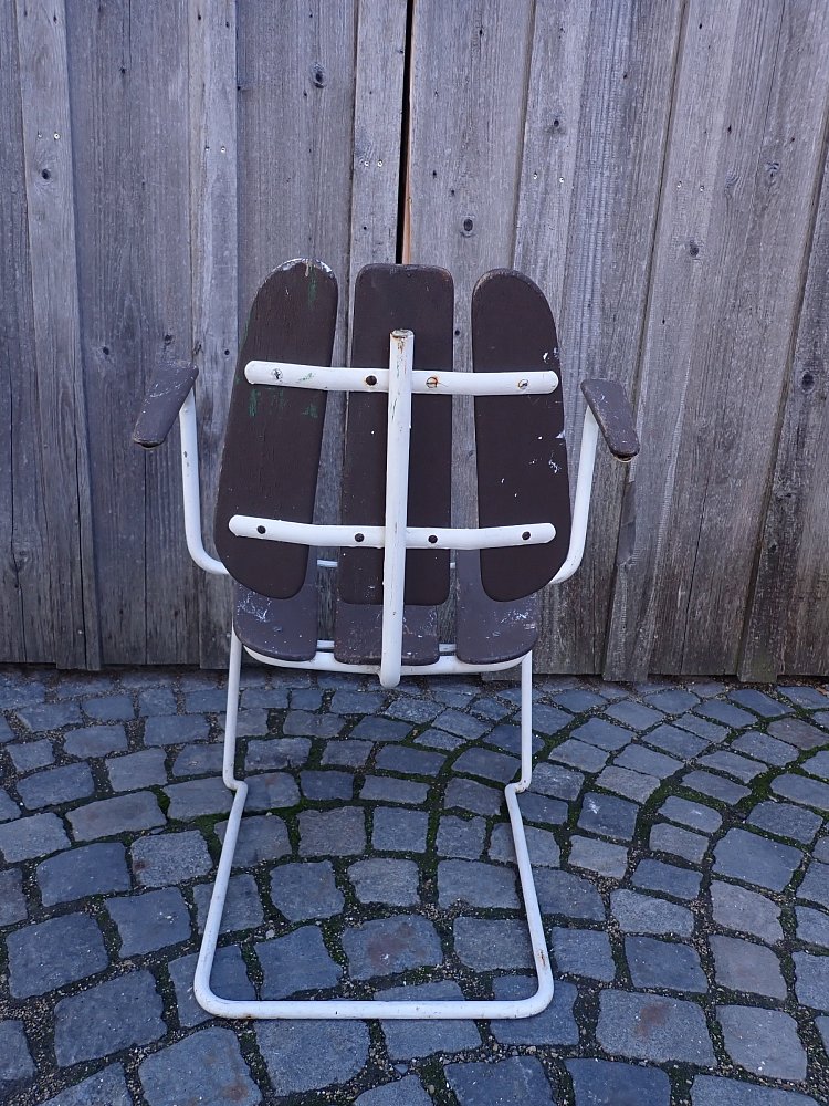 In Werbeprospekten aus den 50-er Jahren, welche online zu finden sind, ist zu lesen, dass die weiß lackierten Eisengestelle mit geölten Teakholzelementen ausgestattet sind.