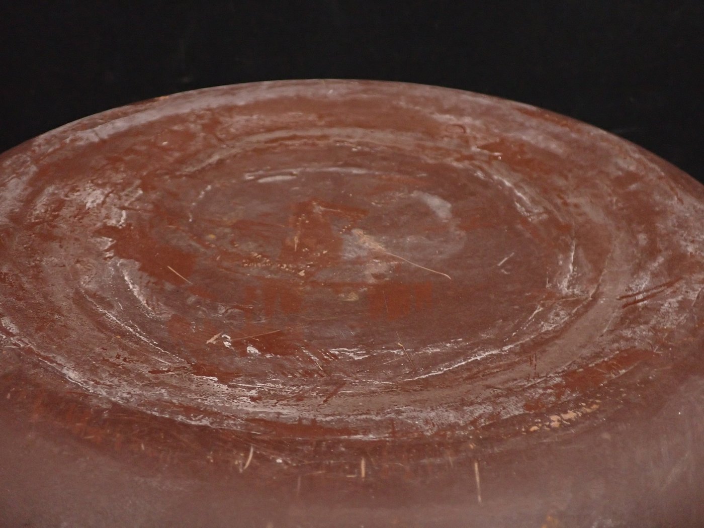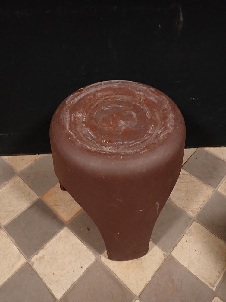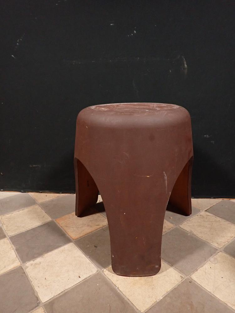 Der dreibeinige Hocker ist aus einem Stück gegossen und auf der Außenseite braun lackiert.
