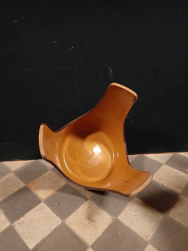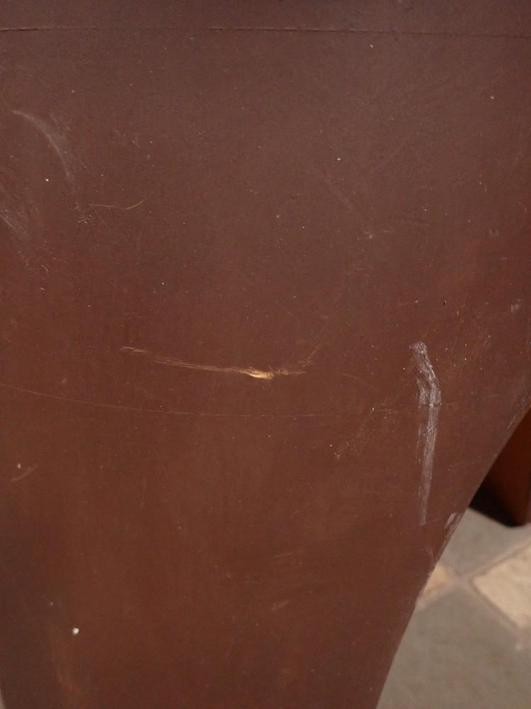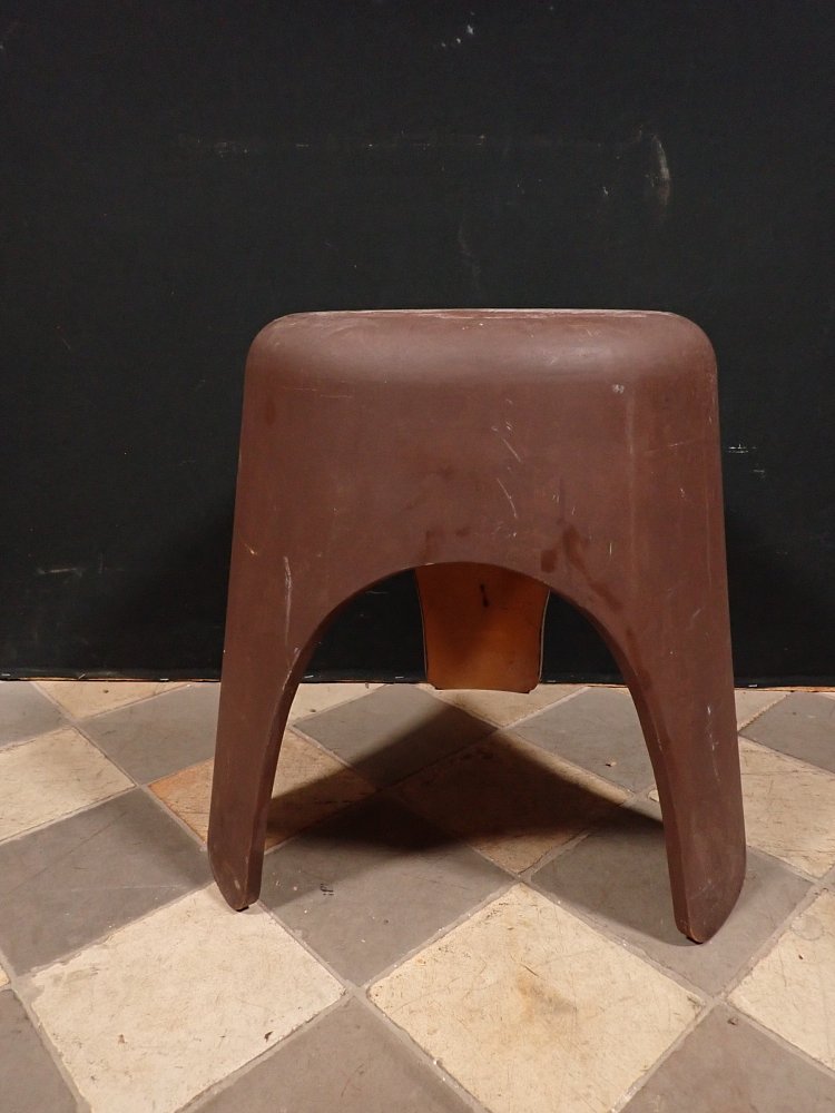 DetailansichtKleiner Hocker aus Kunststoff. Der dreibeinige Hocker ist aus einem Stück gegossen und auf der Außenseite braun lackiert. Insgesamt befindet sich der Hocker...