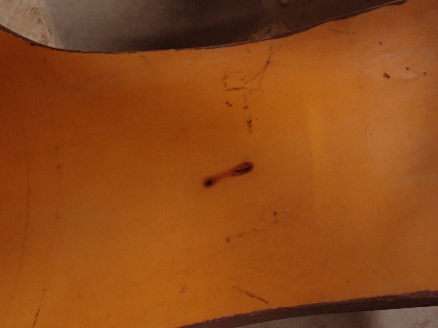 Insgesamt befindet sich der Hocker in einem guten Gesamtzustand, lediglich die Sitzfläche ist stark verschmutzt und freut sich vor einer weiteren Nutzung über eine sorgfältige aber gründliche Reinigung.