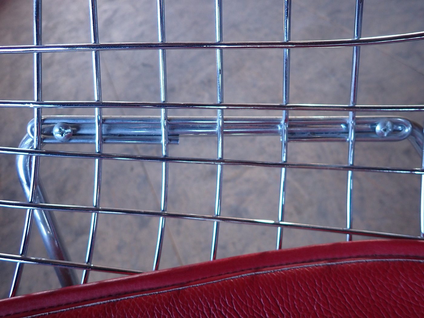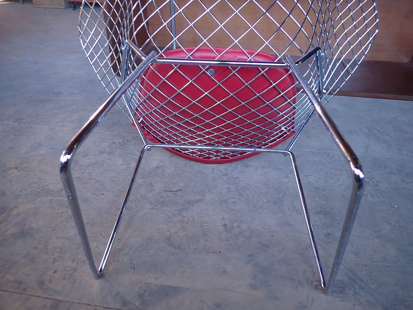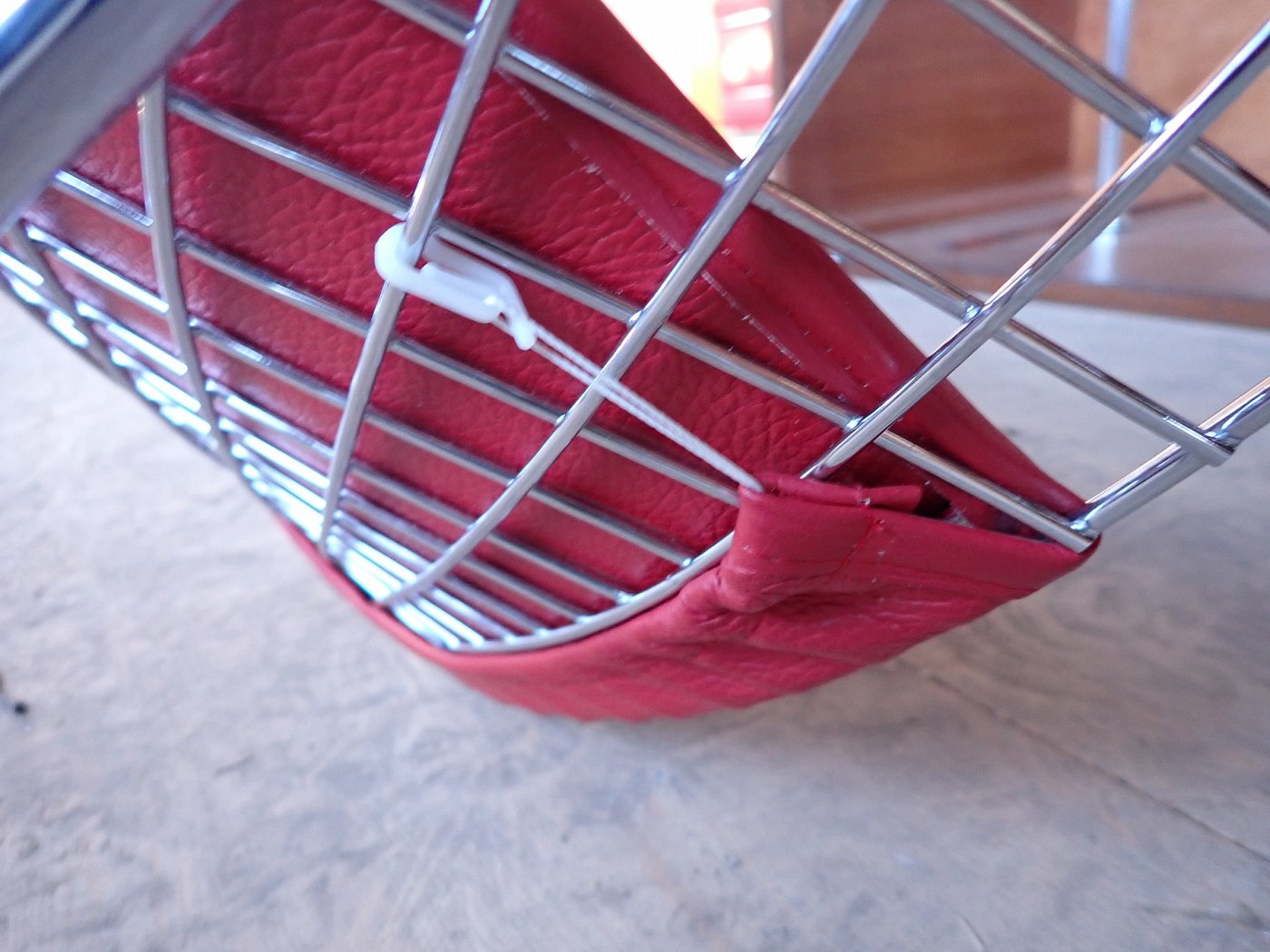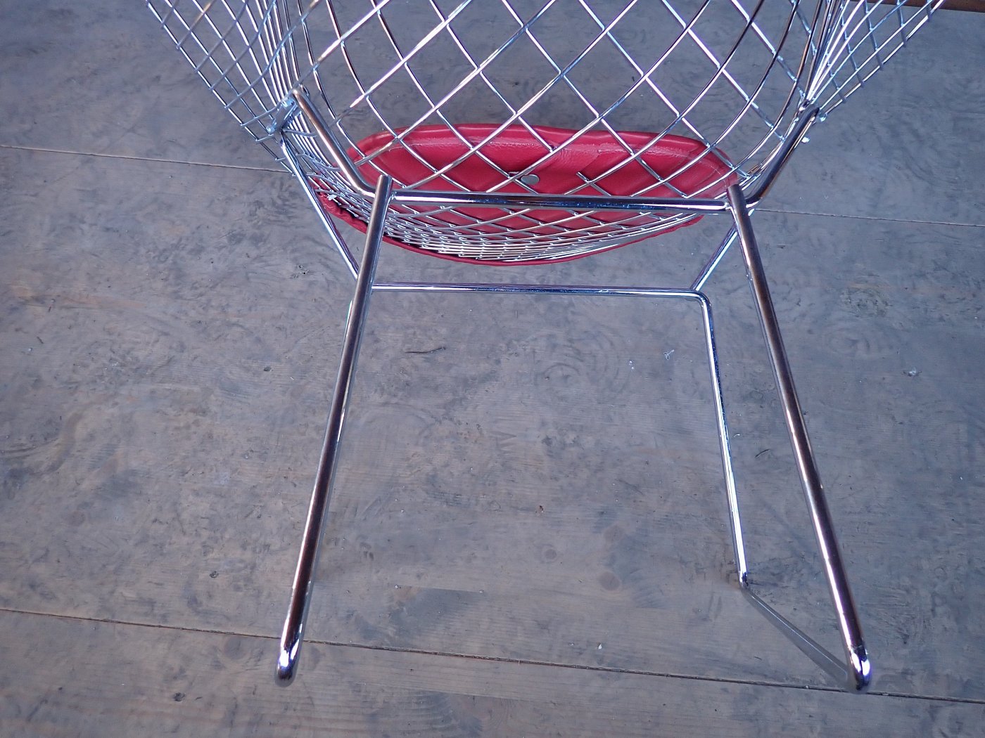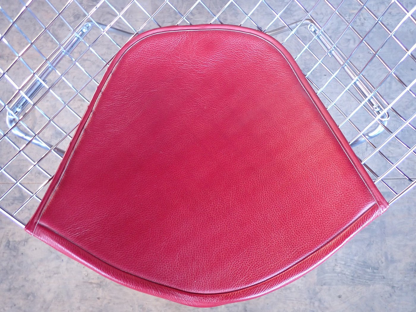 DetailansichtDer Stuhl ist im Stile des Diamond Chairs des Designers Bertoia, allerdings ist dieser Stuhl vermutlich kein Original. Das Gestell aus Metallgitter und die Ledersitzfläche lassen sich einfach voneinander trennen und ist somit flexibel und individuell nutzbar.