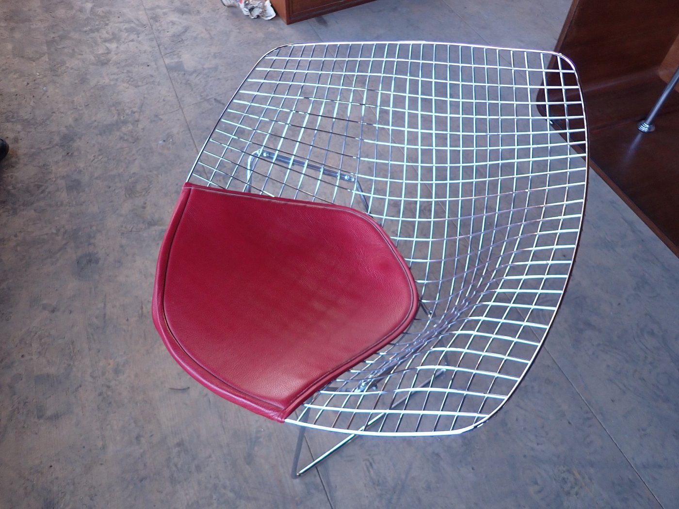 DetailansichtDer Stuhl ist im Stile des Diamond Chairs des Designers Bertoia, allerdings ist dieser Stuhl vermutlich kein Original. Das Gestell aus Metallgitter und die Ledersitzfläche...