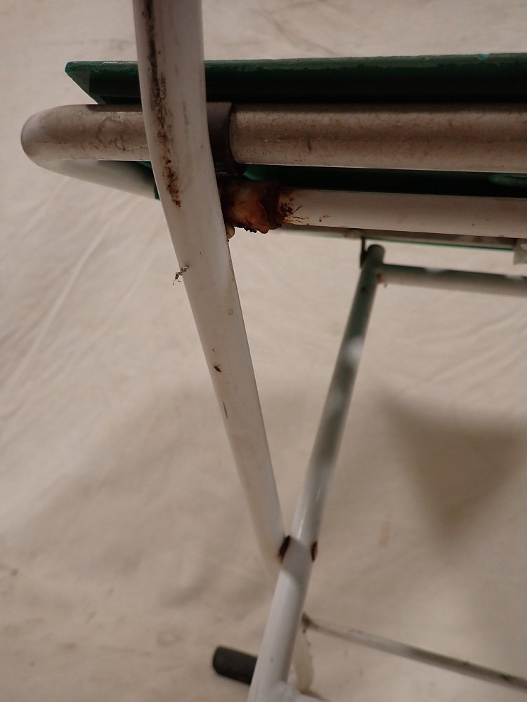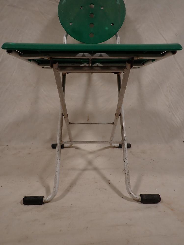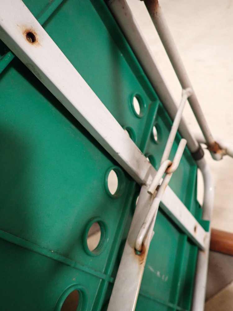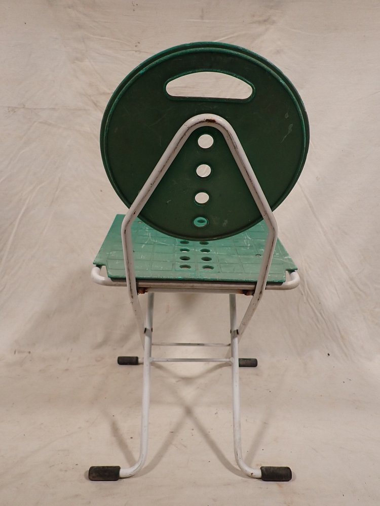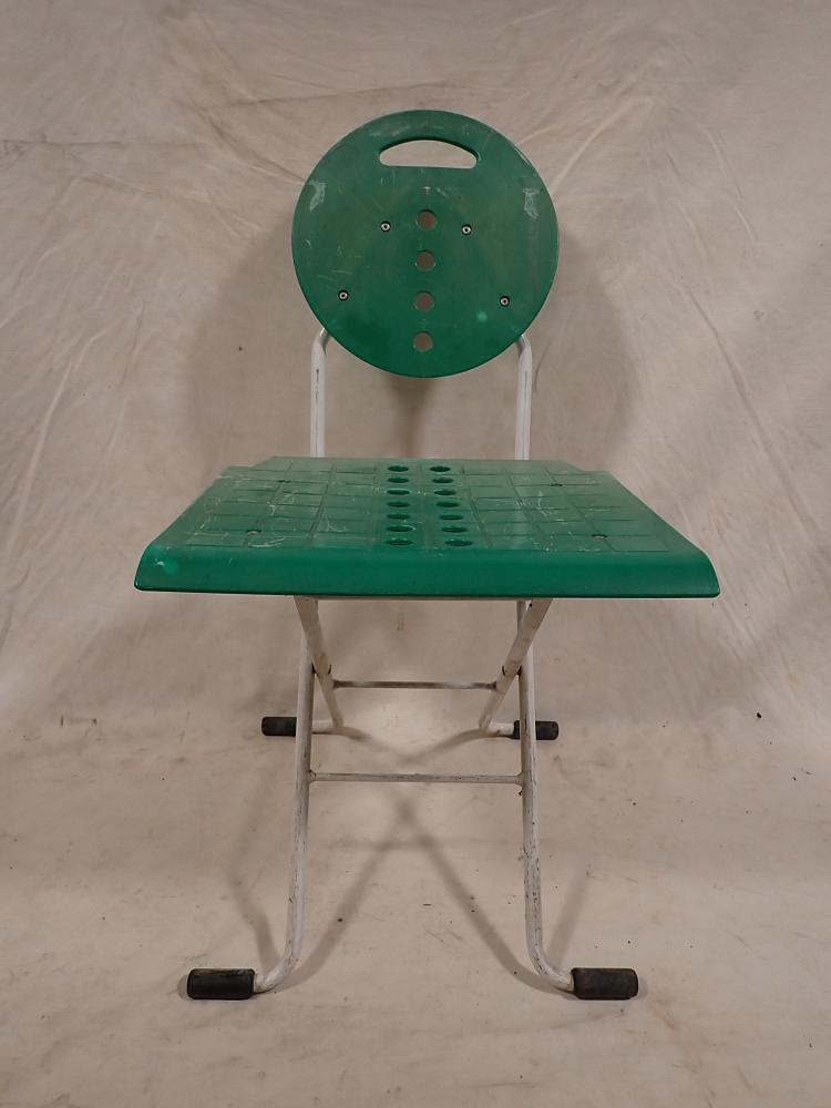 Der Klappstuhl hat ein Metallgestell und eine Kunststoffsitzfläche und Lehne. An den vier Fußenden ist ein Gummigleiter, um Kratzer im Boden zu vermeiden. Zusammengeklappt...