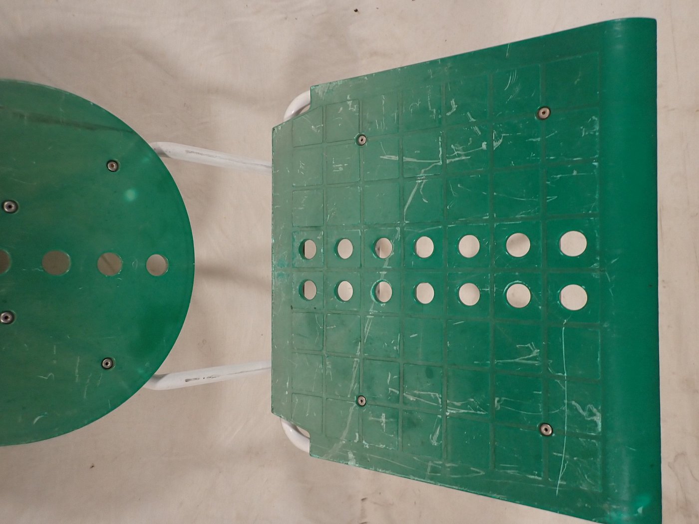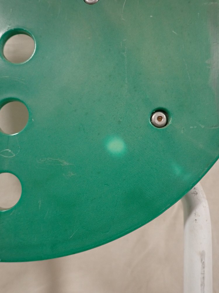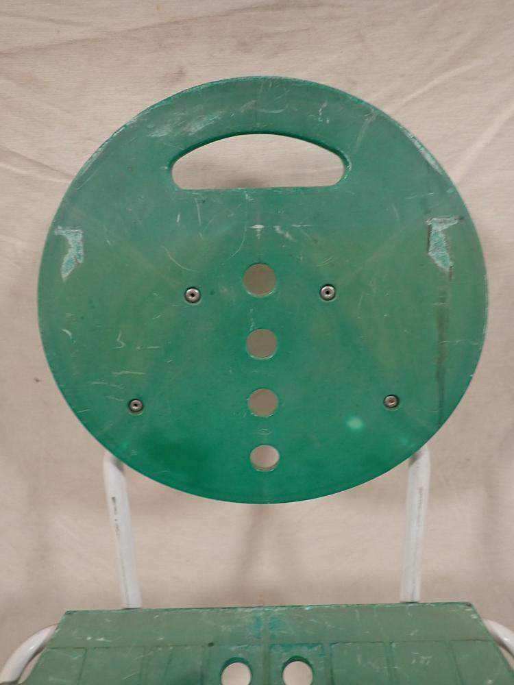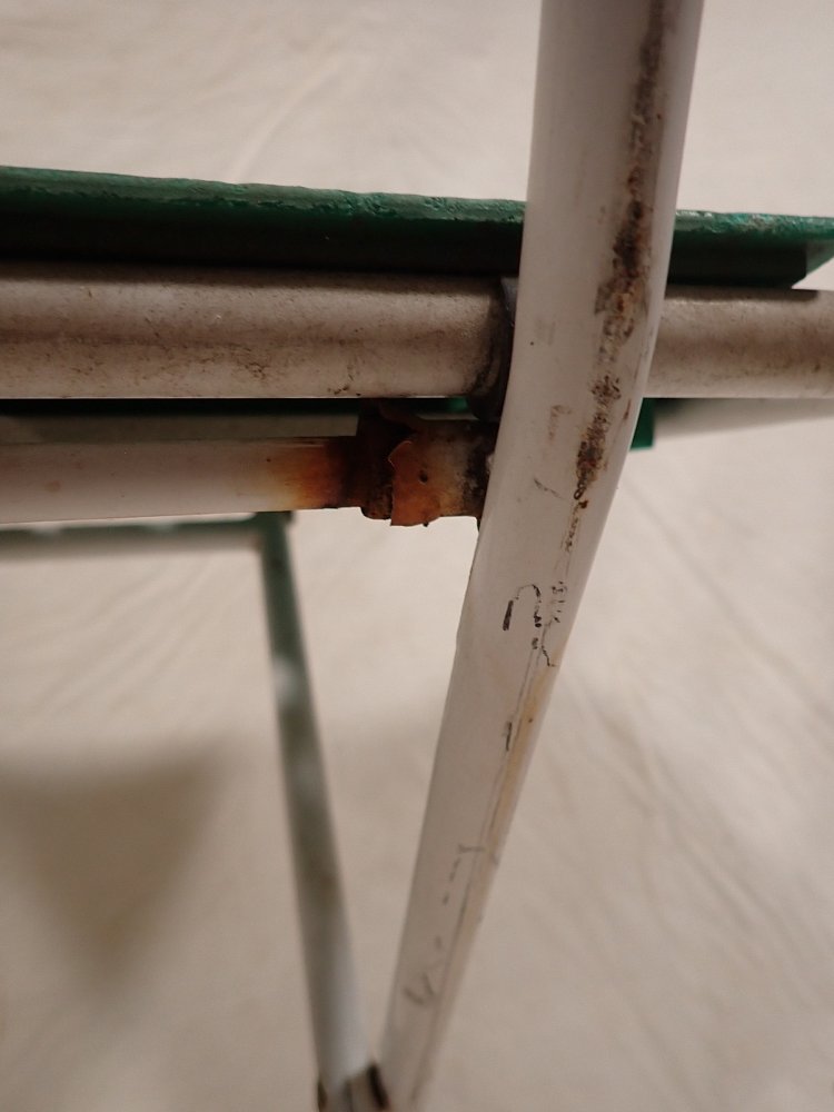 Der Klappstuhl hat ein Metallgestell und eine Kunststoffsitzfläche und Lehne. An den vier Fußenden ist ein Gummigleiter, um Kratzer im Boden zu vermeiden. Zusammengeklappt...