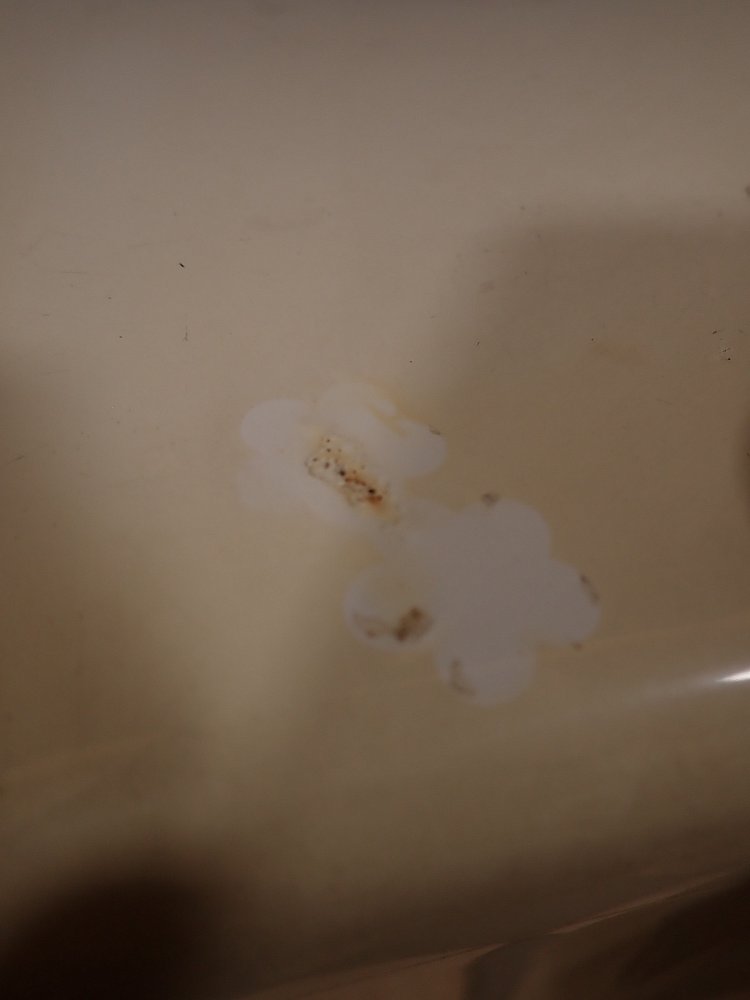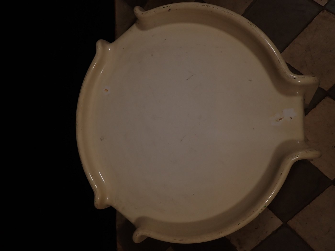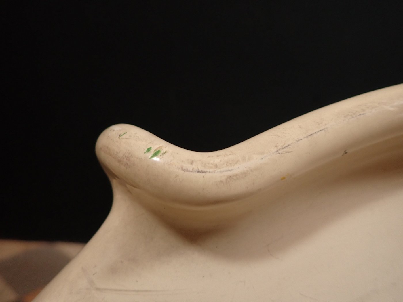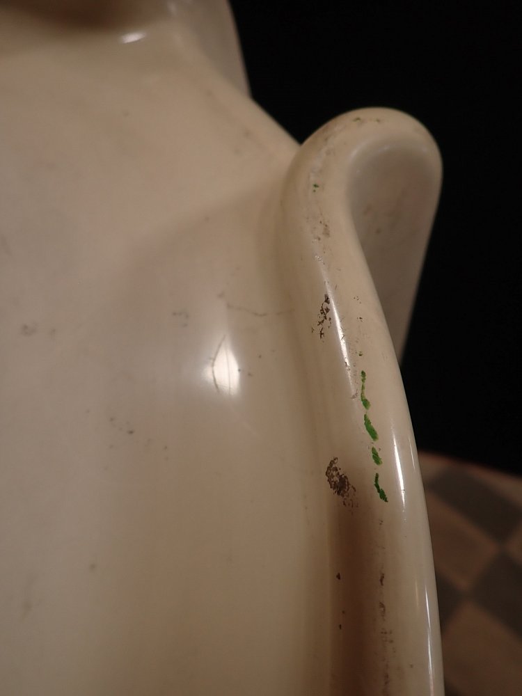 Die weiße Farbe ist über die Jahre zu einem cremeweiße mit gelblichen Stellen ausgeblichen. Es sind zwei kleine Brandstellen zu erkennen diese wurden mit Blumenaufklebern überdeckt und haben ein weißes Blumenmuster hinterlassen. Auf der Unterseite ist der Beistelltisch gemarkt.