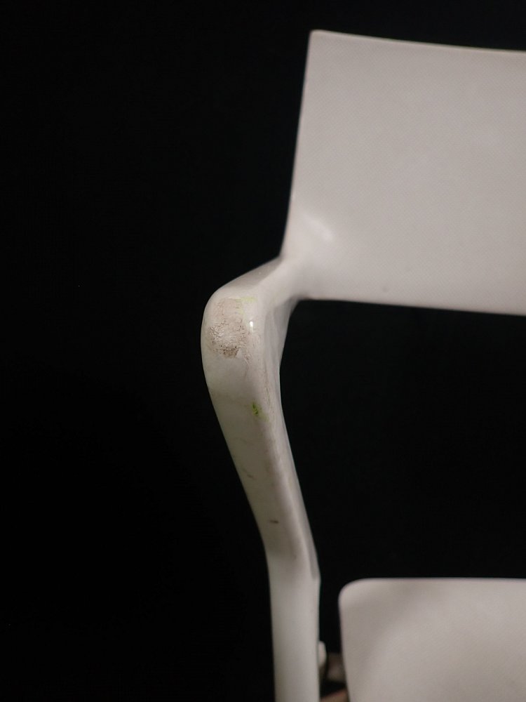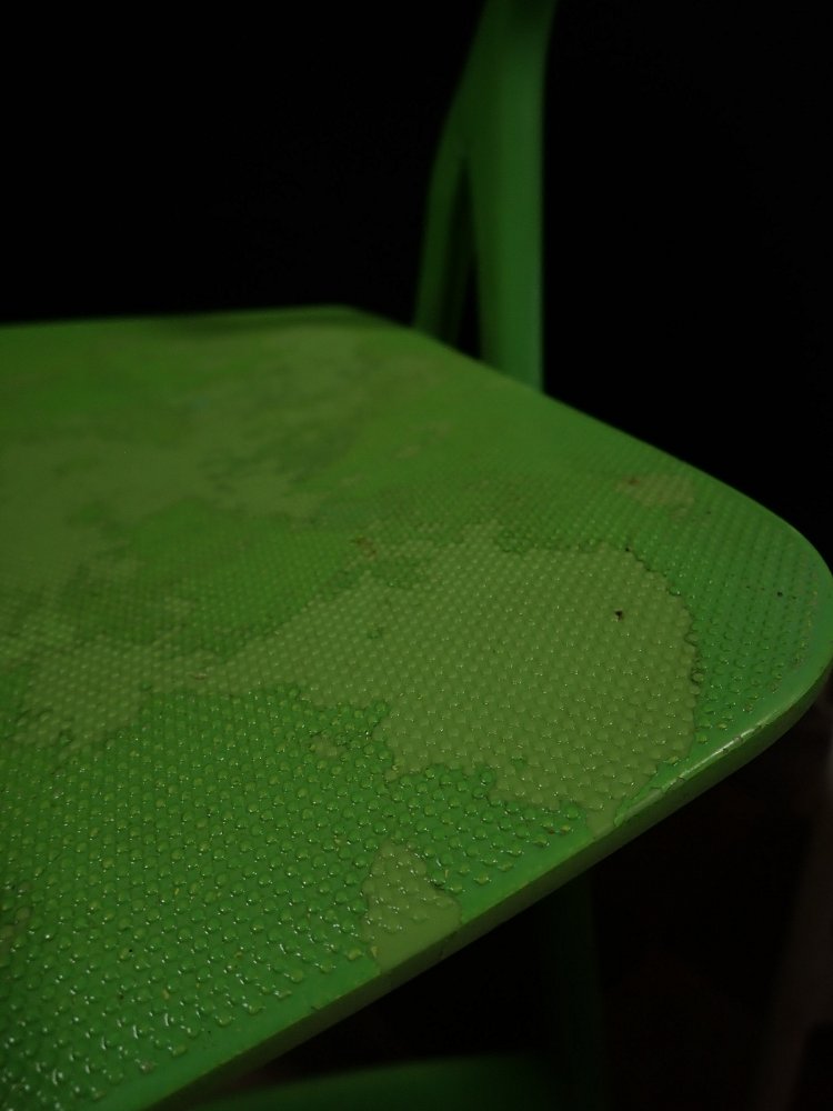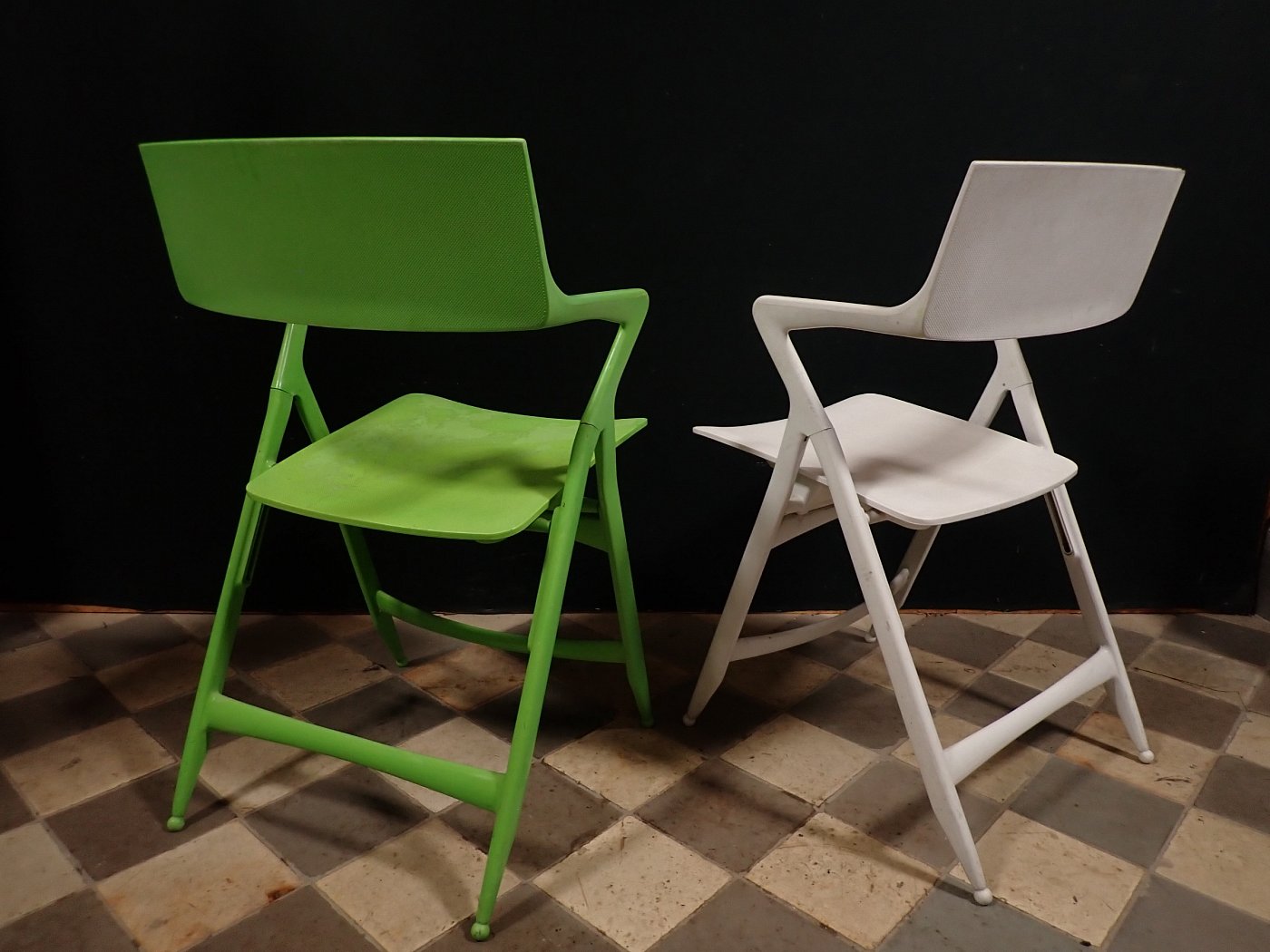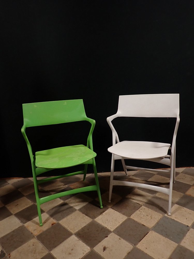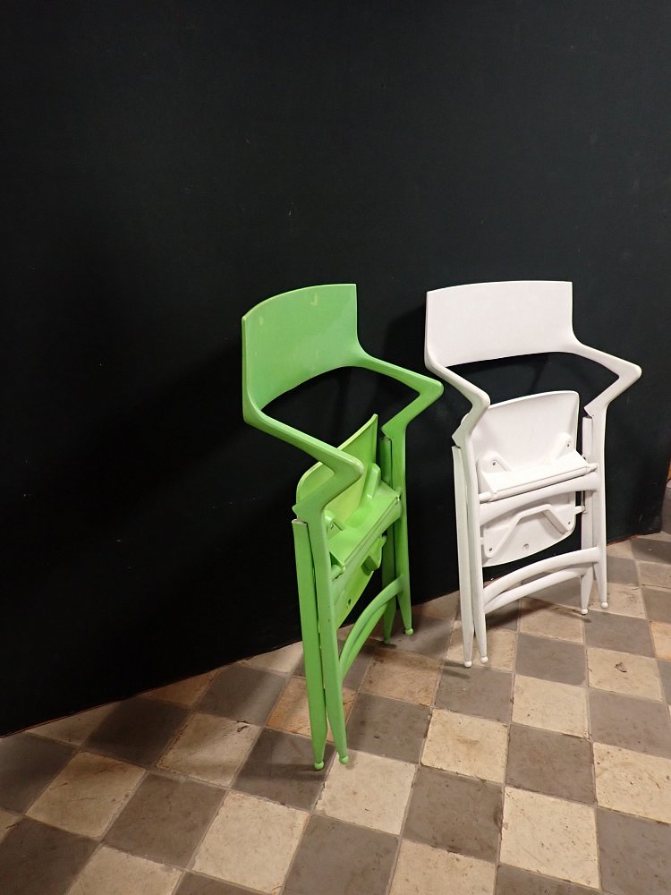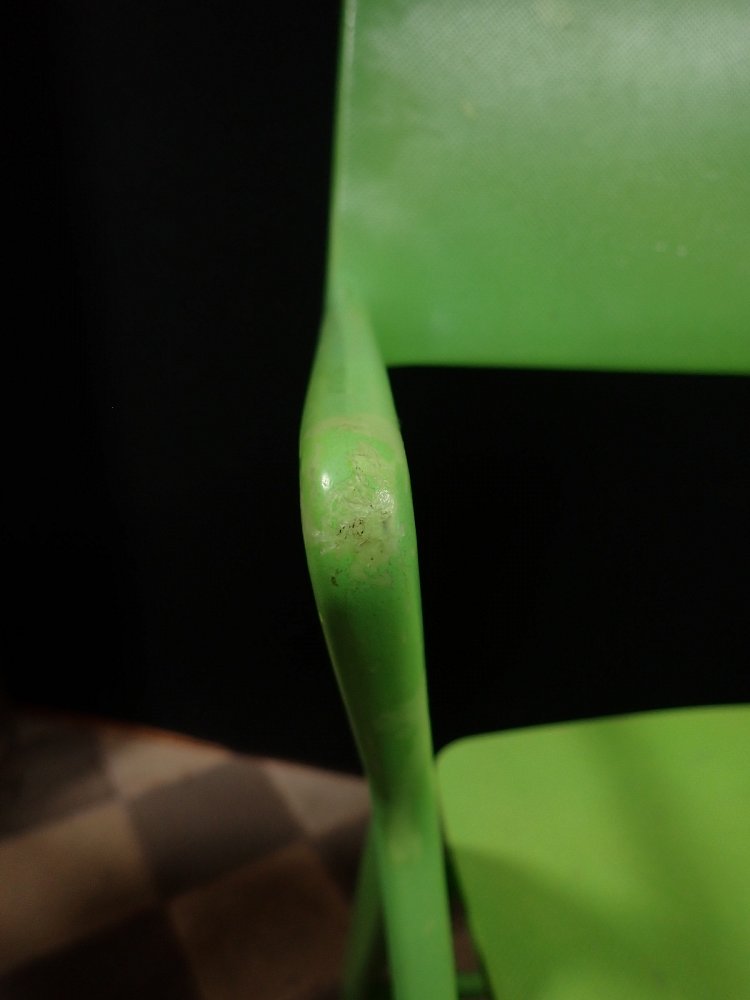 Leider löst sich an dem grünen Stuhl die oberste Kunststoffschicht an einigen Stellen etwas ab. Der weiße Stuhl befindet sich dagegen in einem sehr guten Zustand und braucht vor einer weiteren Nutzung lediglich eine gründliche Reinigung.