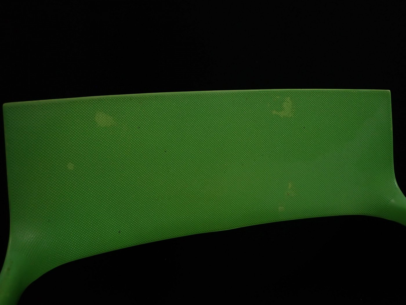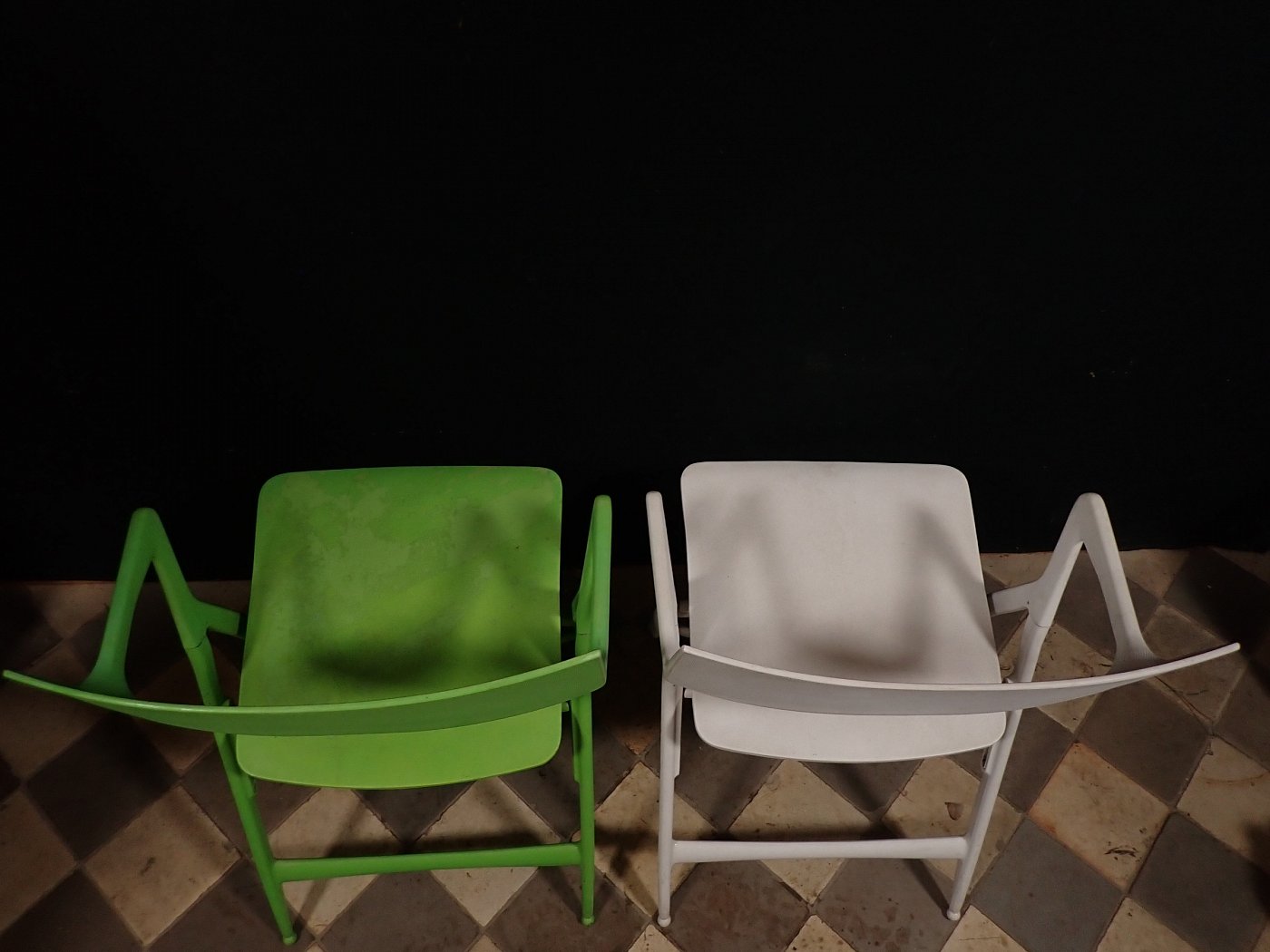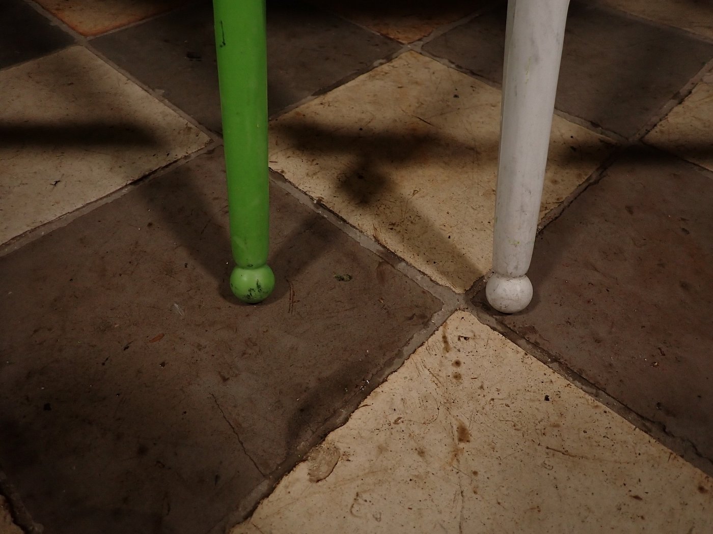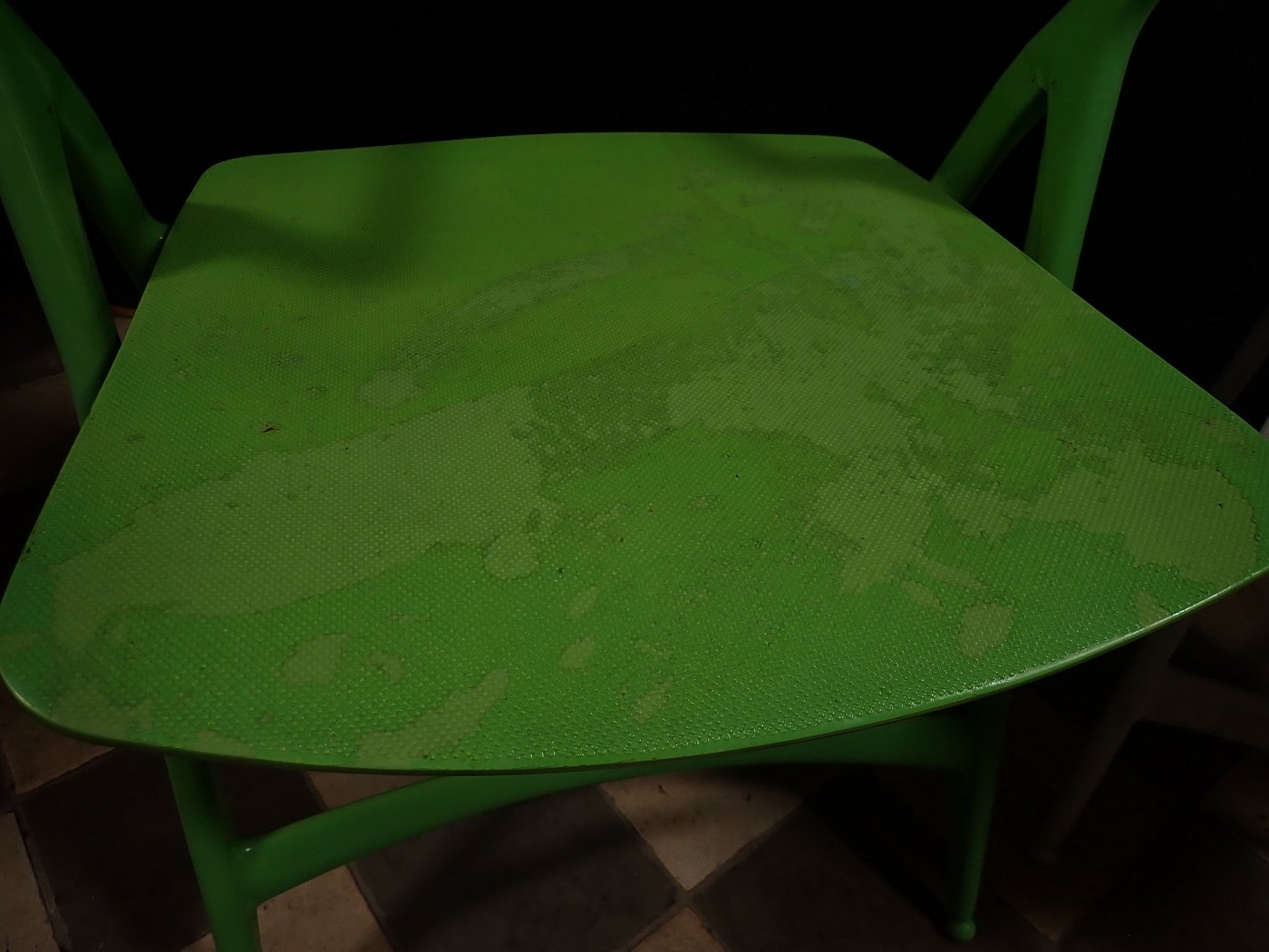 Leider löst sich an dem grünen Stuhl die oberste Kunststoffschicht an einigen Stellen etwas ab. Der weiße Stuhl befindet sich dagegen in einem sehr guten Zustand und braucht vor einer weiteren Nutzung lediglich eine gründliche Reinigung.