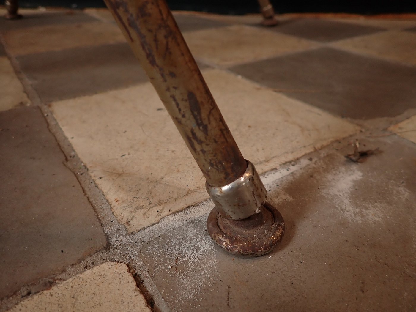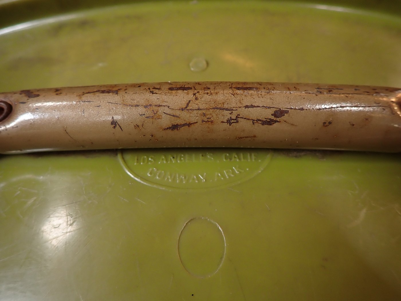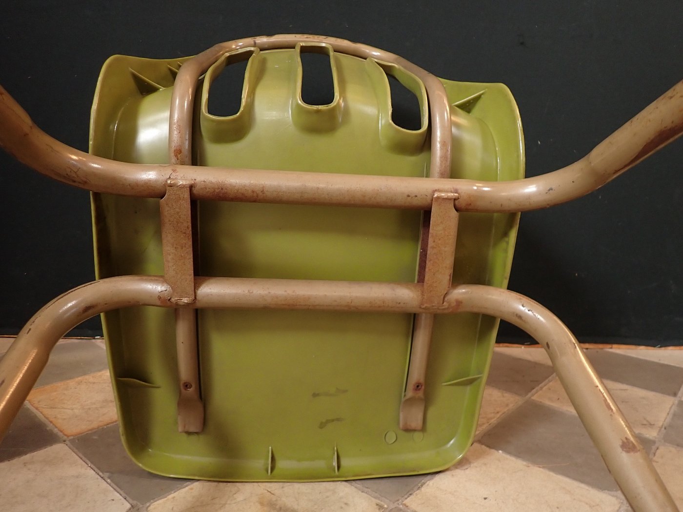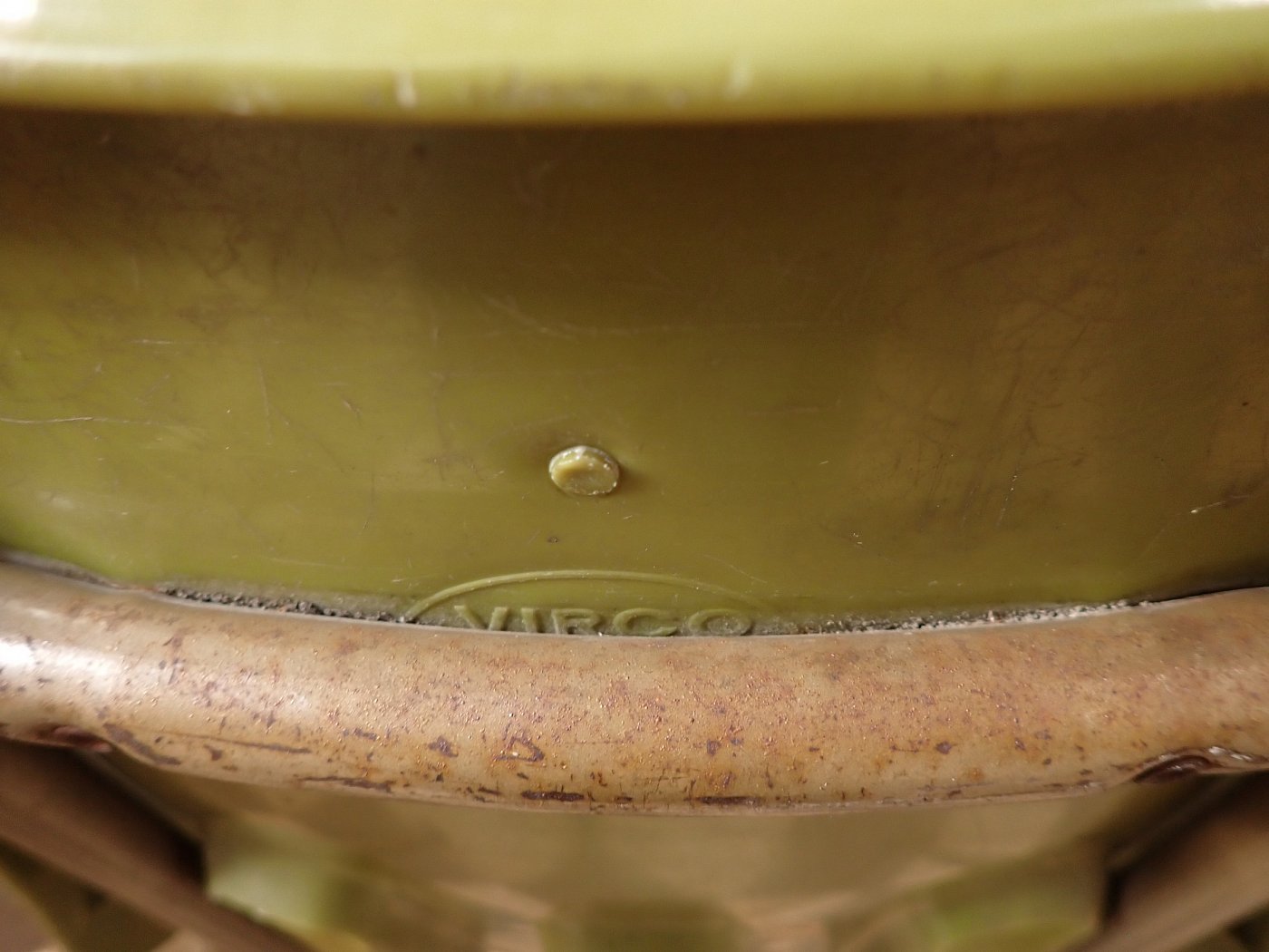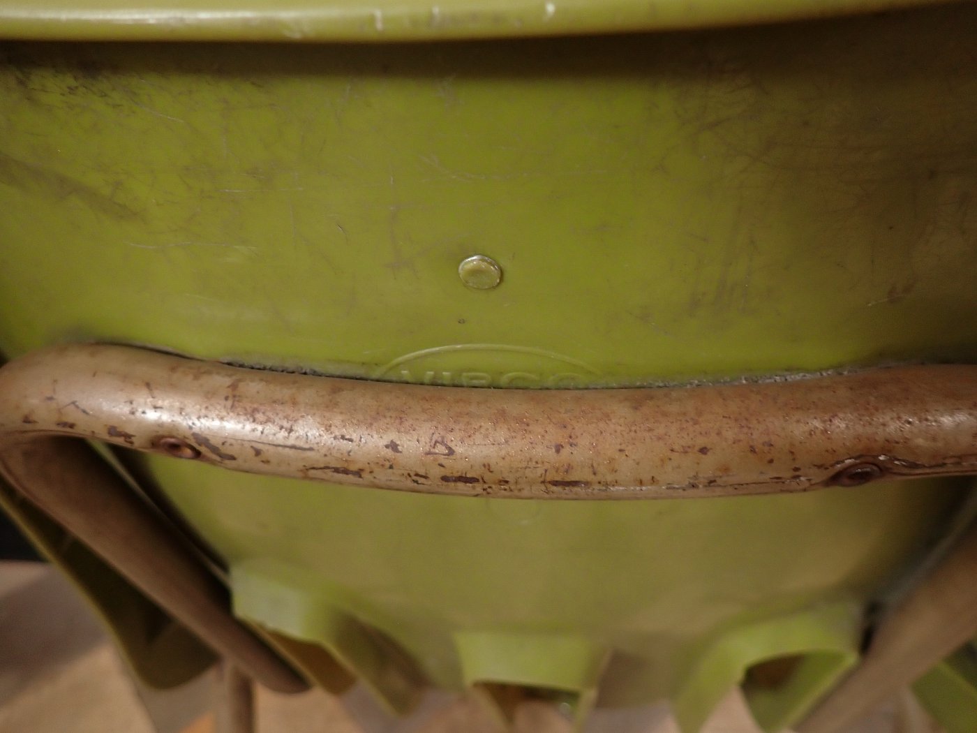 Die grüne Sitzschale ist auf der Rückseite mit dem Firmenstempel "VIRCO" gemarkt und wird von einem beige lackierten Gestell getragen.