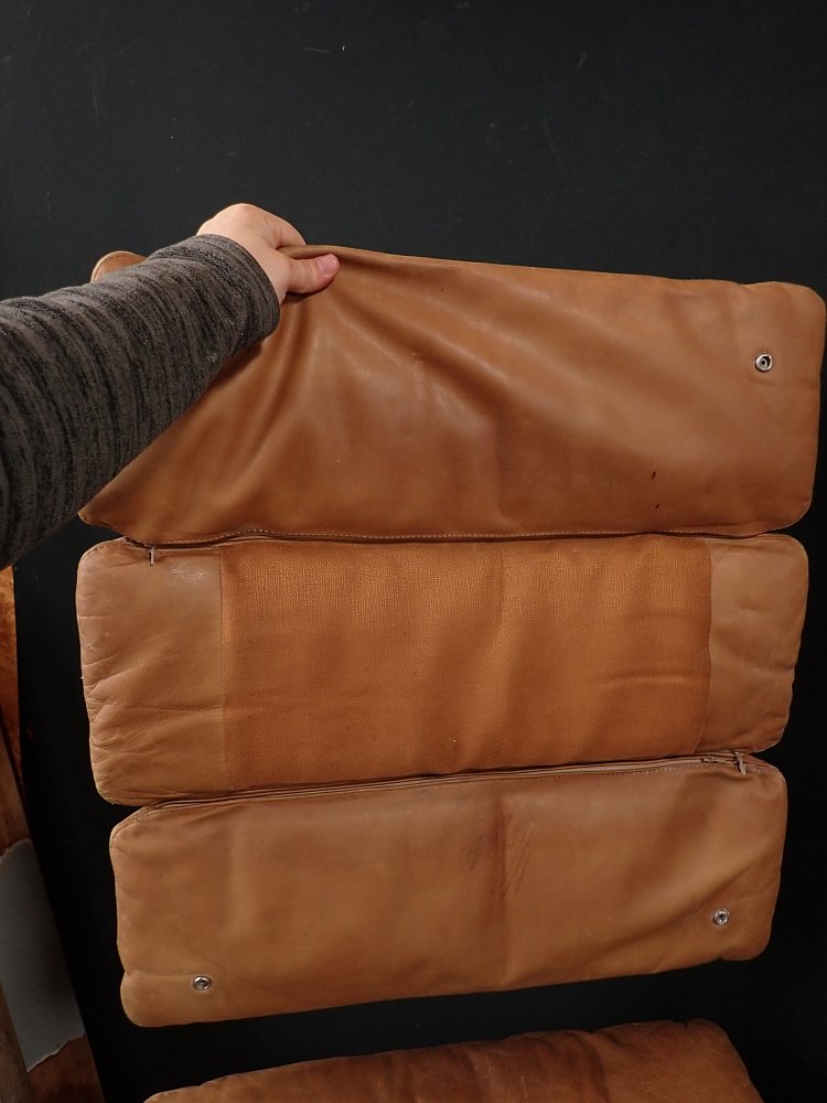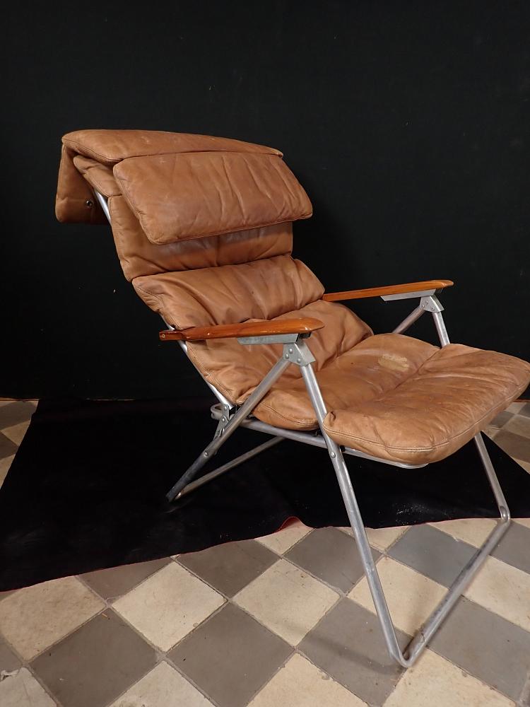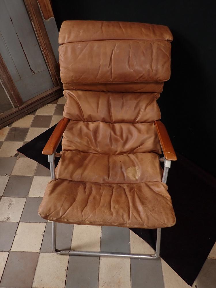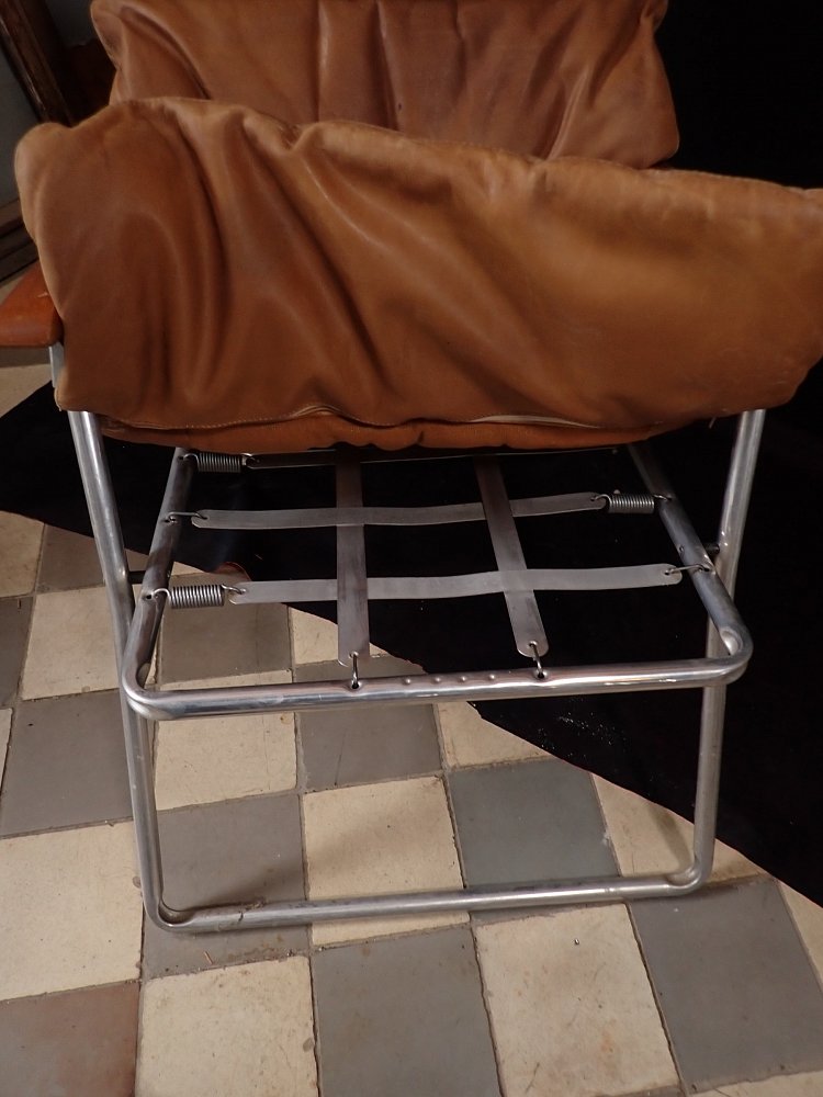Der Sessel hat ein Stuhlgestell aus Metall mit Holz Armlehnen, an der Rückenlehne ist eine Gummischnur gespannt. Auf der Sitzfläche sind Metallplatten mit Federn verbaut. Die Lehne des Klappstuhls ist durch die Armlehnen nach hinten verstellbar. Das lange Leder überzogene Polster wird auf die Sitzfläche bis zur Lehne auf den Stuhl gelegt, um bequemer zu sitzen. Das kurze Leder überzogene Polster wird über die Rückenlehne als Kopfpolster gelegt.