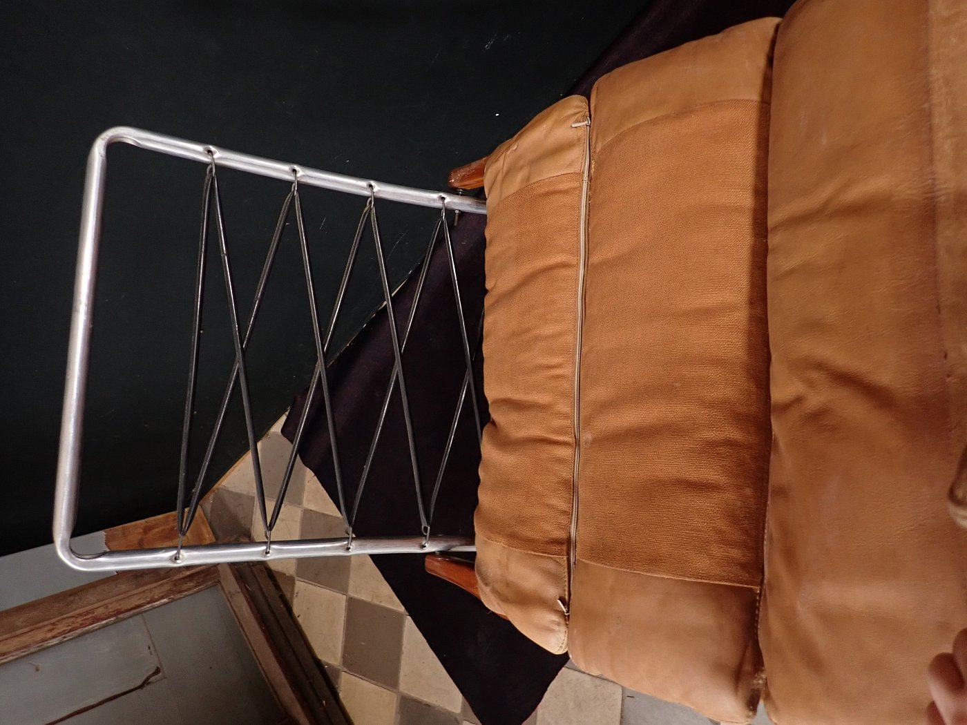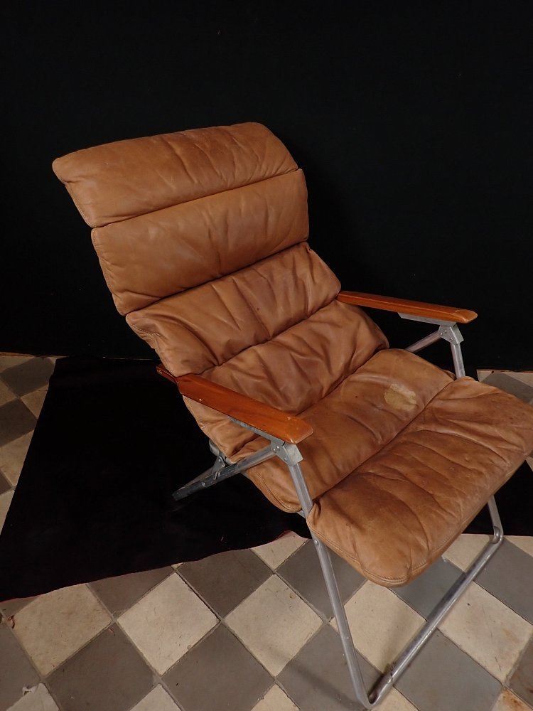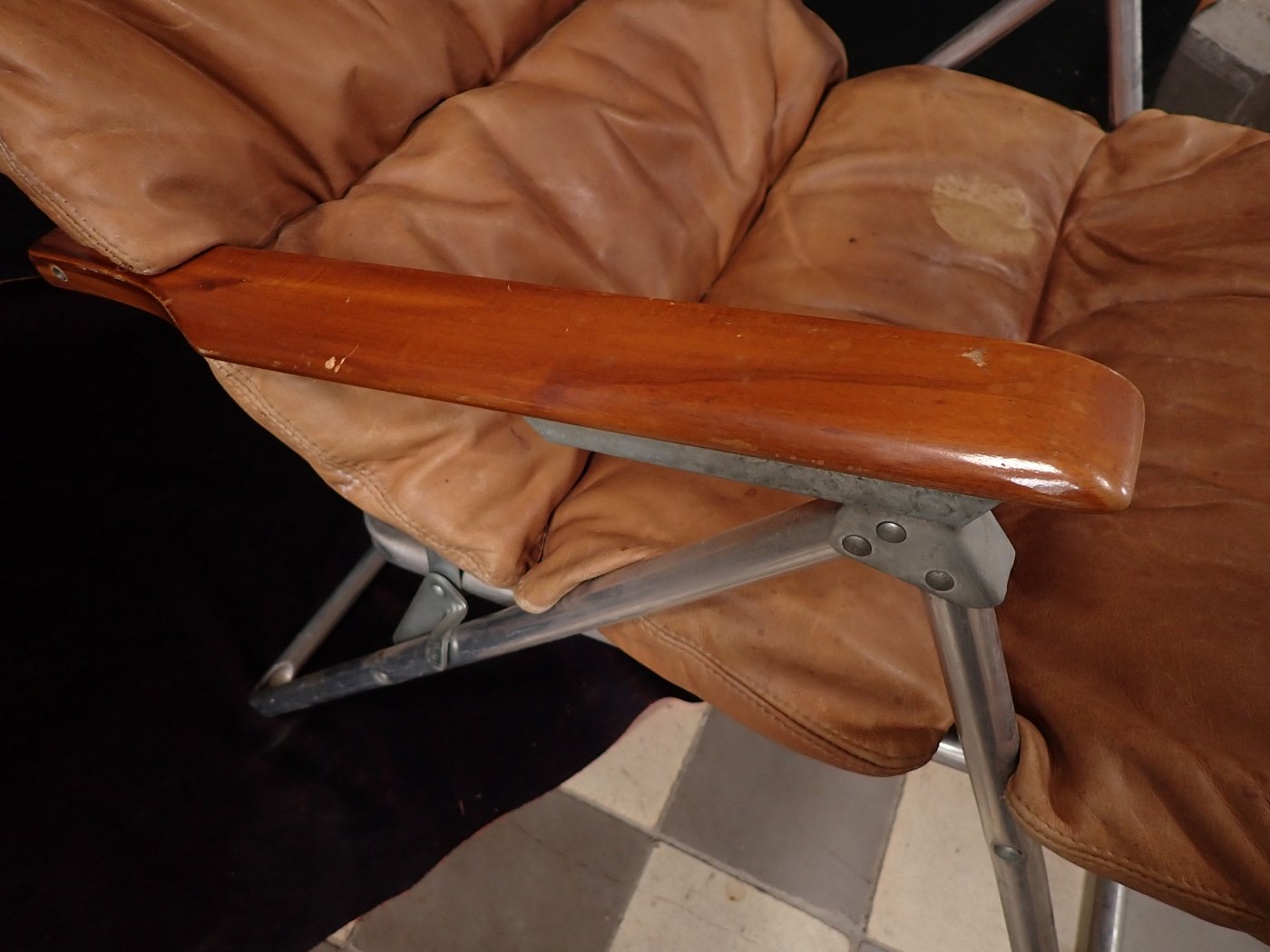 DetailansichtBrauner Leder Klappsessel. Der Sessel hat ein Stuhlgestell aus Metall mit Holz Armlehnen, an der Rückenlehne ist eine Gummischnur gespannt. Auf der Sitzfläche...