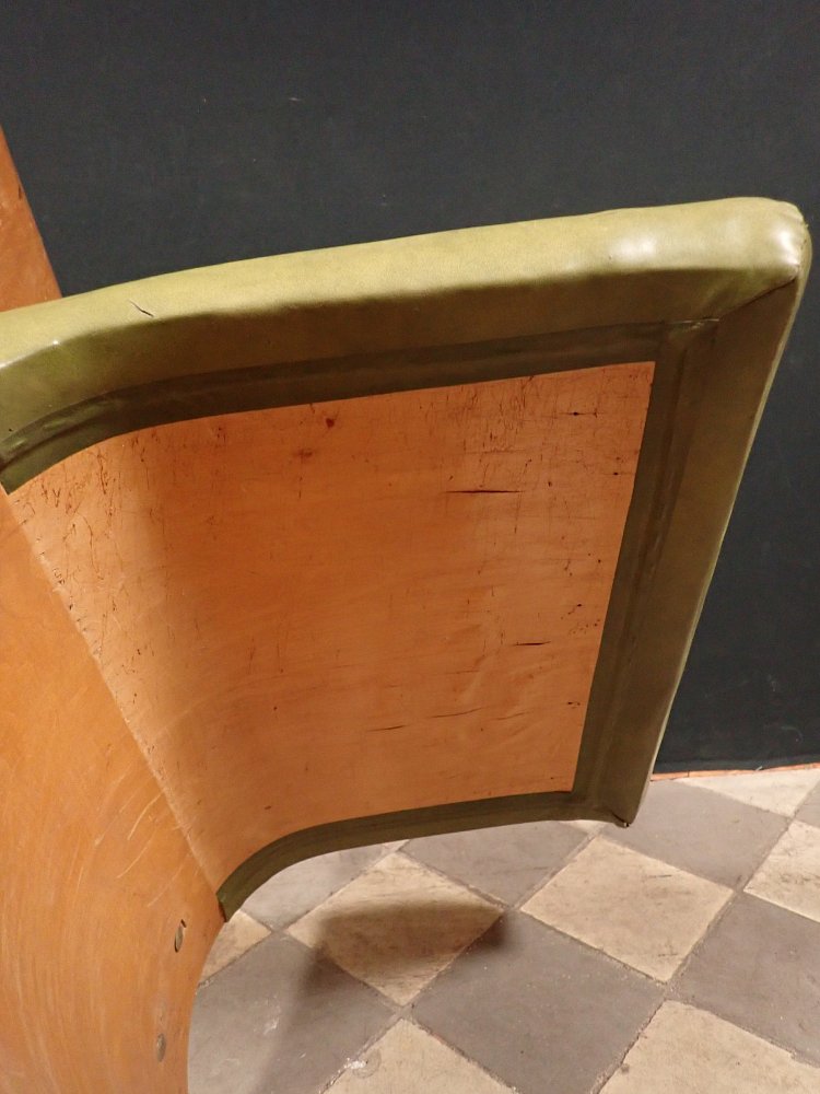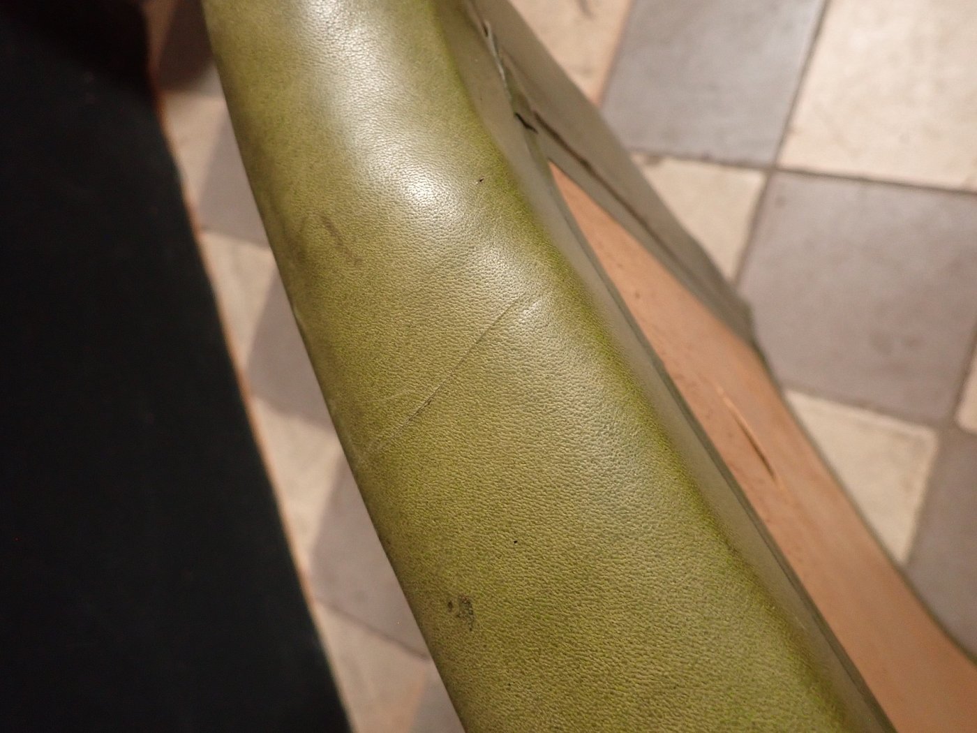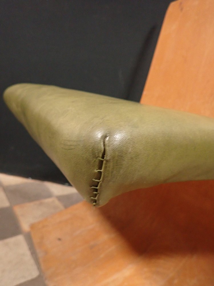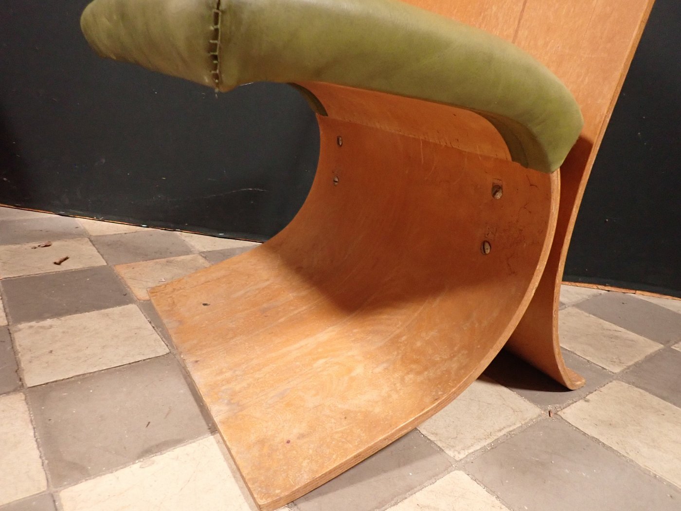 Der geschwungene Loungesessel kann eine intensive Nutzung in den letzten Jahrzehnten definitiv nicht leugnen, so lösen sich beispielsweise an einigen Stellen die Holzschichten und in dem Lederüberzug ist ein Schnitt.