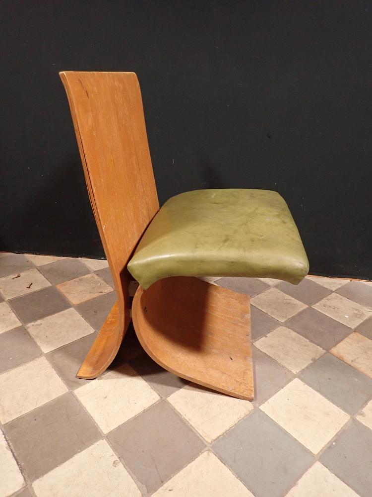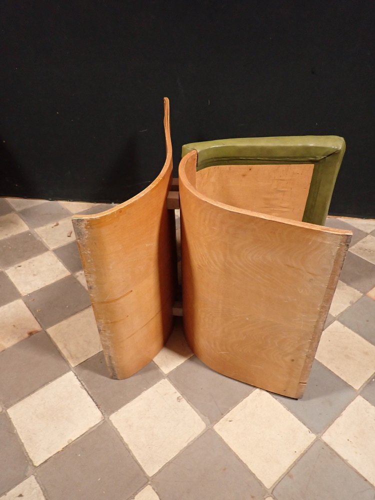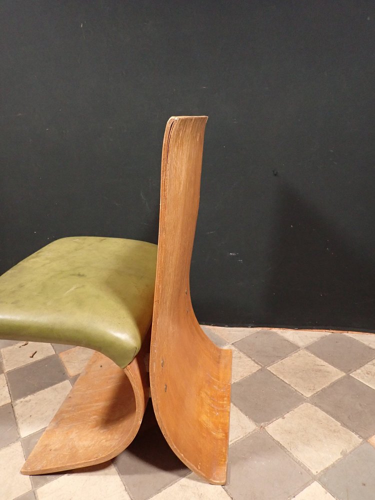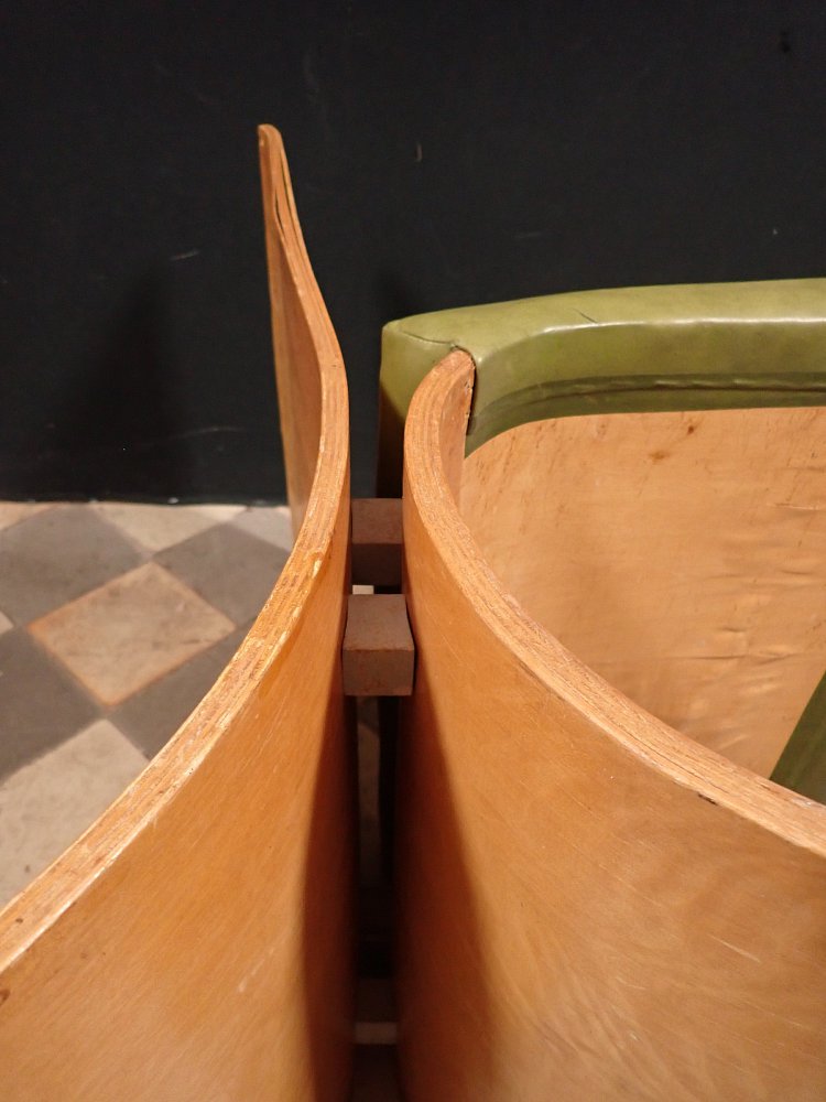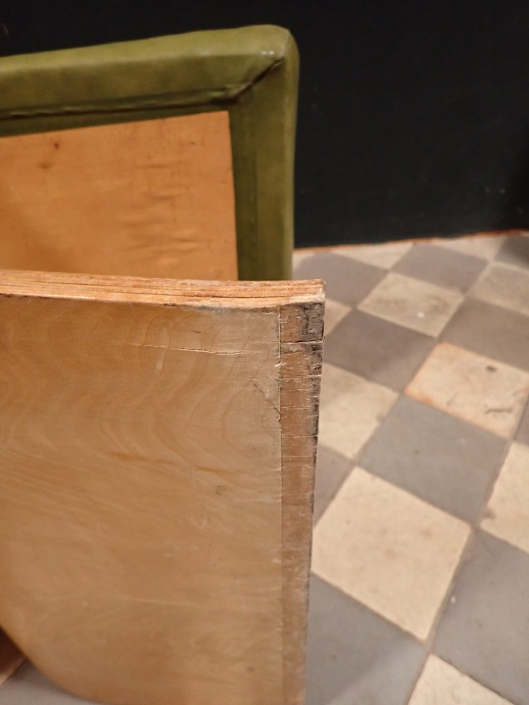 Der geschwungene Loungesessel kann eine intensive Nutzung in den letzten Jahrzehnten definitiv nicht leugnen, so lösen sich beispielsweise an einigen Stellen die Holzschichten und in dem Lederüberzug ist ein Schnitt.