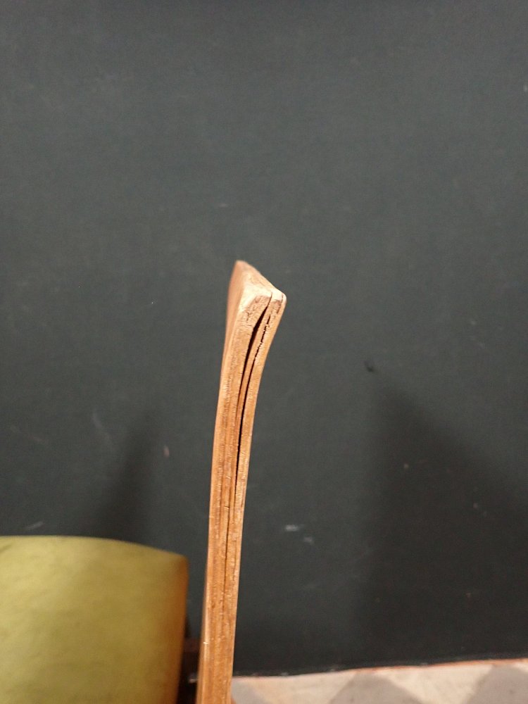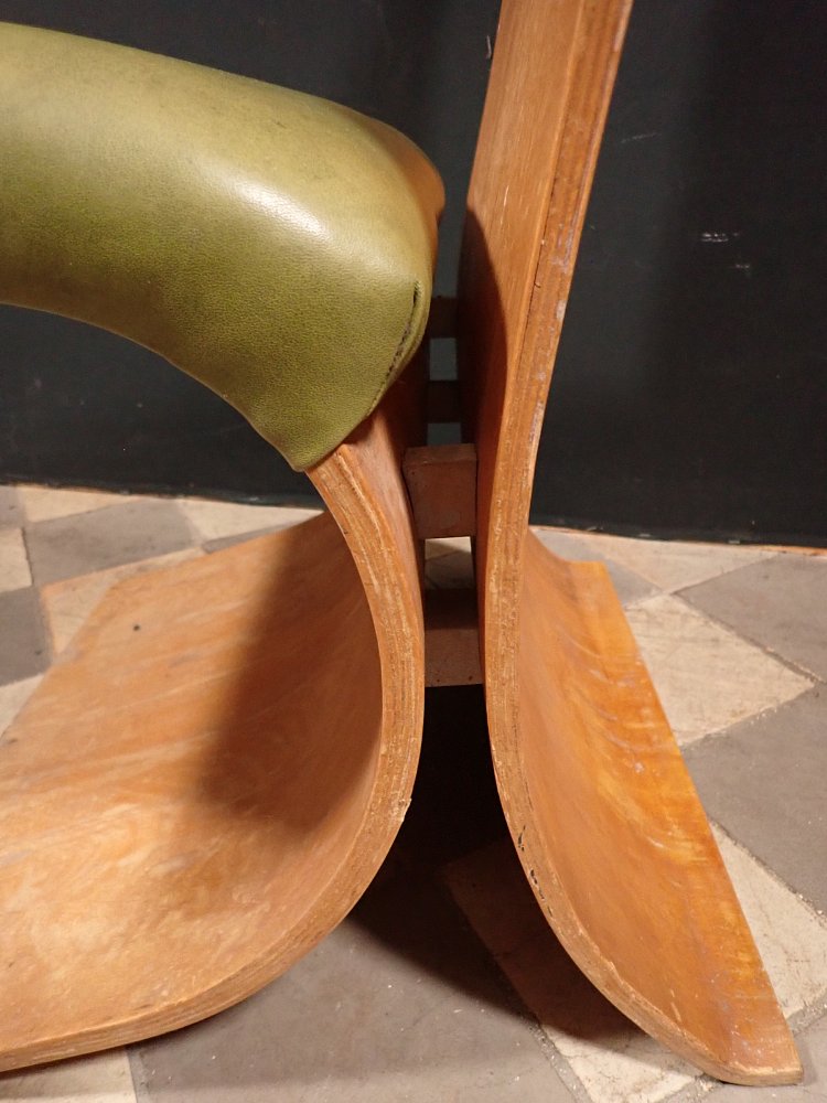 Sowohl die Rückenlehne als auch die Sitzfläche sind aus gebogenem Schichtholz gearbeitet und durch kleine Abstandsklötzchen verbunden.