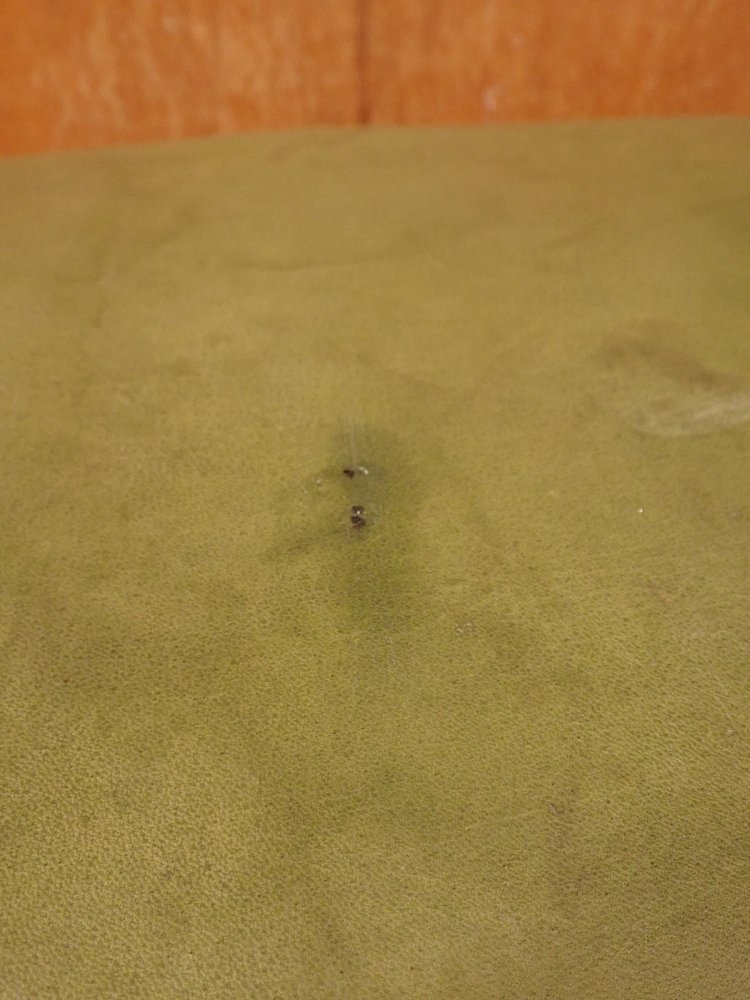 Die Sitzfläche ist mit einer dicken Auflage gepolstert, welche mit einem hellgrünen Leder bezogen ist.