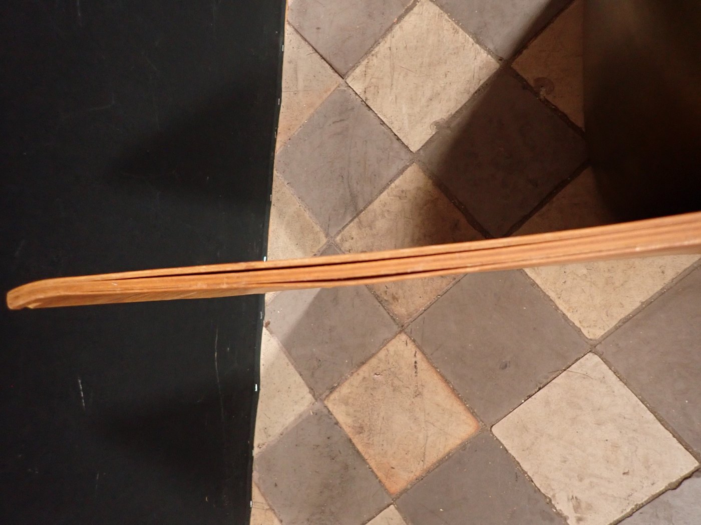 DetailansichtVintage Bambus Blumenständer. Blumenständer mit fünf Übertopf Halterungen. Der Blumenständer besteht aus Bambus. An einem Bambus Stab steht ein abgebrochenes...