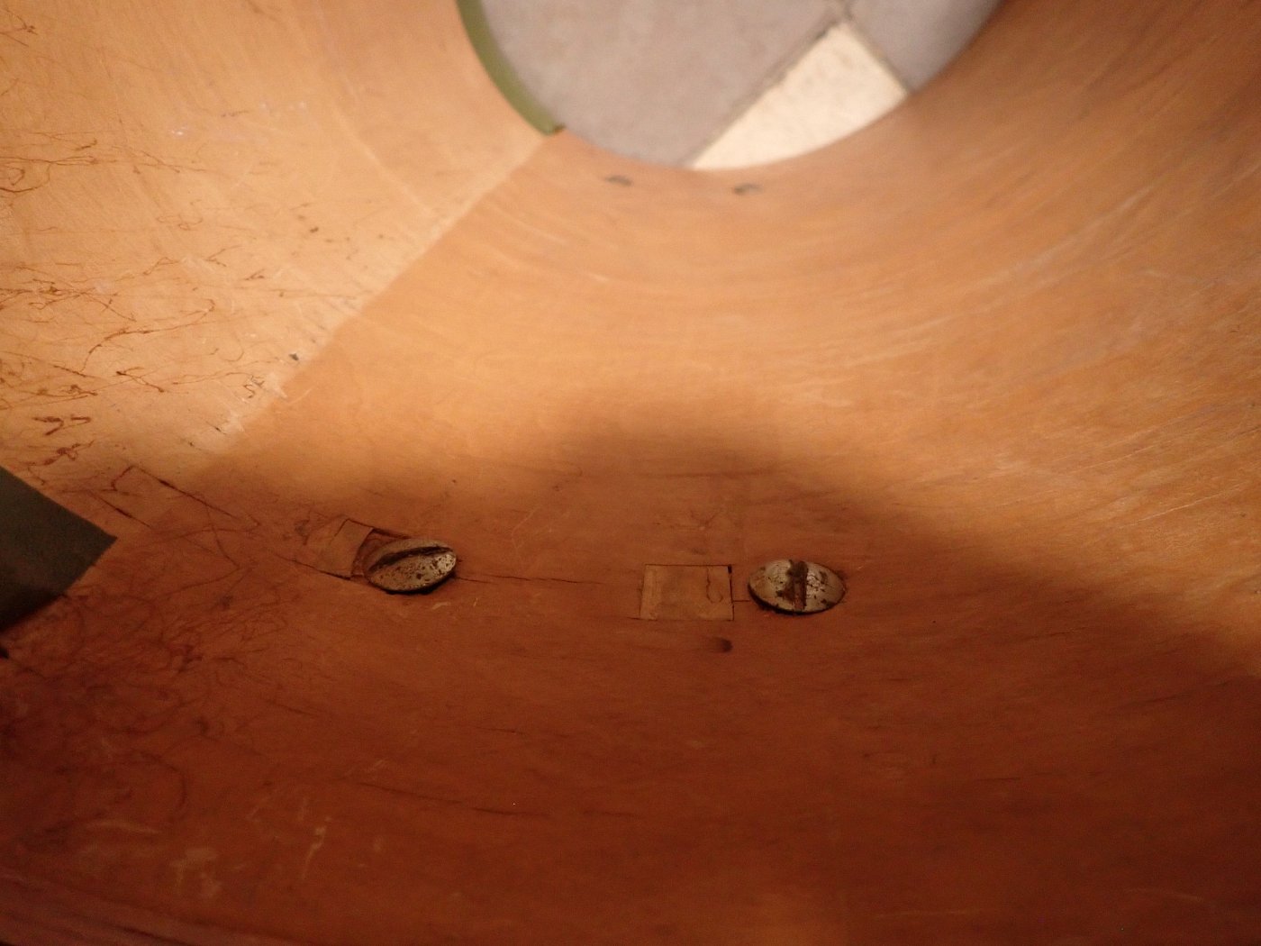 DetailansichtBlumenhocker aus den 50er-Jahren. Der Blumenhocker besteht aus einer Holzspanplatte, die mit einem Stoff überzogen und am Rand mit runden Kopfnägeln befestigt...