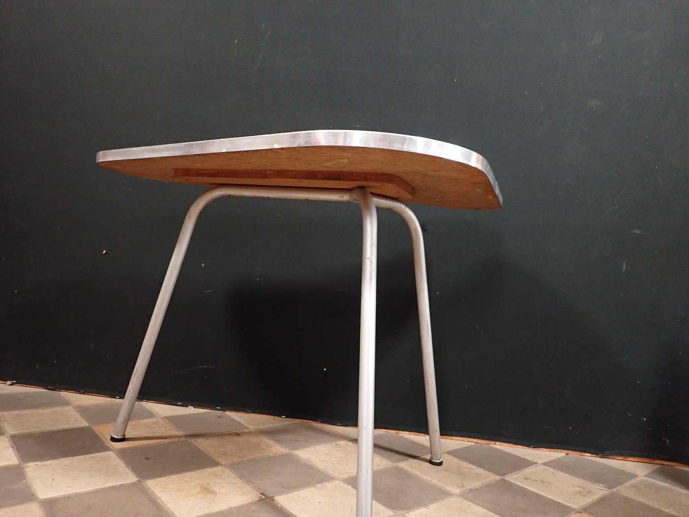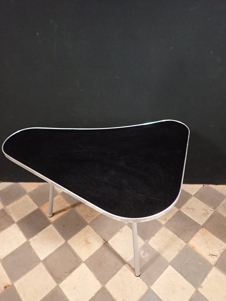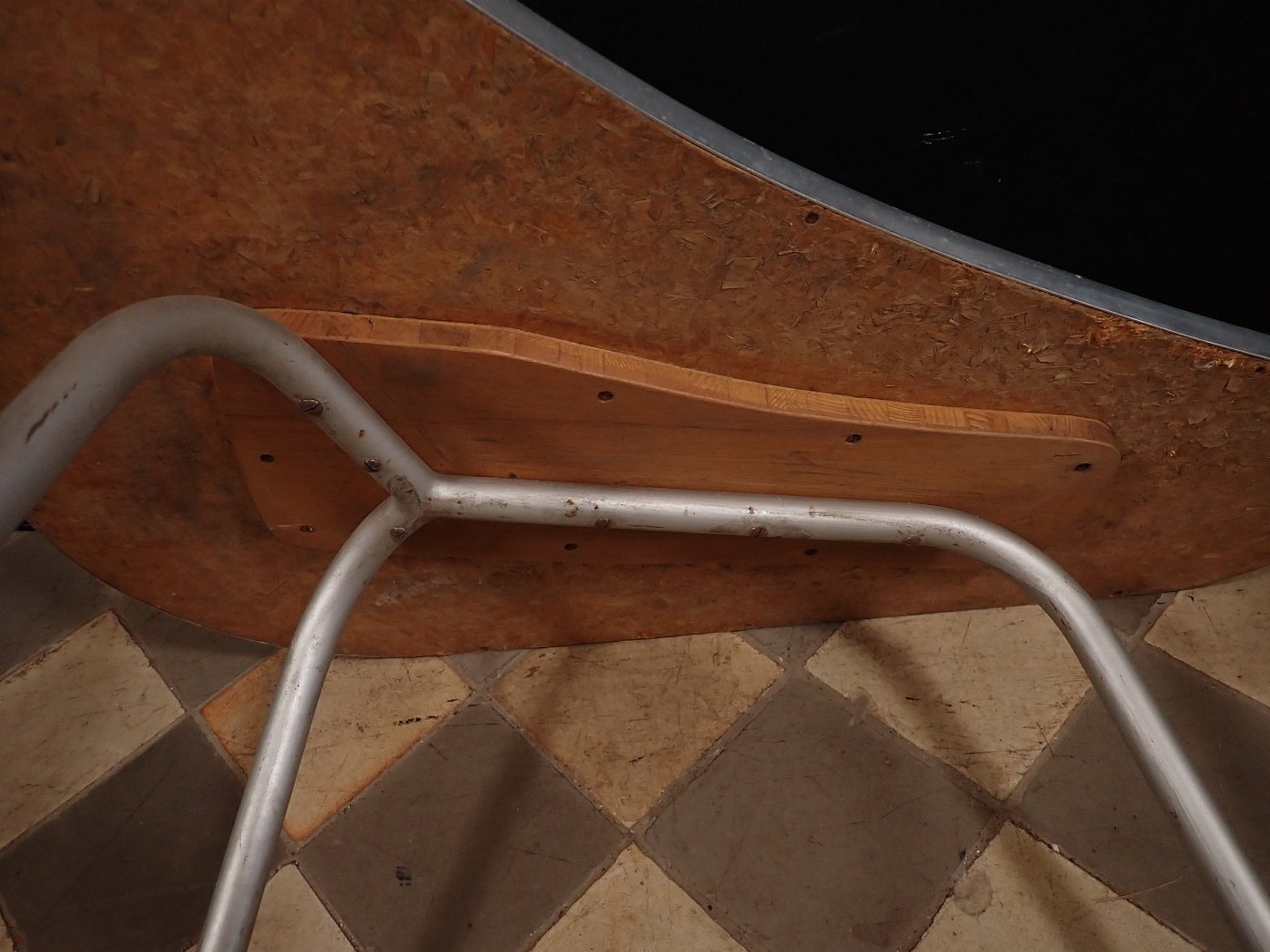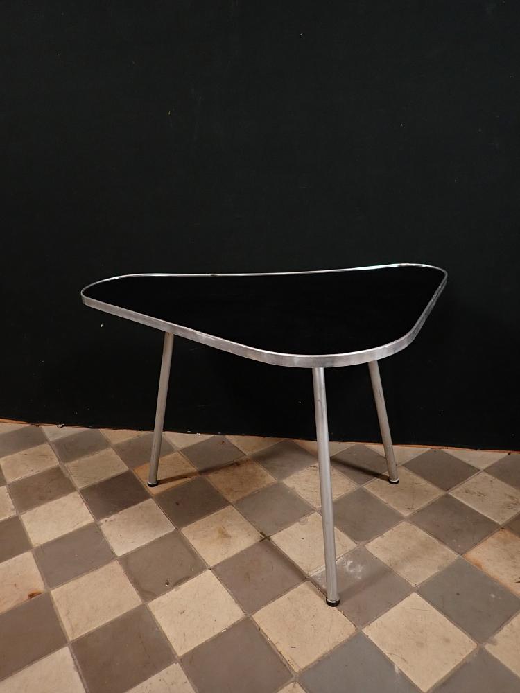 Die nierenförmige Tischplatte ist auf einem dreibeinigen Stahlrohrgestell befestigt und mit einer Chromleiste eingefasst.