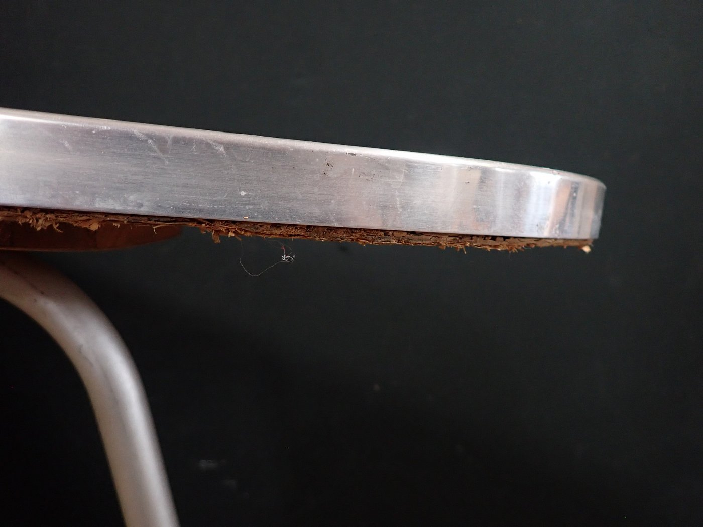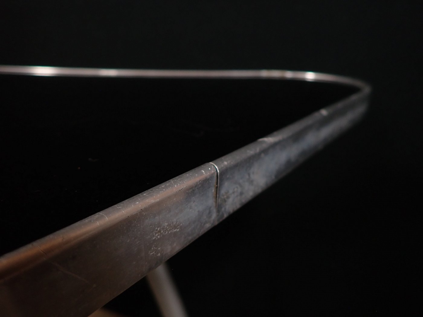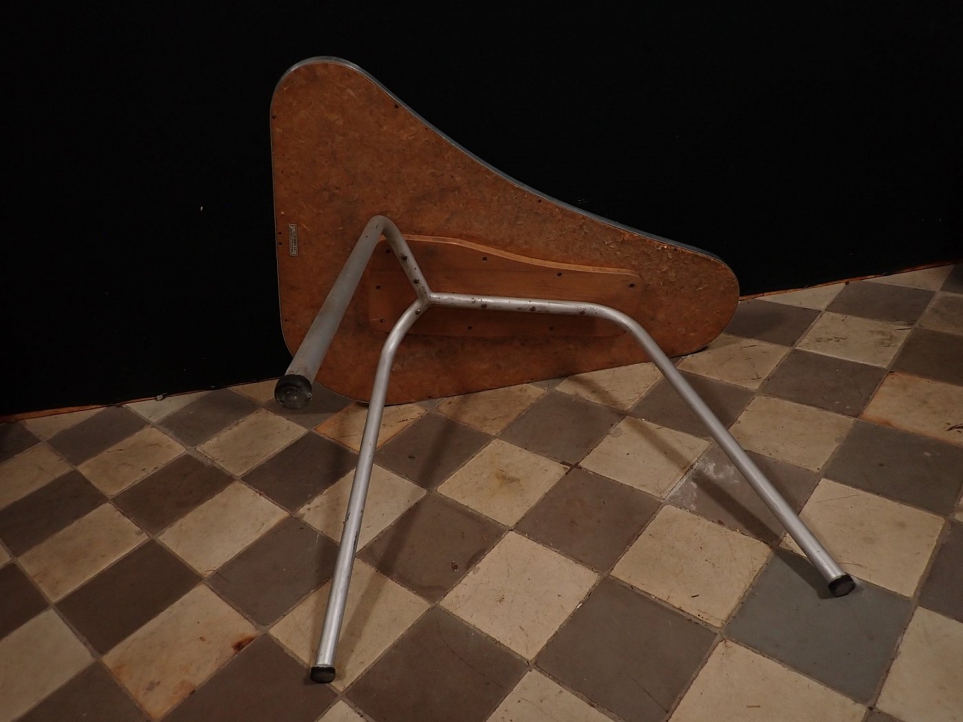 Die nierenförmige Tischplatte ist auf einem dreibeinigen Stahlrohrgestell befestigt und mit einer Chromleiste eingefasst.