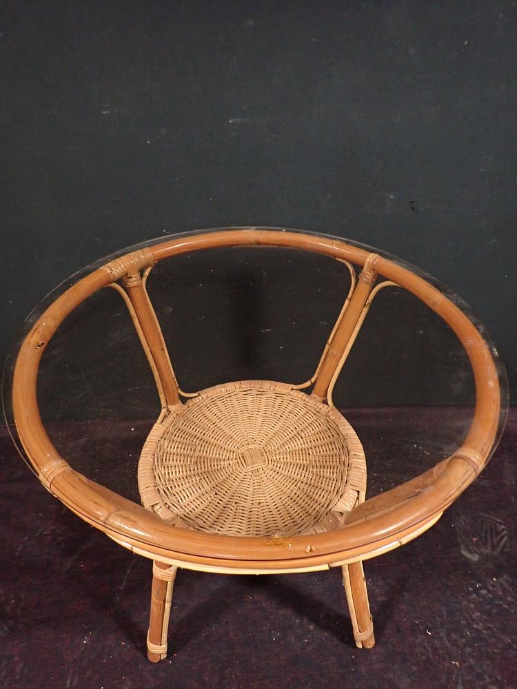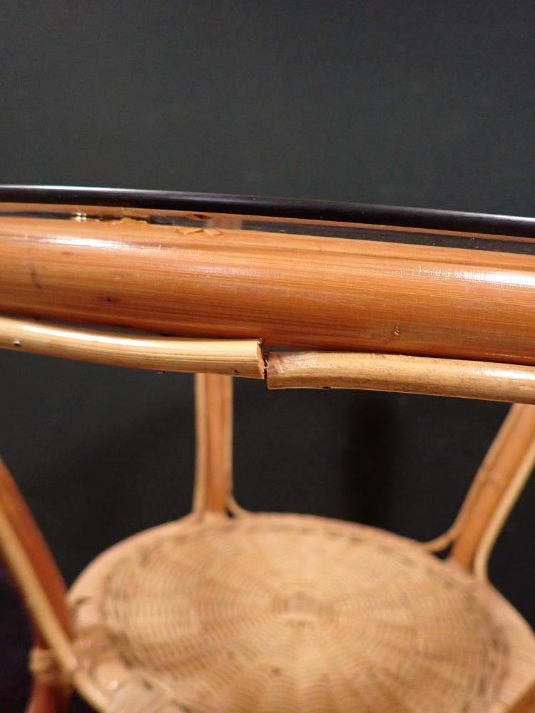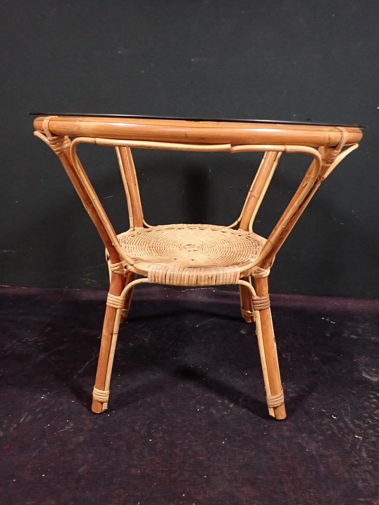 DetailansichtDer Beistelltisch besteht aus einem zusammengebundenen Rattan Gestell, worauf eine Glasplatte geklebt wurde. Unter der Glasplatte ist eine Ablagefläche aus Rattan geflochten.