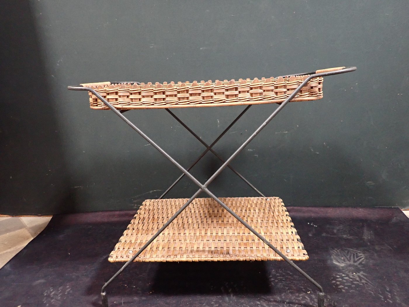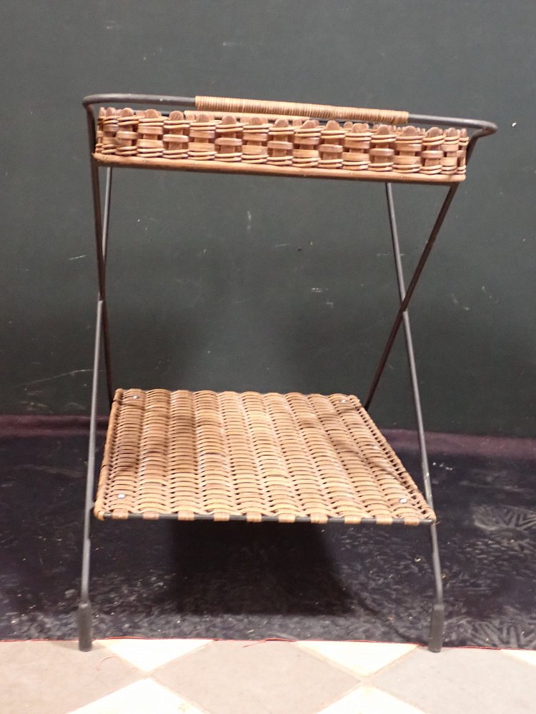 DetailansichtServierwagen mit Rollen. Der Servierwagen hat zwei Etagen, die als Ablagefläche dienen. Am Metallgestell ist ein Zeitungshalter aus Metall. Der Zustand des...
