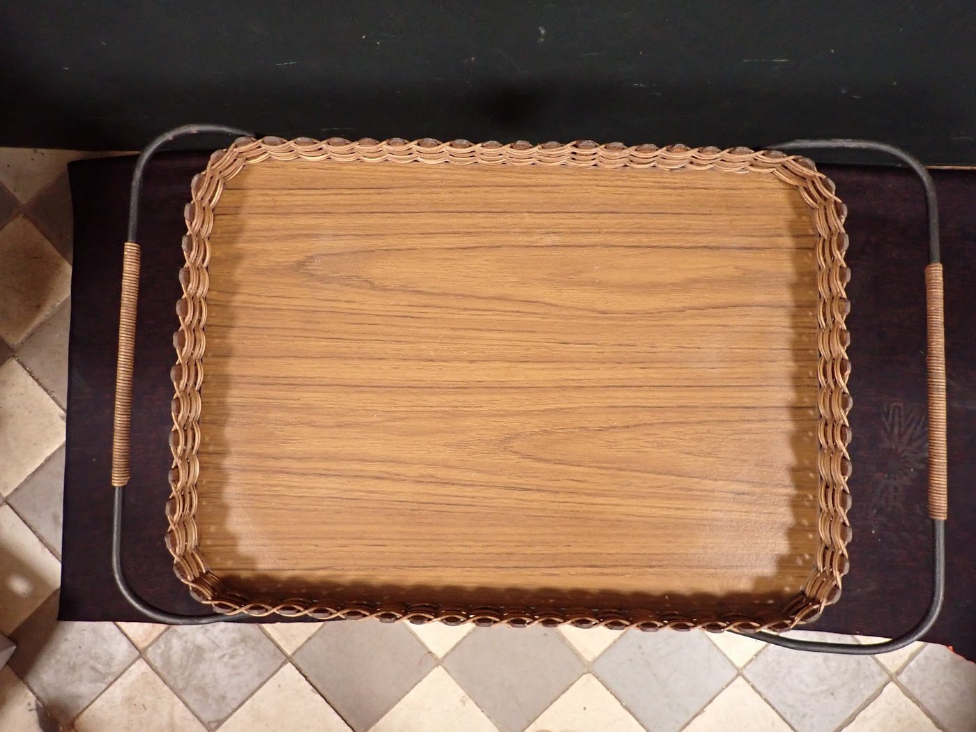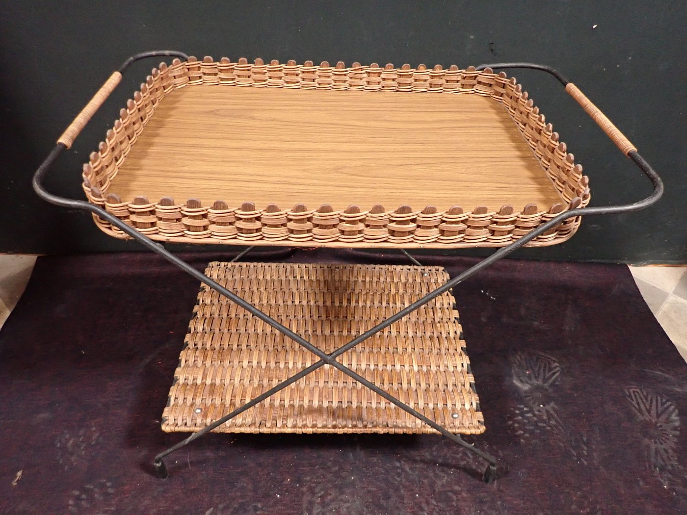 DetailansichtServierwagen 70er - Jahre. Servierwagen mit einem Metallgestell und abnehmbaren funierten Tablets. Der Wagen steht auf vier Rollen. Die Tablets sind leicht benutzt...