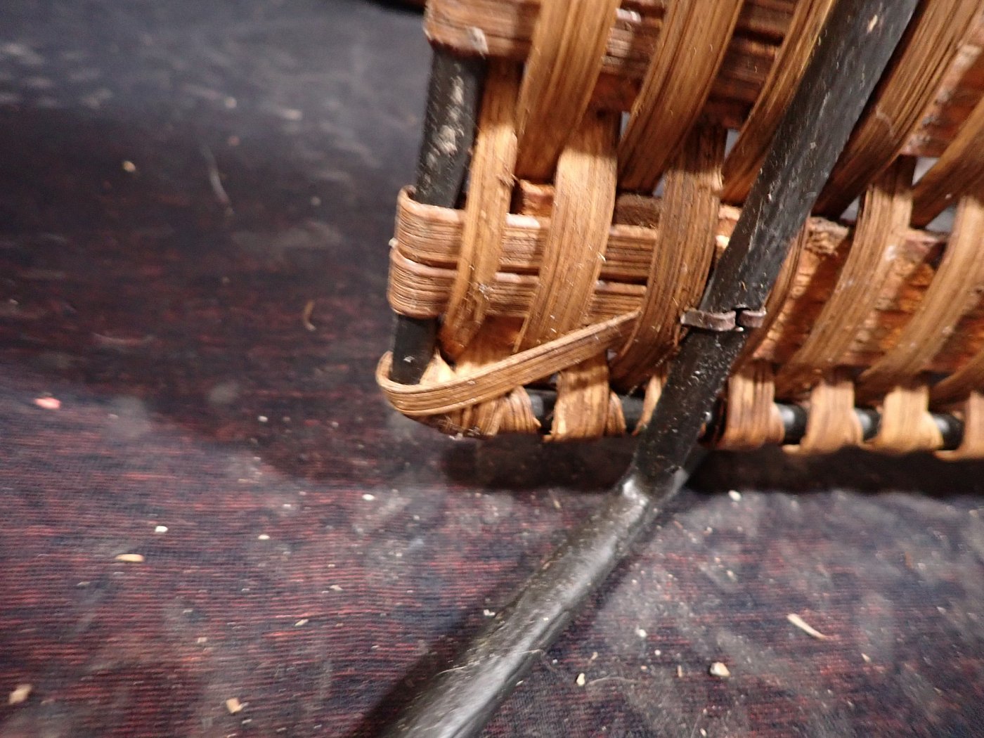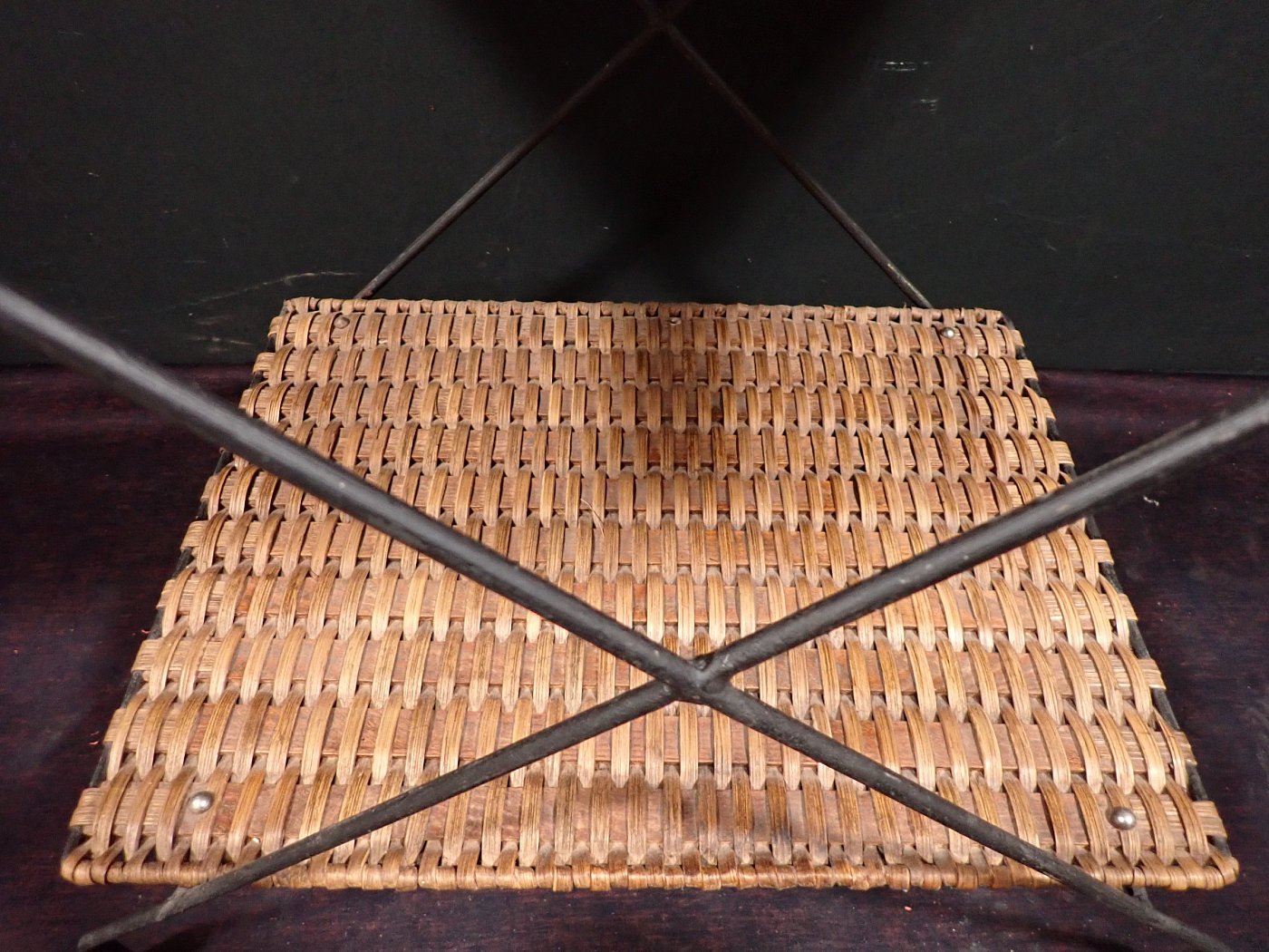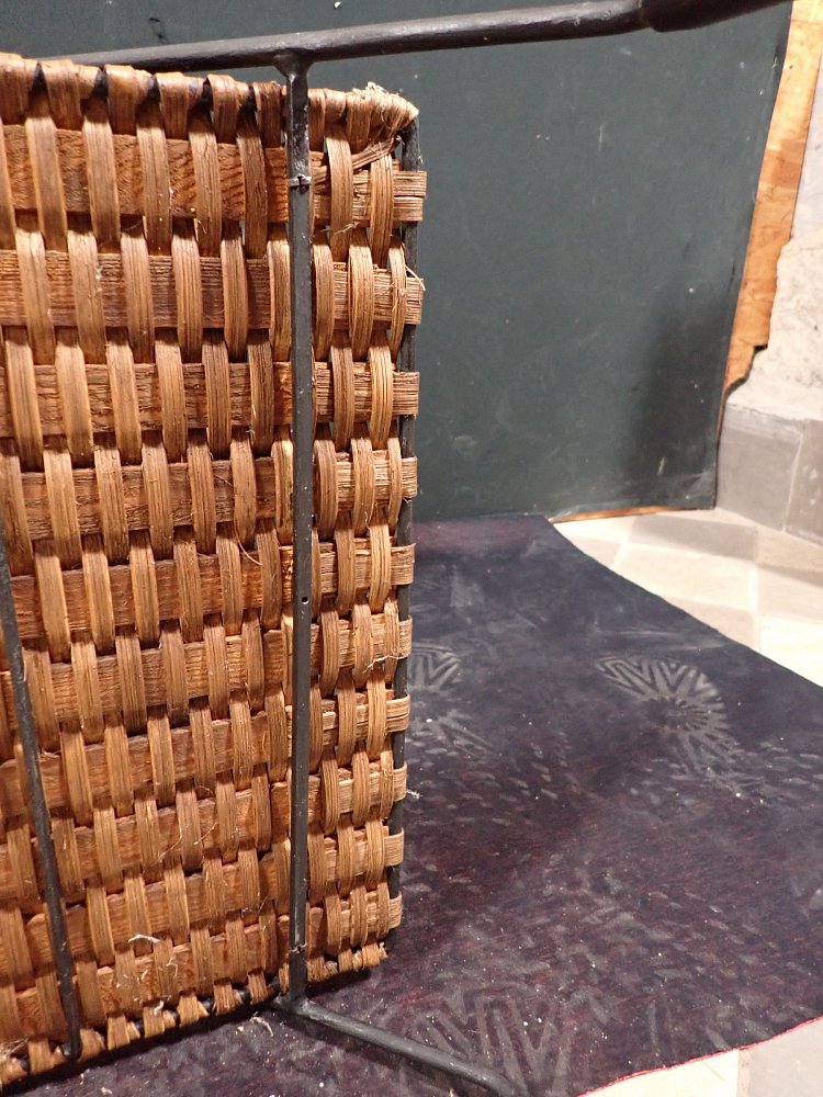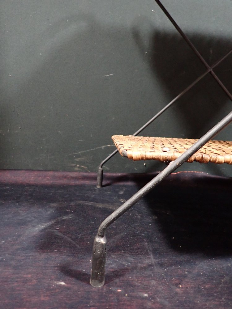 DetailansichtZierlicher Stuhl mit Geflecht. Getragen wird die geflochtene Sitzschale von einem schwarz lackierten Eisengestell, auf dessen Füße kleine Gummischoner aufgesteckt...