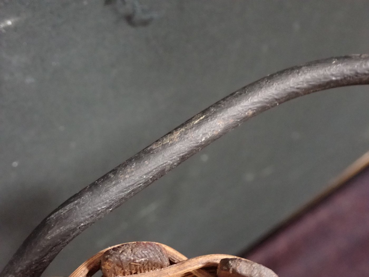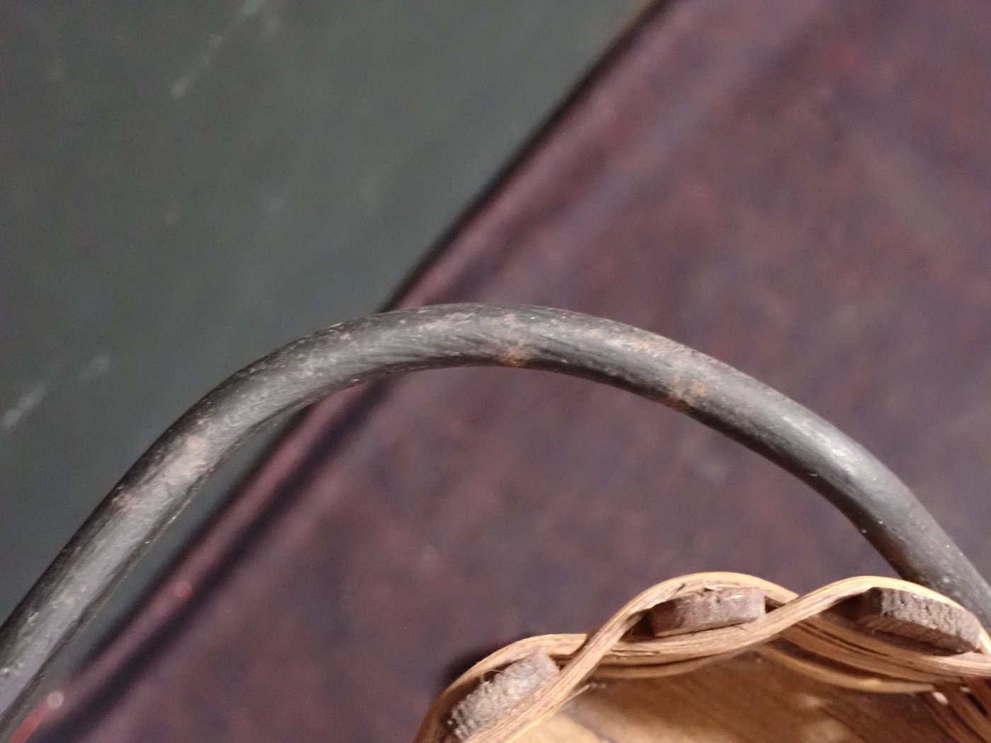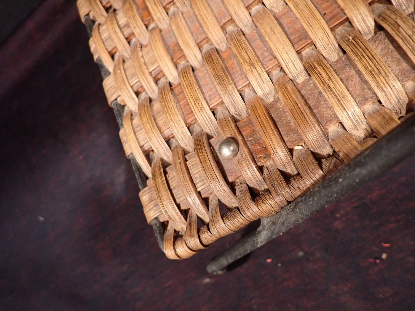 DetailansichtZierlicher Stuhl mit Geflecht. Getragen wird die geflochtene Sitzschale von einem schwarz lackierten Eisengestell, auf dessen Füße kleine Gummischoner aufgesteckt...