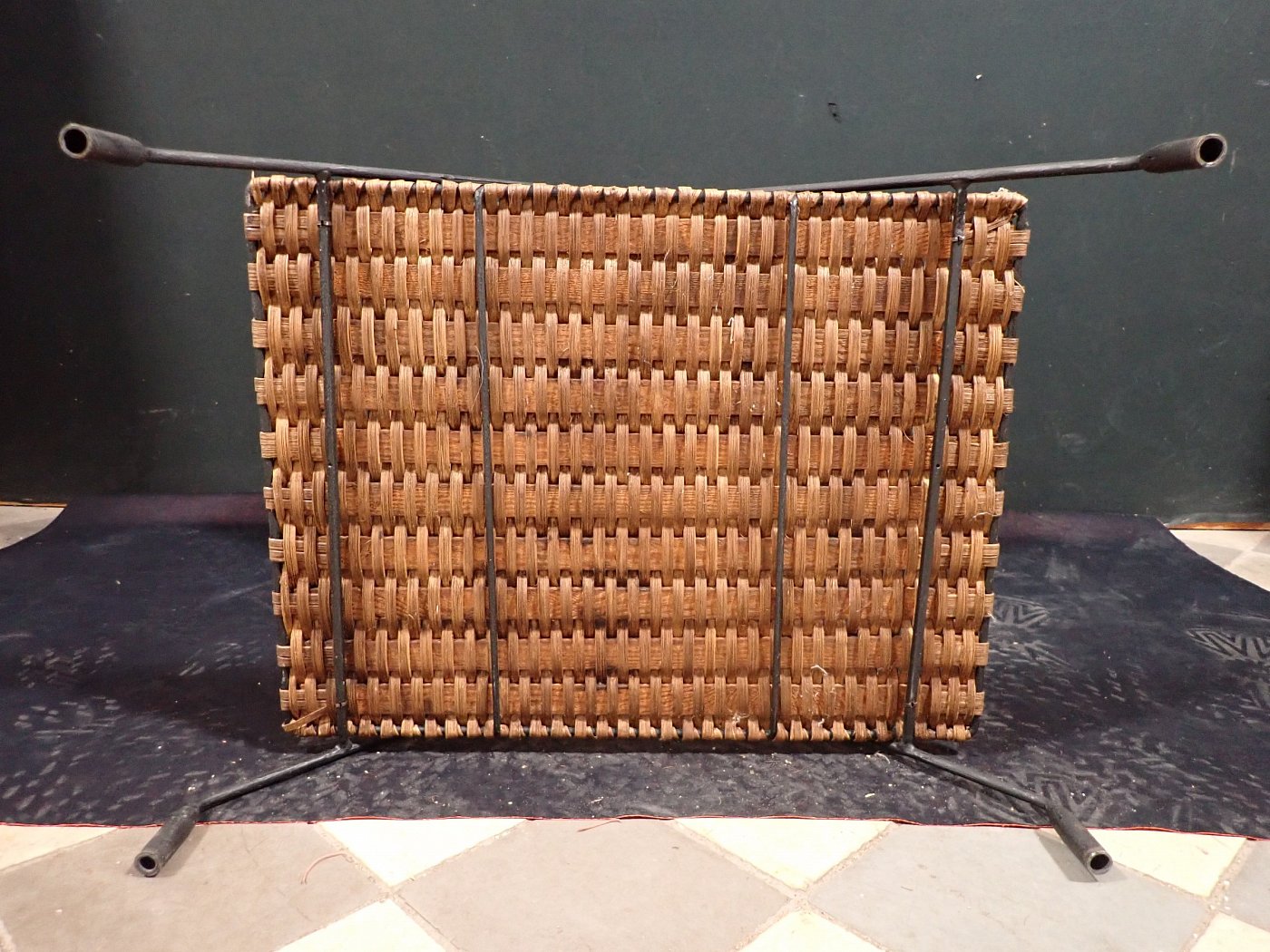 DetailansichtDer Zeitschriftenwagen ist auf einem geschwungenen Messinggestell aufgebaut und hat gespannte Stofffächer zwischen den Messingstangen. Er besitzt vier kleine Räder...