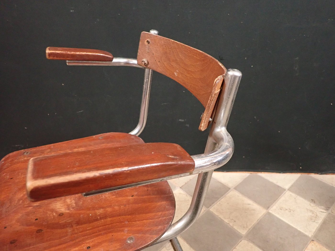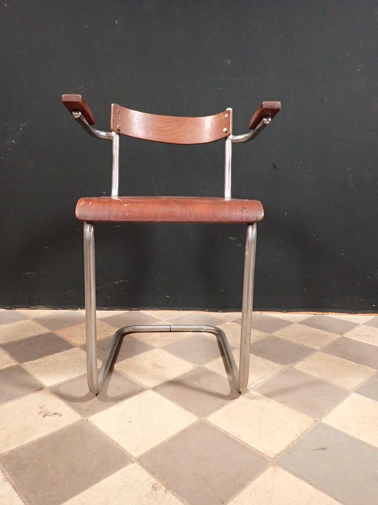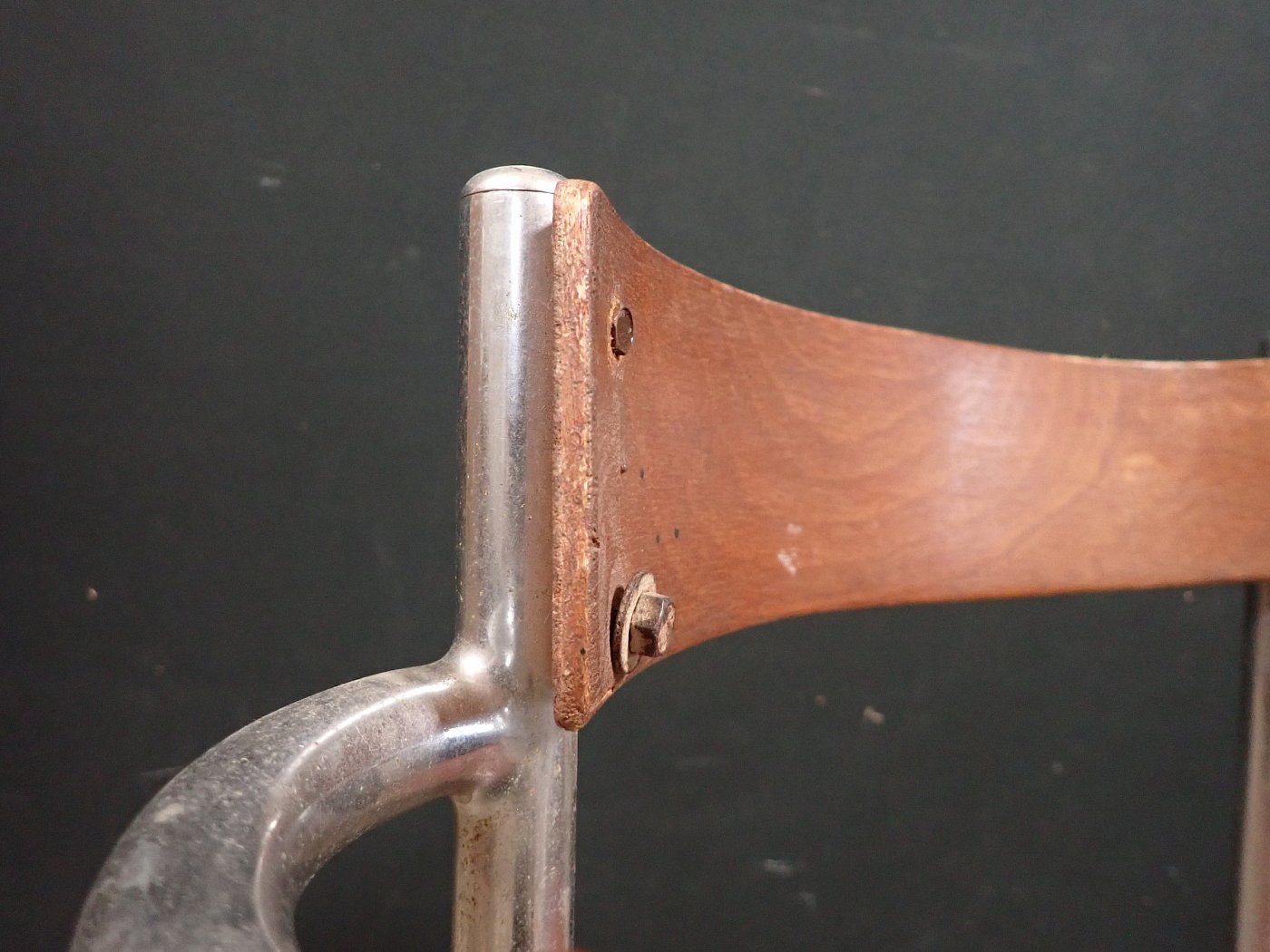 Der Stahlrohrstuhl ist mit einer Sitzfläche, Rückenlehne und Armlehnen aus Holz ausgestattet. Die Kombination aus warmem Holz und dem kühl wirkenden Chrom bildet einen spannenden Kontrast.