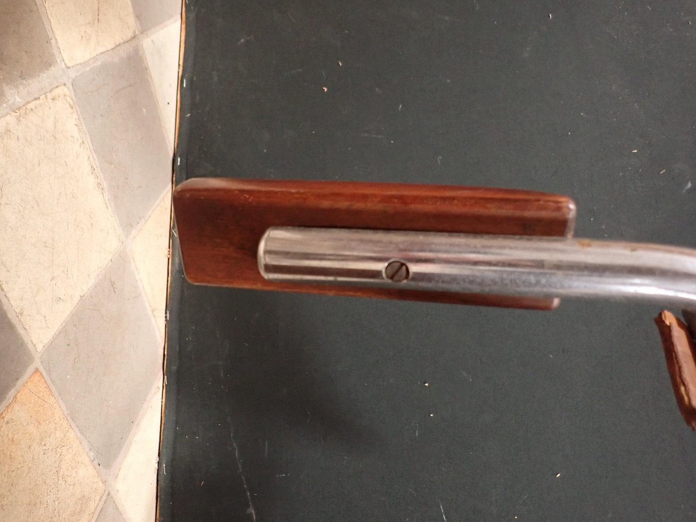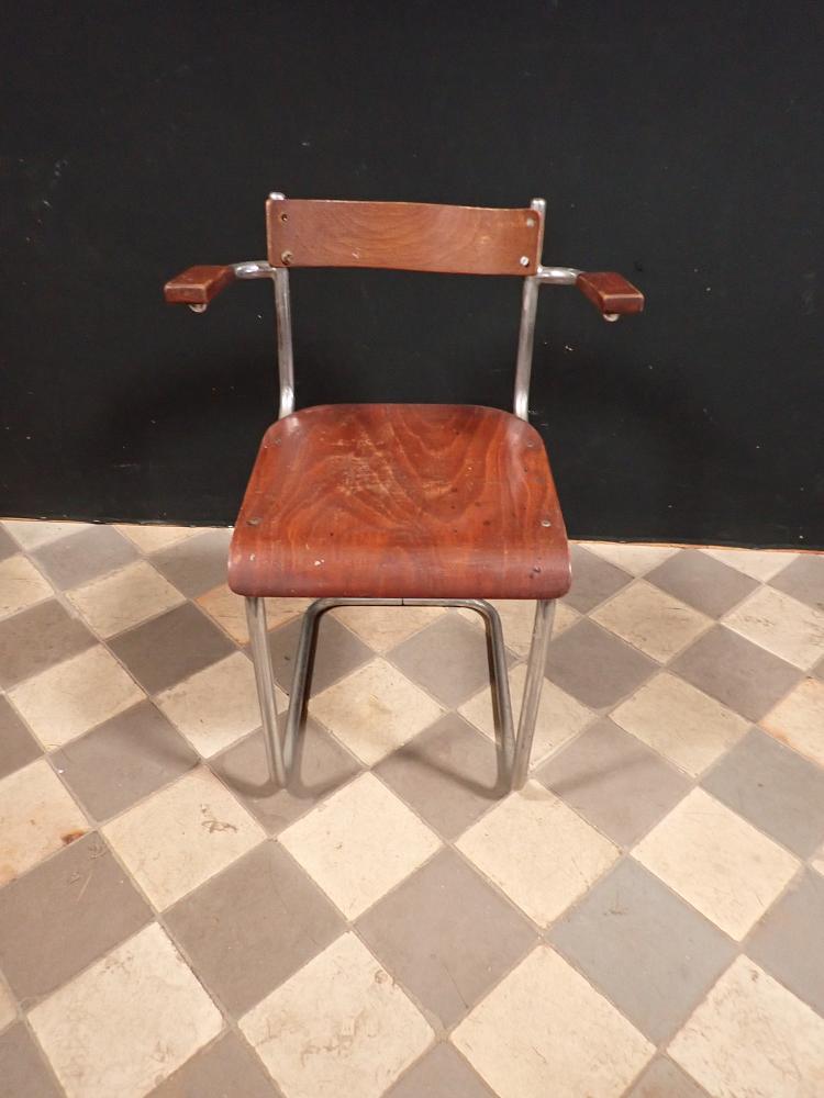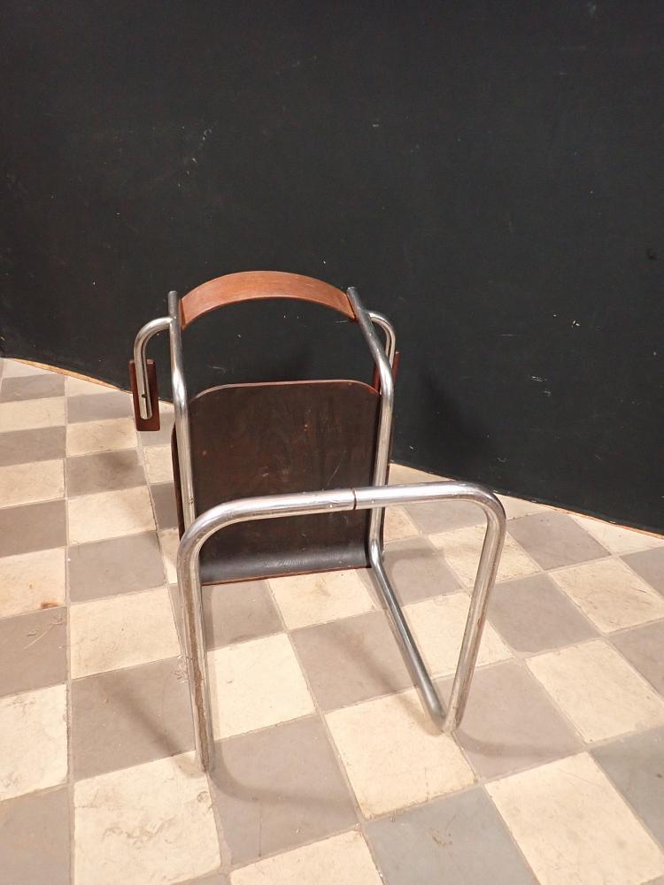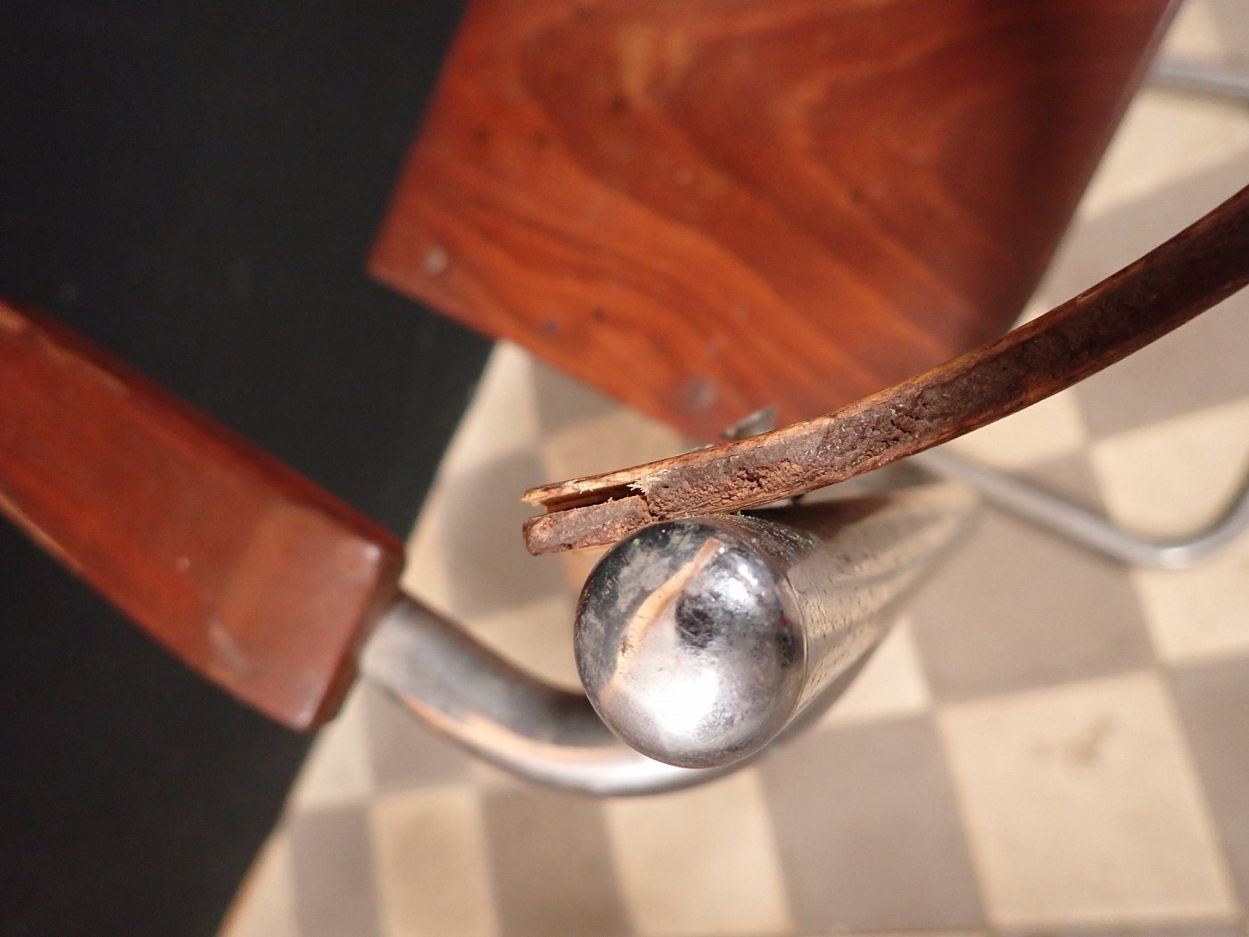 Der Stahlrohrstuhl ist mit einer Sitzfläche, Rückenlehne und Armlehnen aus Holz ausgestattet. Die Kombination aus warmem Holz und dem kühl wirkenden Chrom bildet einen spannenden Kontrast.