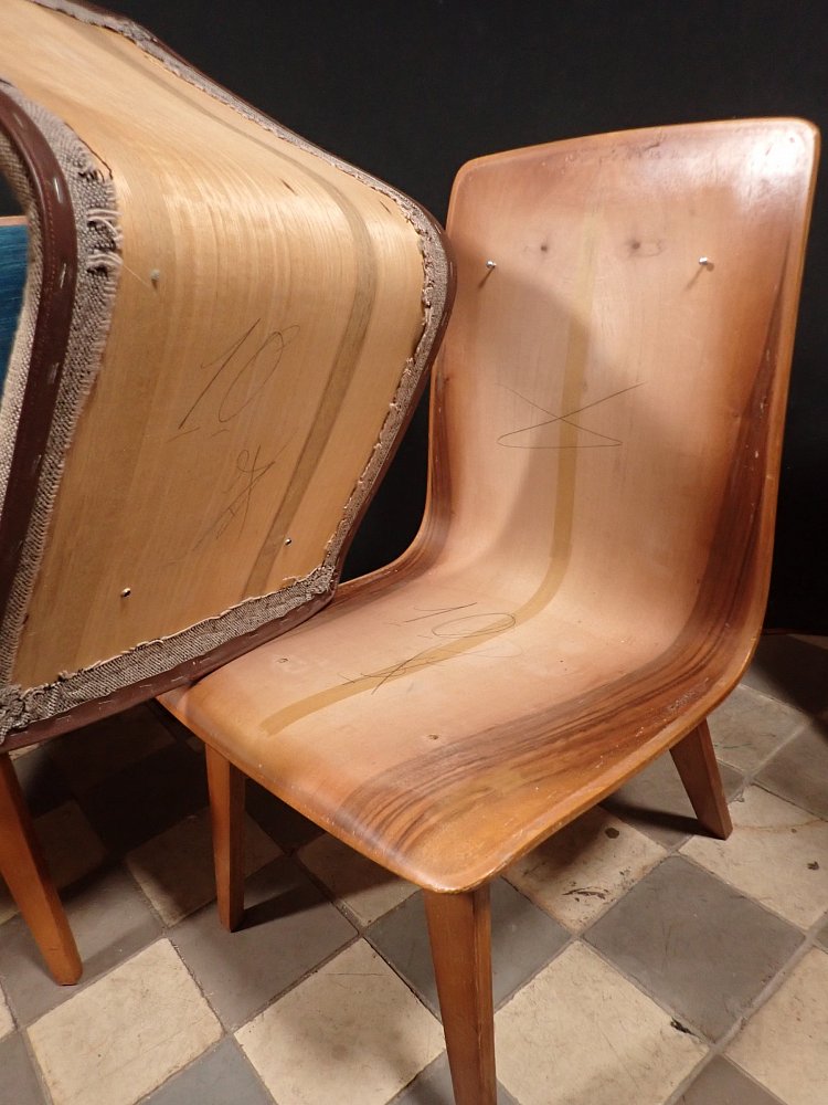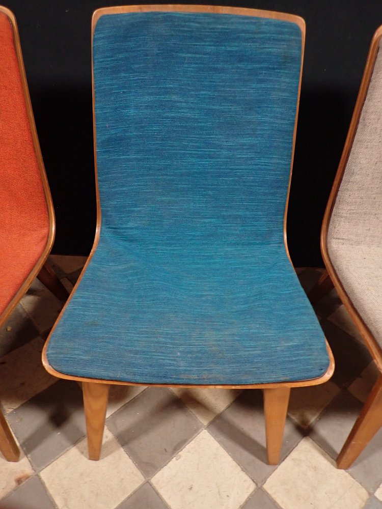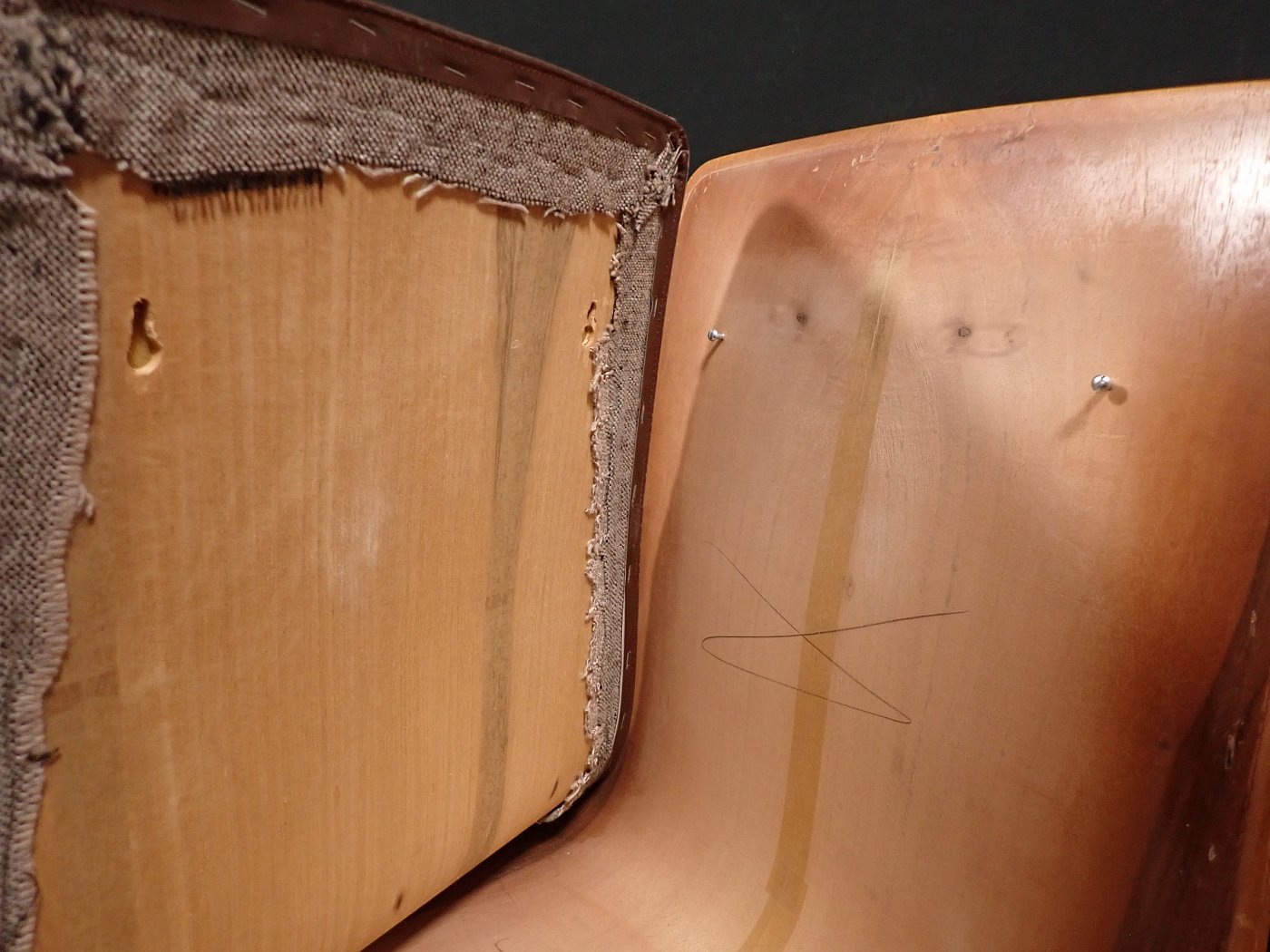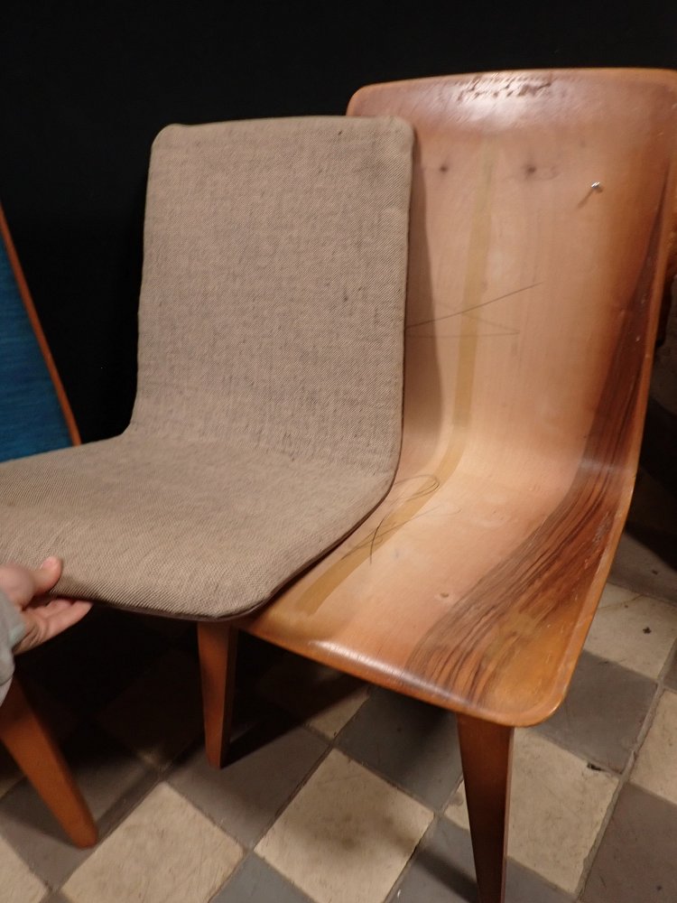 Das Stuhlgestell besteht aus Holz und hat eine außergewöhnliche Form. Der Polsterbezug wird in der Lehne eingehängt und auf der Unterseite mit zwei schrauben festgeschraubt. Somit lässt sich das Polster einfach reinigen, ohne den Stuhl mit Wasserflecken zu beschädigen. Bei dem roten und blauen Stuhl ist kein Polster mehr im Bezug vorhanden, dies müsste erneuert werden. Bei dem beigen Stuhl ist das Polster noch intakt.
