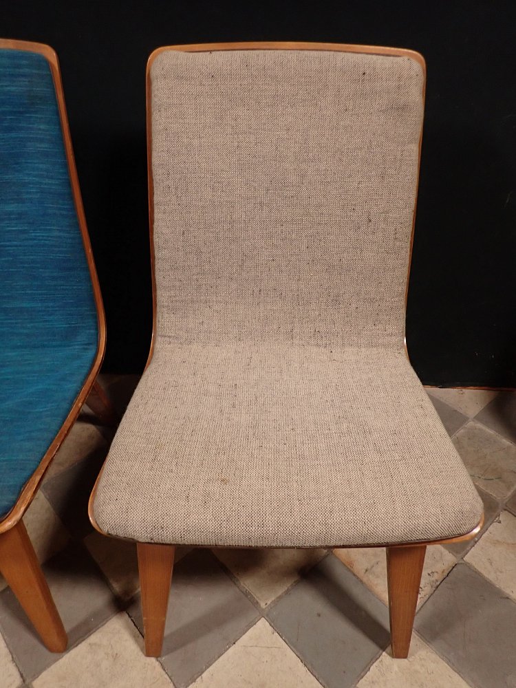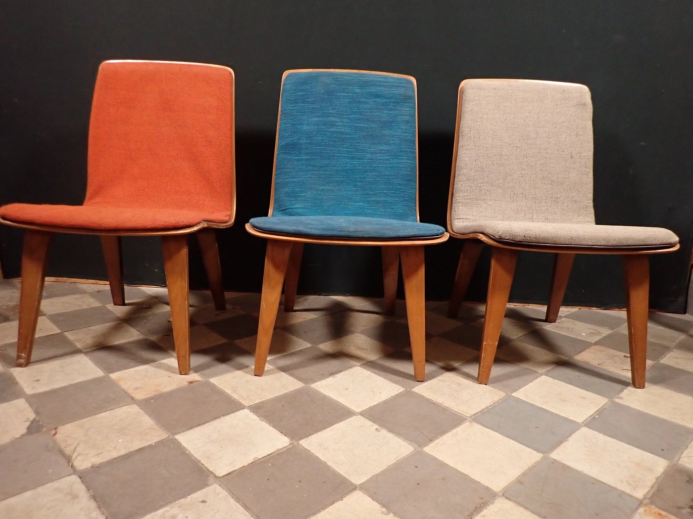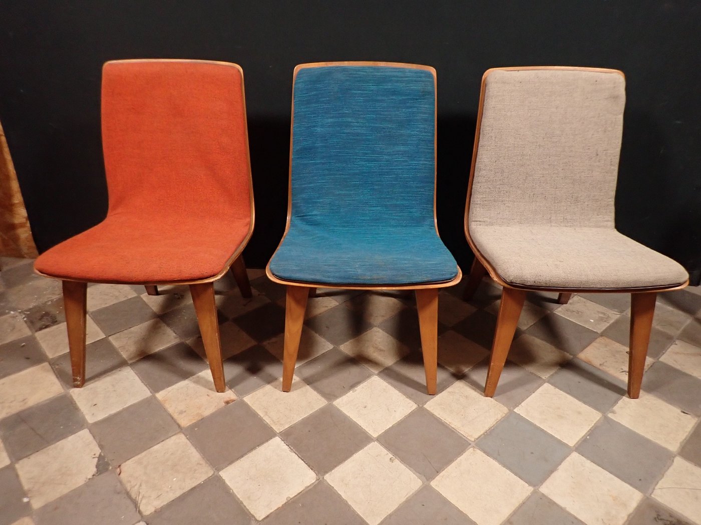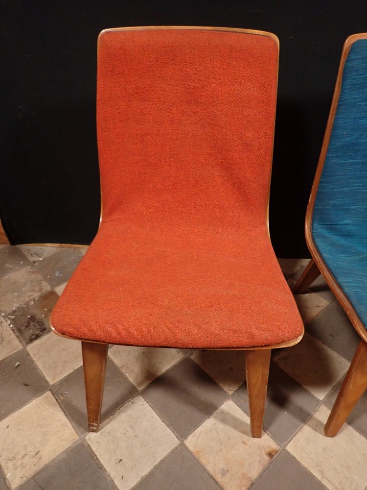 Das Stuhlgestell besteht aus Holz und hat eine außergewöhnliche Form. Der Polsterbezug wird in der Lehne eingehängt und auf der Unterseite mit zwei schrauben festgeschraubt. Somit lässt sich das Polster einfach reinigen, ohne den Stuhl mit Wasserflecken zu beschädigen. Bei dem roten und blauen Stuhl ist kein Polster mehr im Bezug vorhanden, dies müsste erneuert werden. Bei dem beigen Stuhl ist das Polster noch intakt.