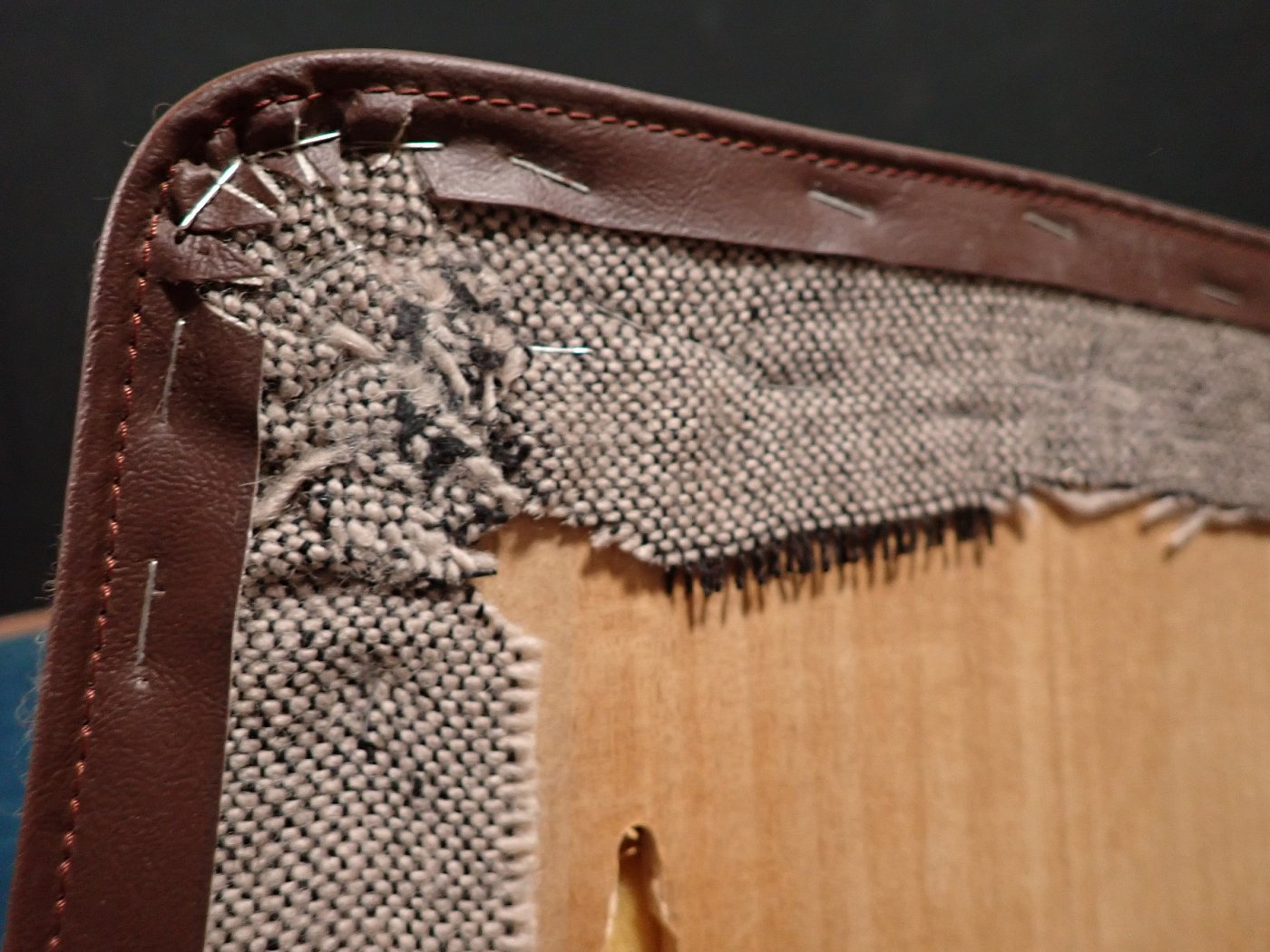 DetailansichtBlumenhocker aus den 50er-Jahren. Der Blumenhocker besteht aus einer Holzspanplatte, die mit einem Stoff überzogen und am Rand mit runden Kopfnägeln befestigt...