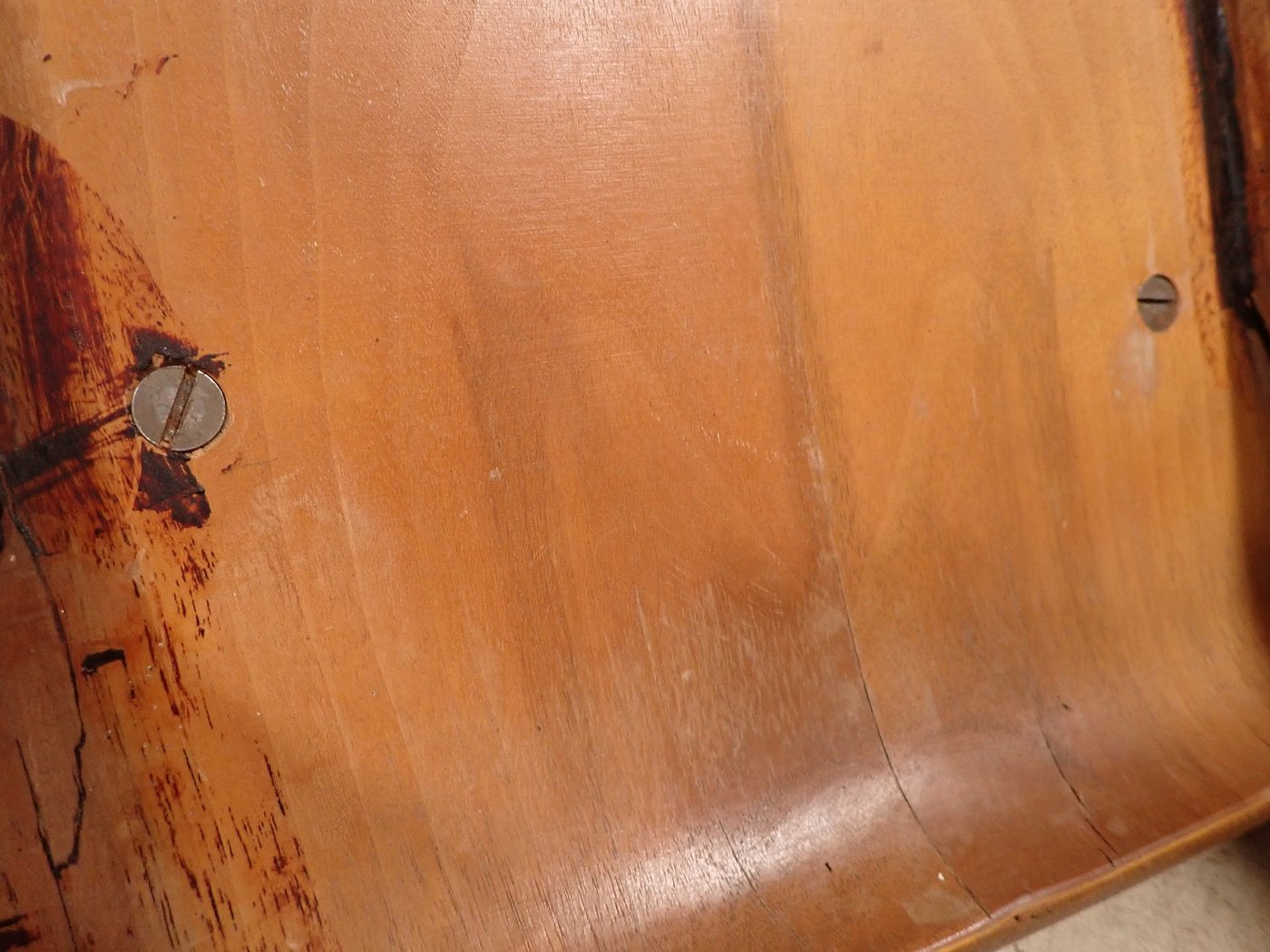 DetailansichtDer 70er-Jahre Esszimmerstuhl ist aus Weichholz. Am Sitzflächenrand hat der Stuhl leichte Gebrauchsspuren. Sonst ist der Zustand gut.