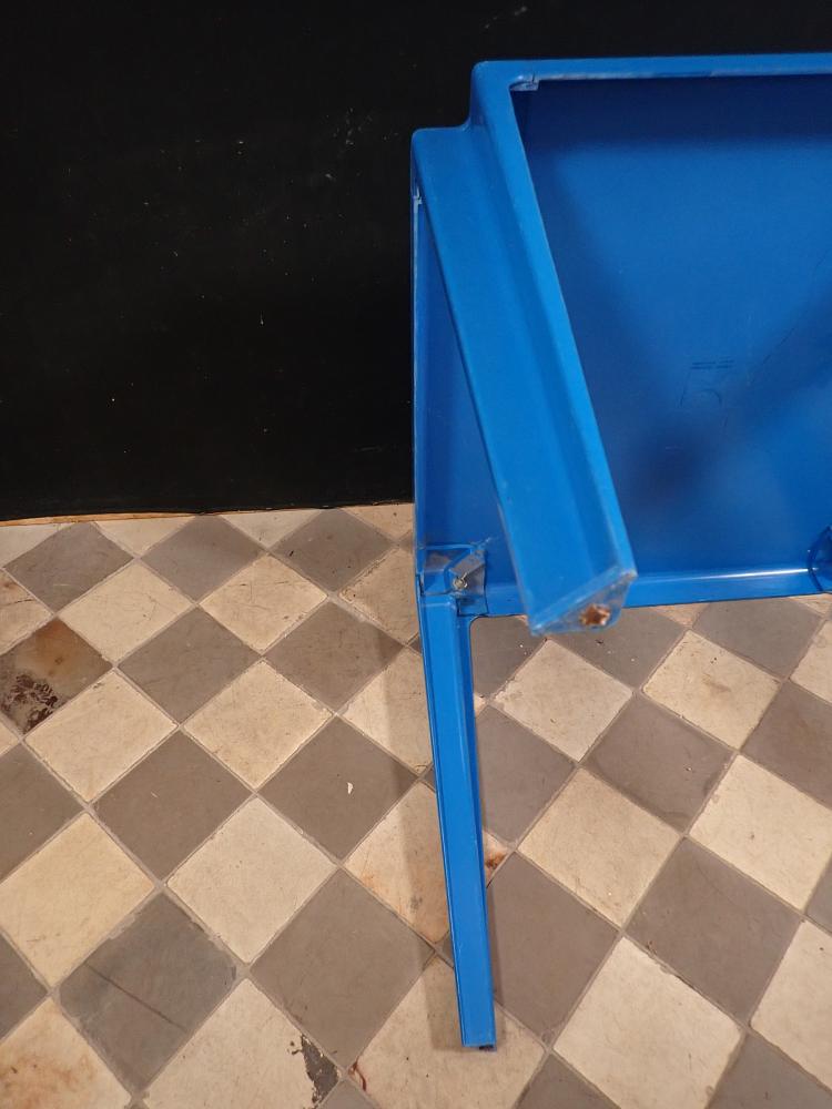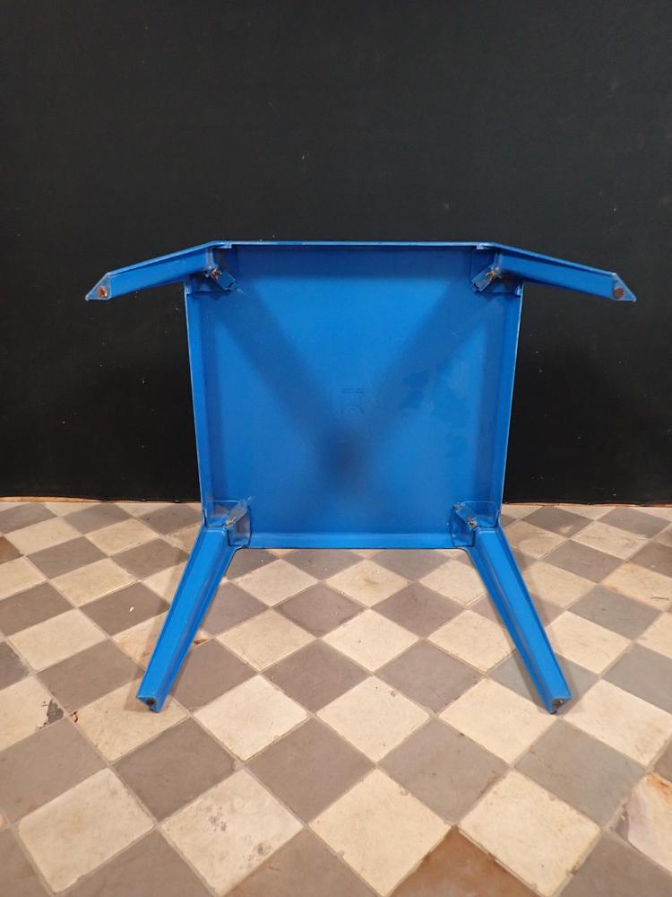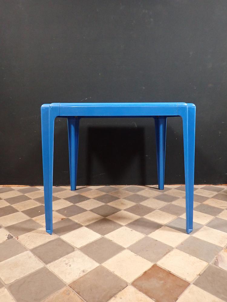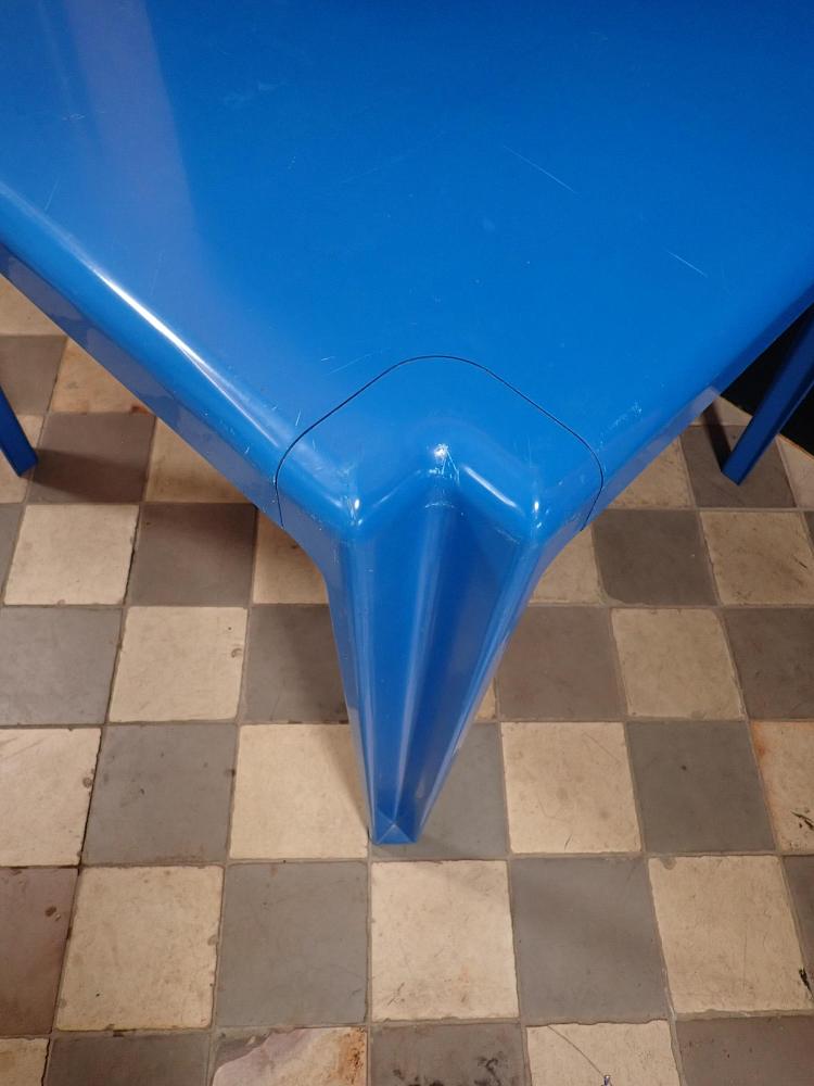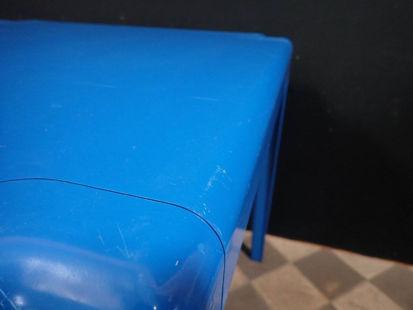 Eine intensive Nutzung kann der 70er-Jahre Tisch definitiv nicht leugnen, denn auf der Oberfläche gibt es zahlreiche kleine Kratzer, was echte Designfans jedoch nicht abhalten sollte, mit dem blauen Tisch einen schönen Blickfang zu setzen.