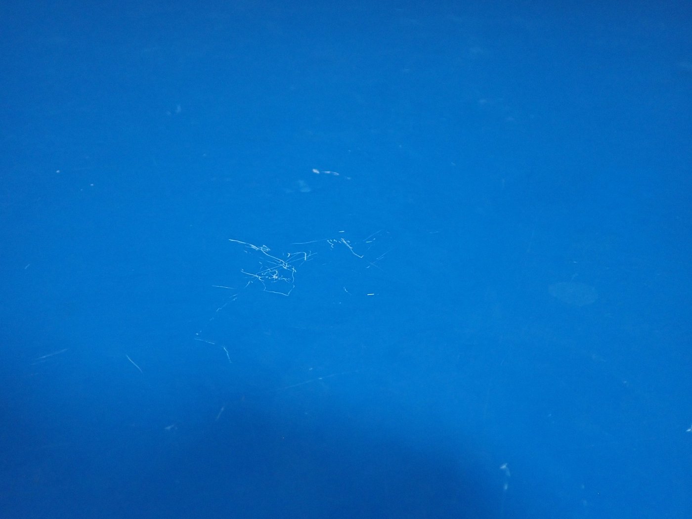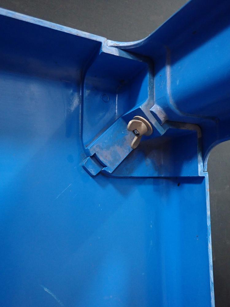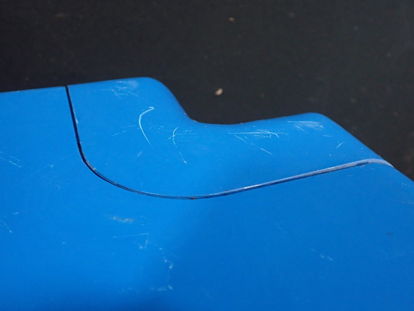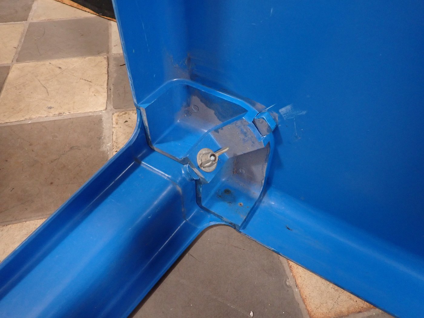 Eine intensive Nutzung kann der 70er-Jahre Tisch definitiv nicht leugnen, denn auf der Oberfläche gibt es zahlreiche kleine Kratzer, was echte Designfans jedoch nicht abhalten sollte, mit dem blauen Tisch einen schönen Blickfang zu setzen.