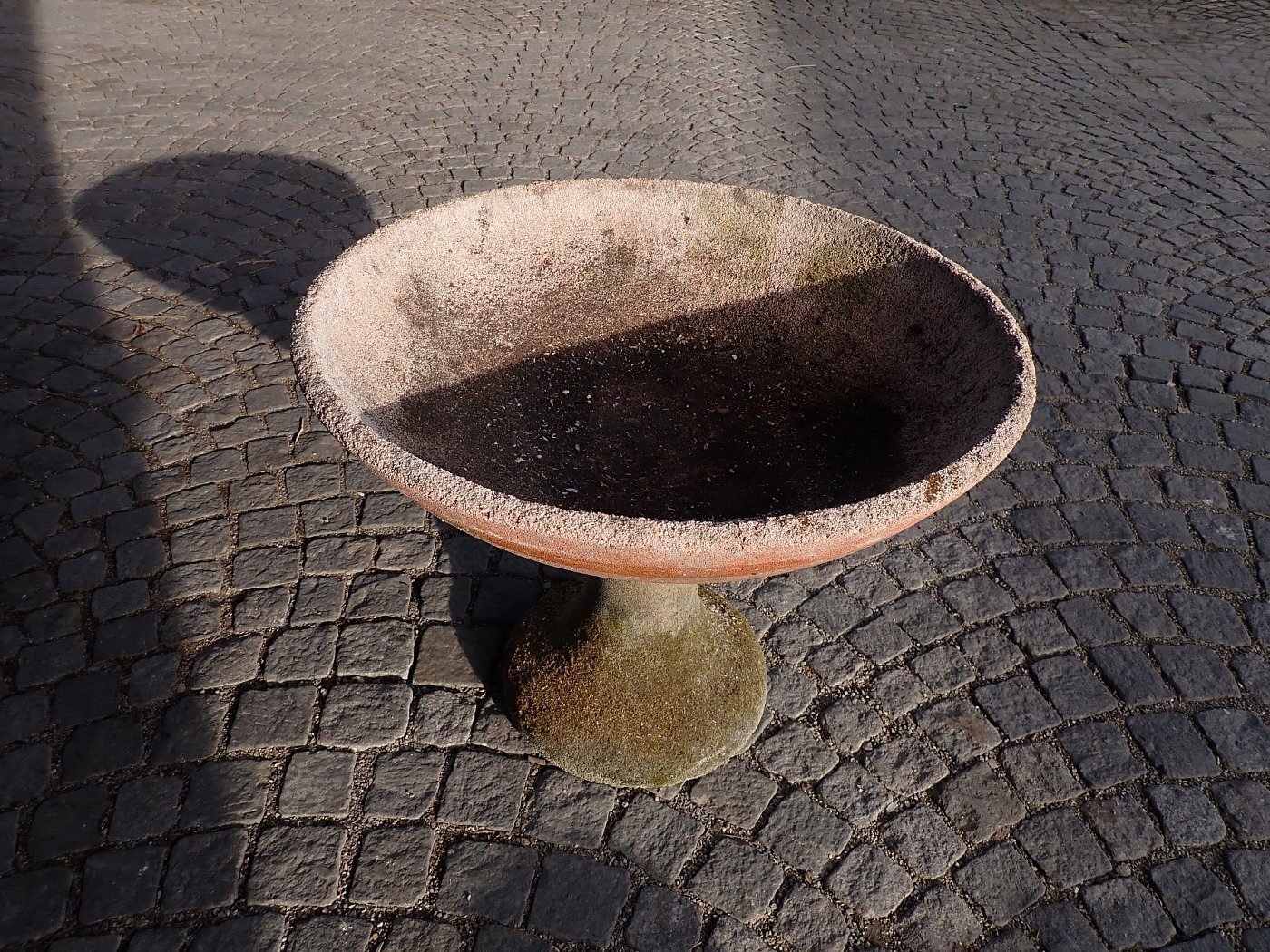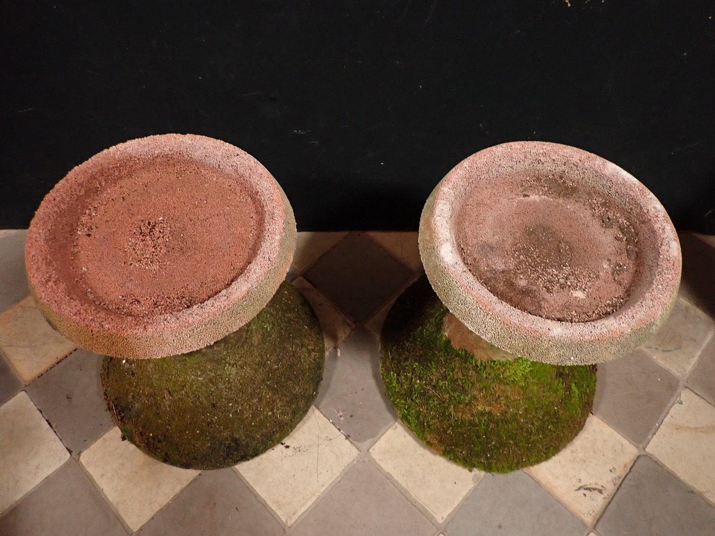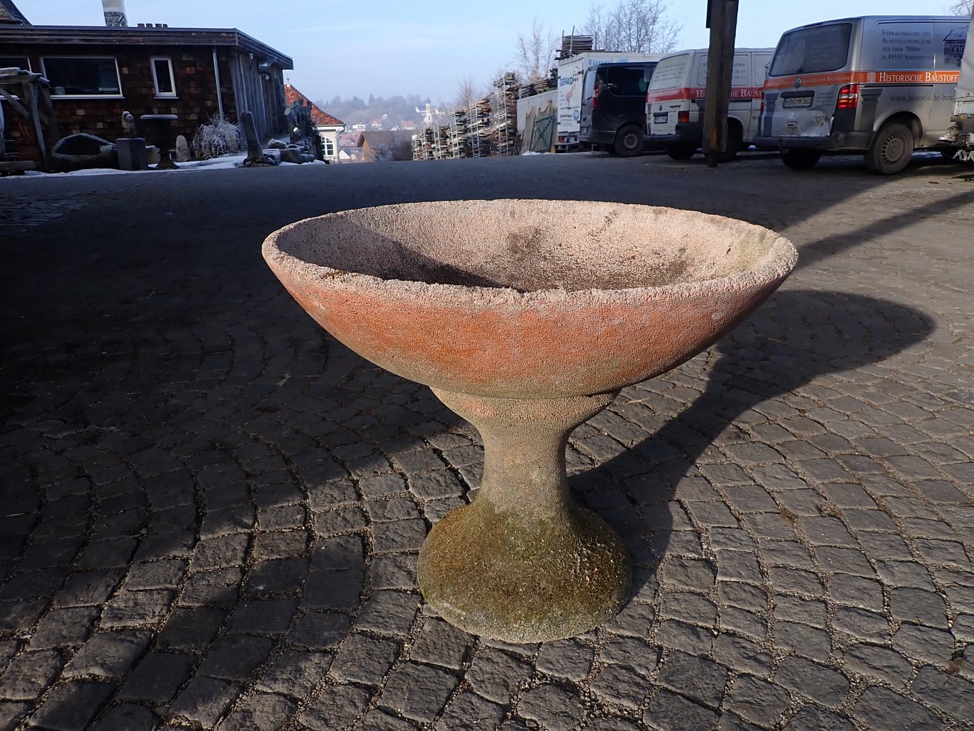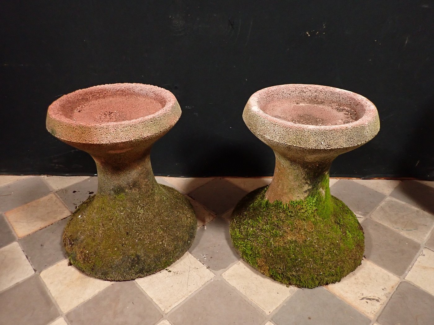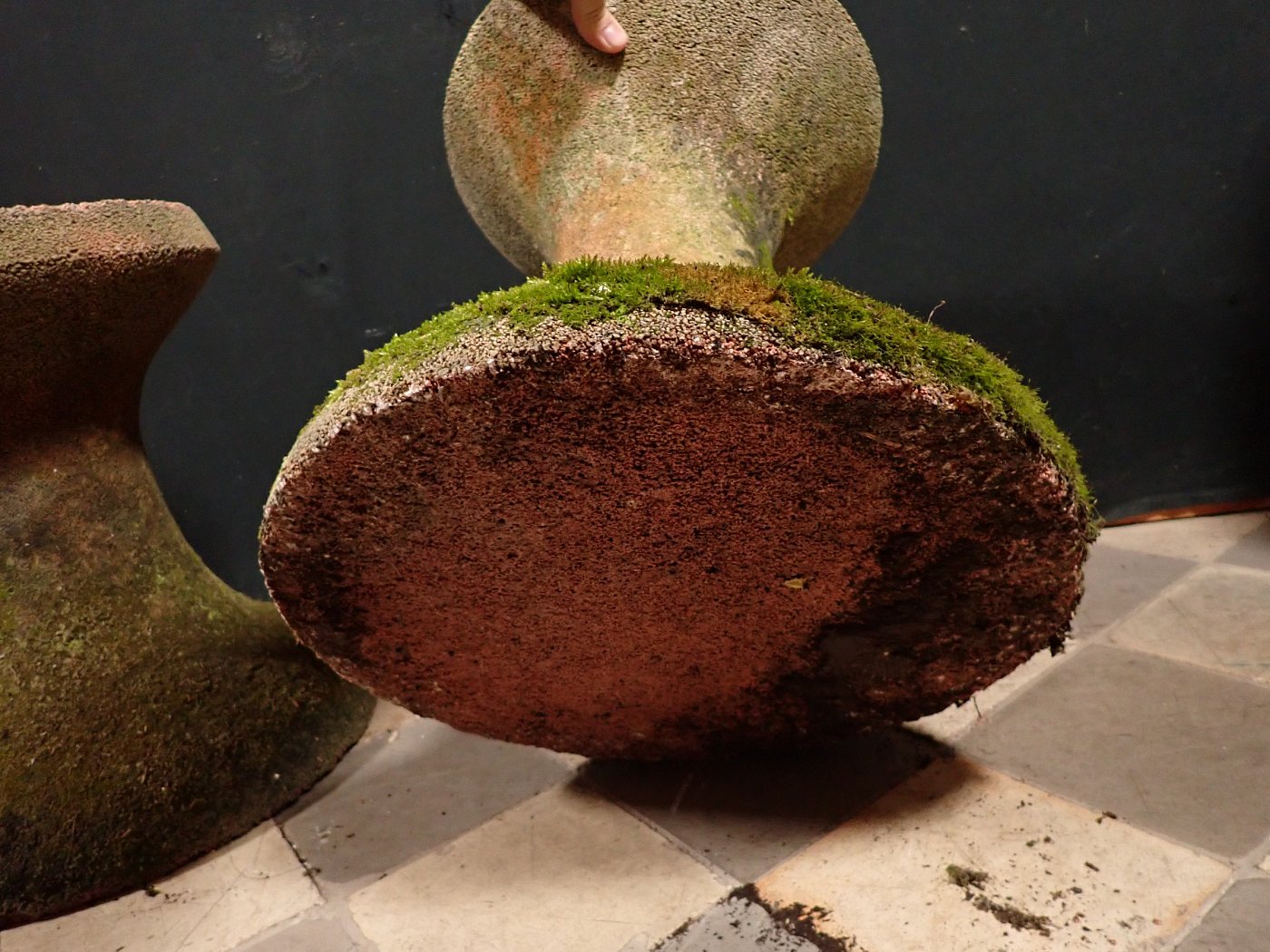 Das Blumenständerpaar ist aus Beton gegossen und hat eine leicht rötliche Färbung. Beim genauen Hinsehen entdeckt man eine grobe Struktur. Mit einer Reinigung und das Entfernen des Mooses kommt der Blumenständer wieder besser zur Geltung und ist einsetzbar auf dem Balkon oder im Garten.