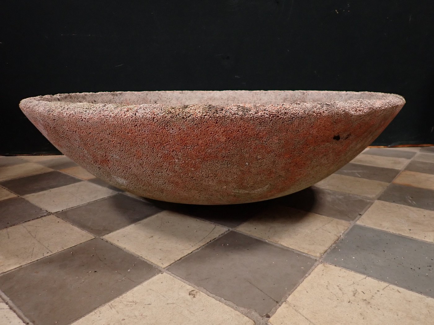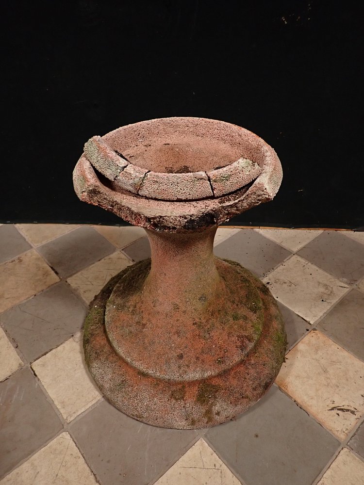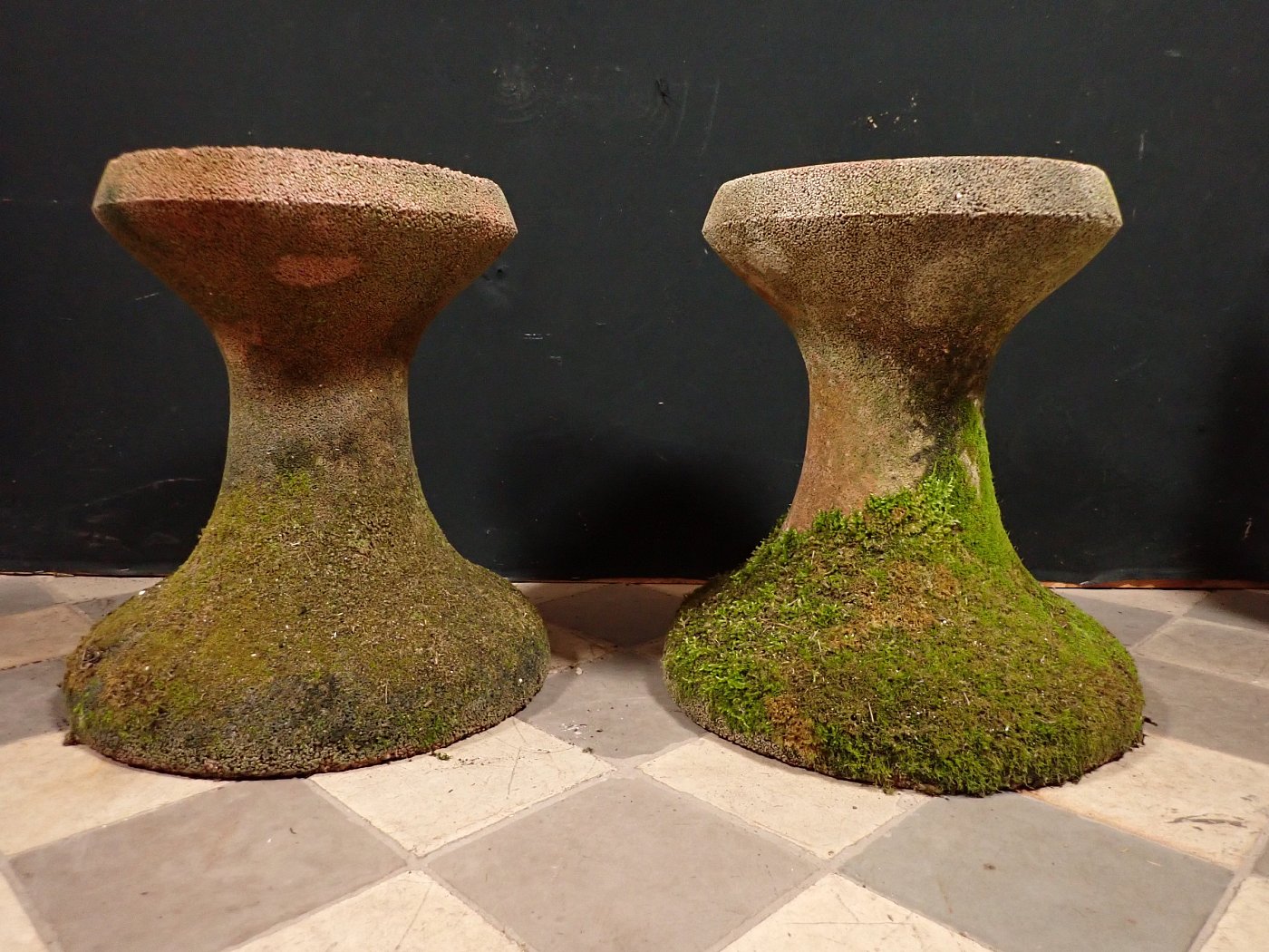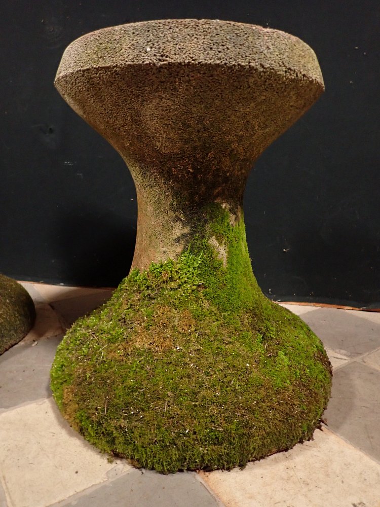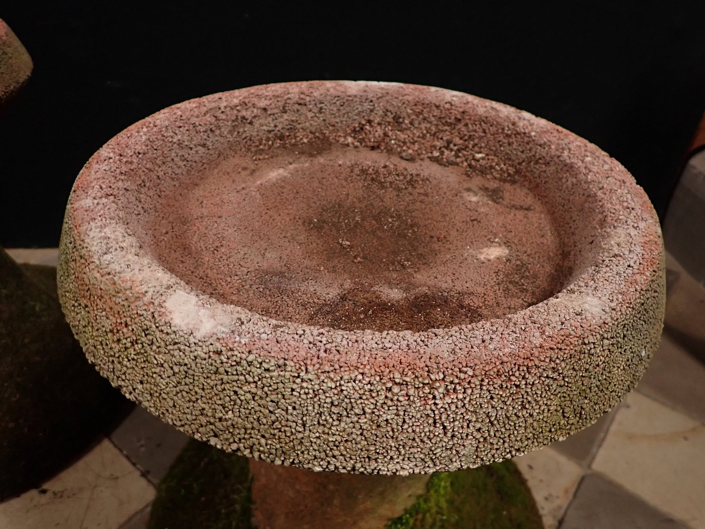 Das Blumenständerpaar ist aus Beton gegossen und hat eine leicht rötliche Färbung. Beim genauen Hinsehen entdeckt man eine grobe Struktur. Mit einer Reinigung und das Entfernen des Mooses kommt der Blumenständer wieder besser zur Geltung und ist einsetzbar auf dem Balkon oder im Garten.