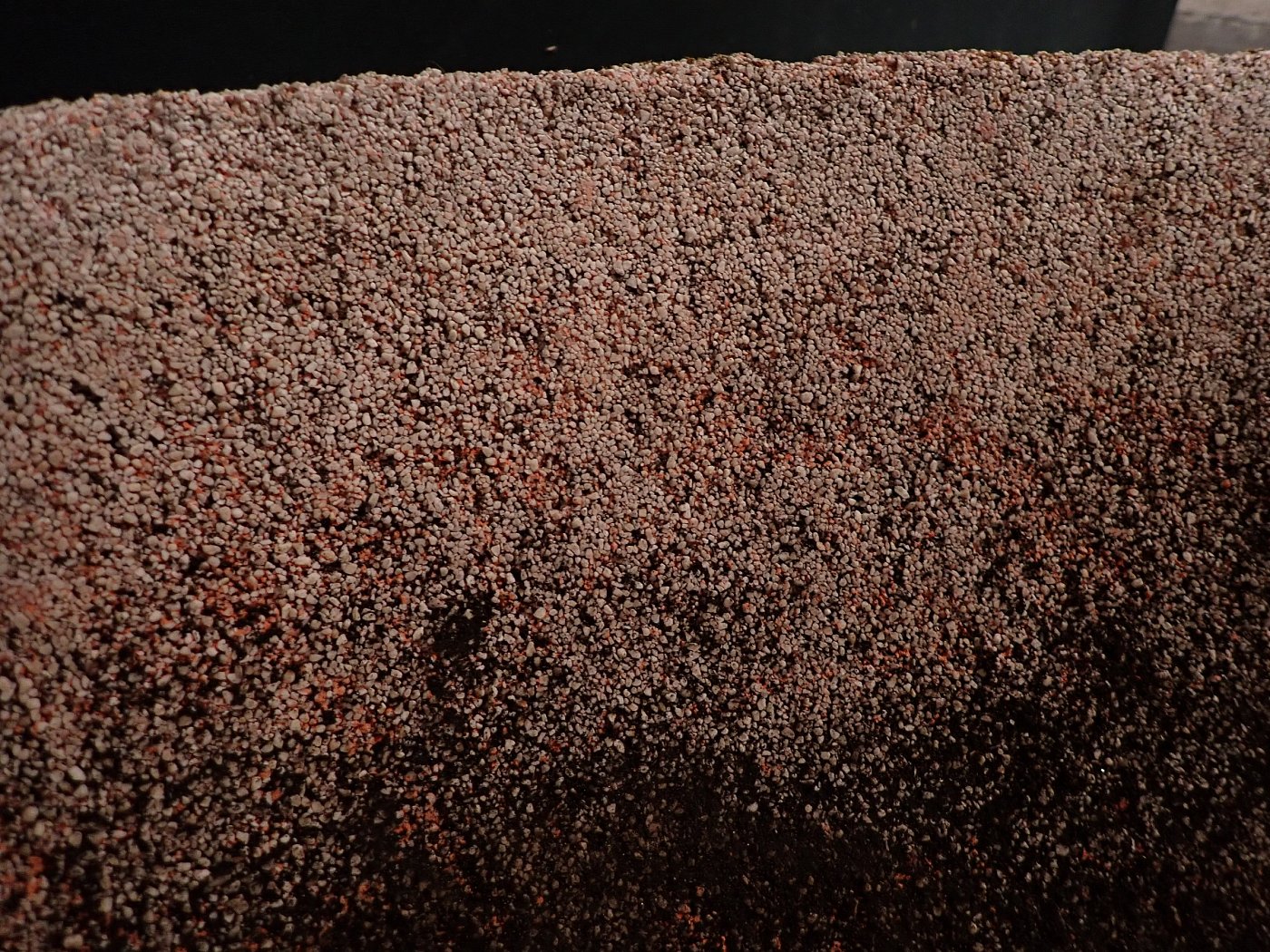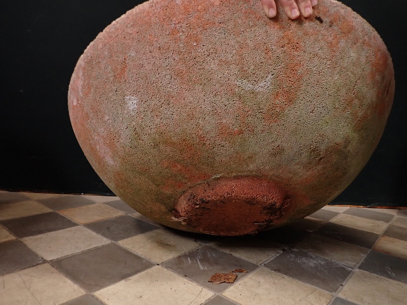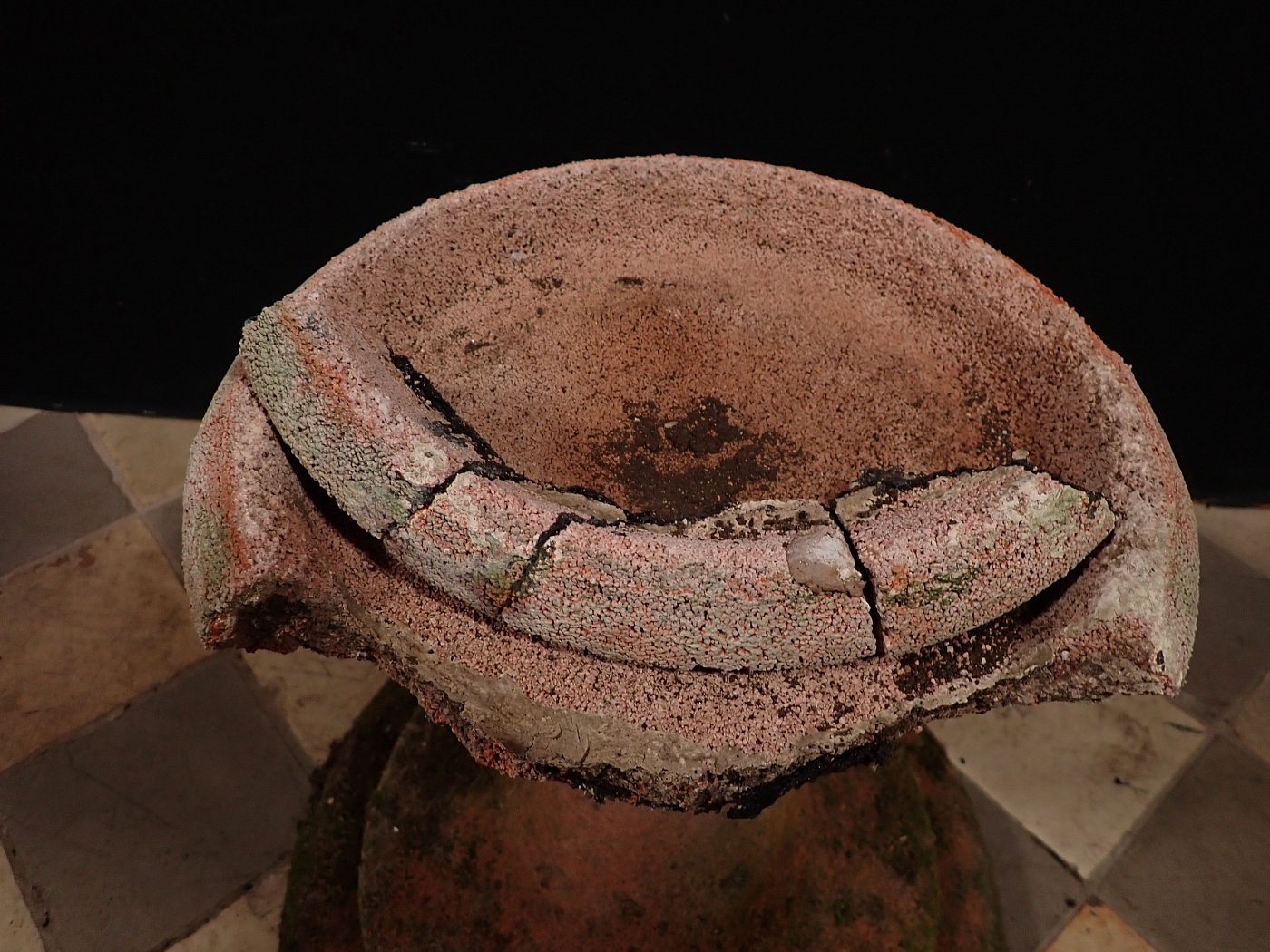 Es sind leichte Abplatzer zu erkennen, aber durch die eh schon grobe Struktur, nicht auffällig. An einem Blumenständer ist am Untergestell eine abgebrochene Stelle.
