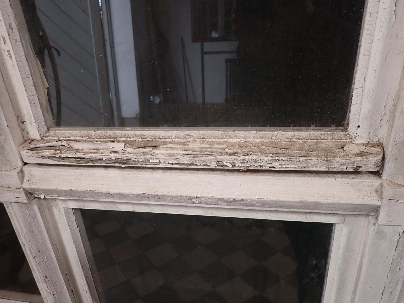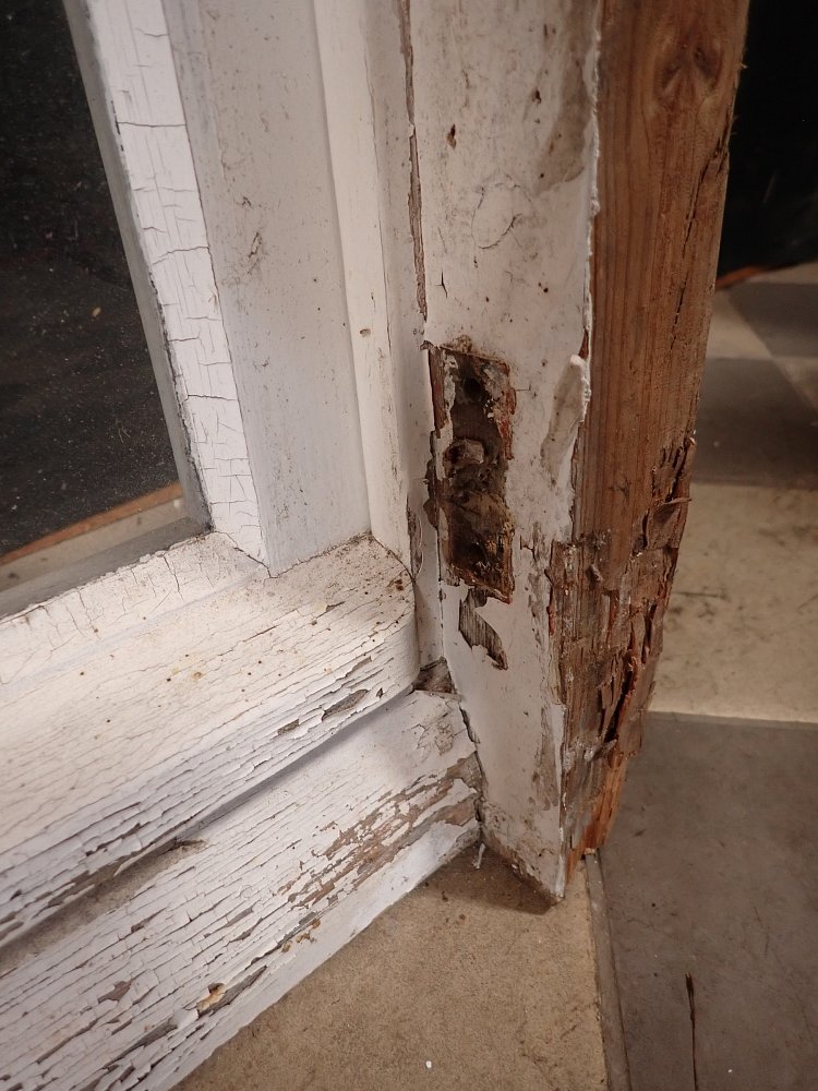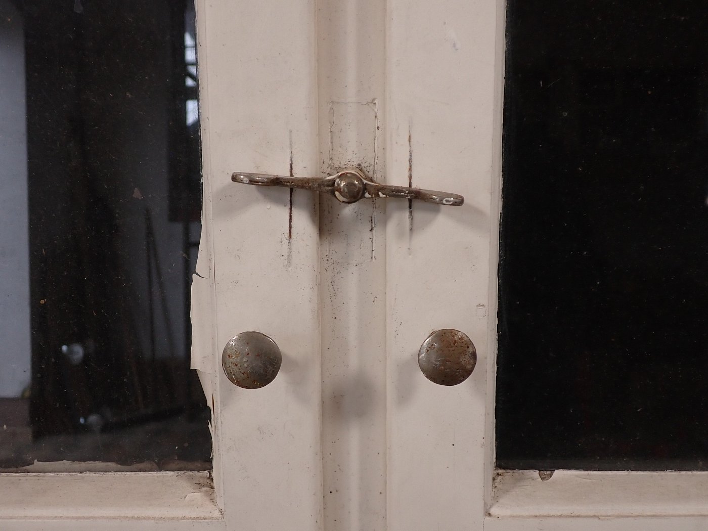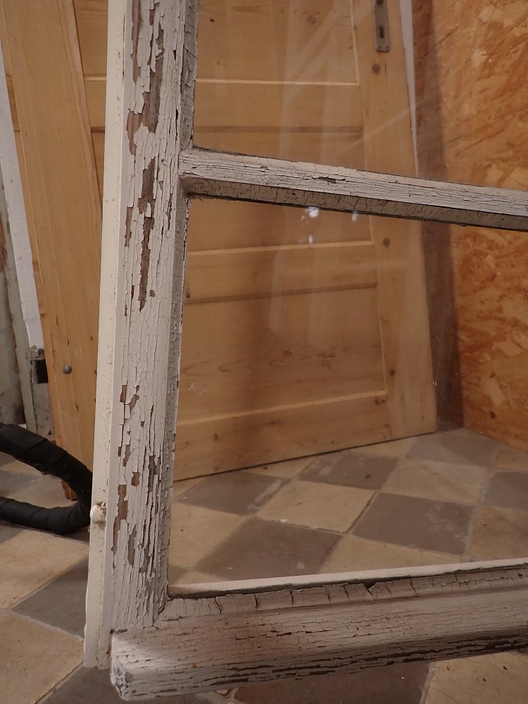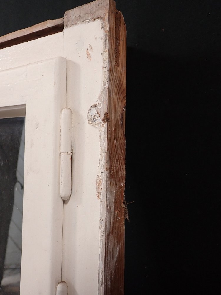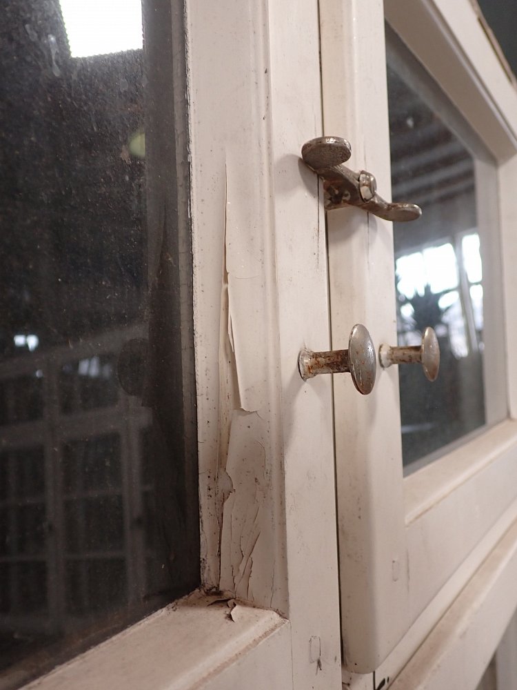 Mittlerweile löst sich der weiße Lack und blättert stark ab, außerdem weisen die Metallelemente des Fensters Rost auf.