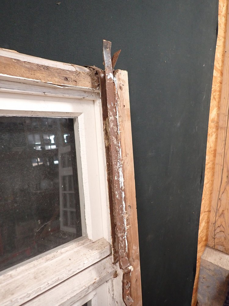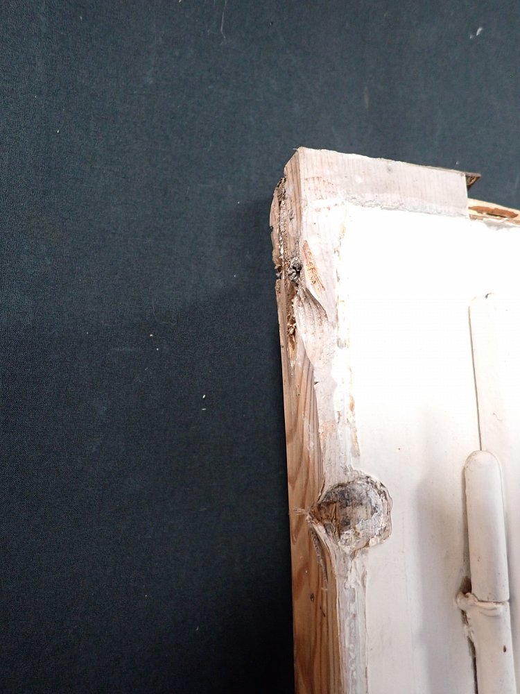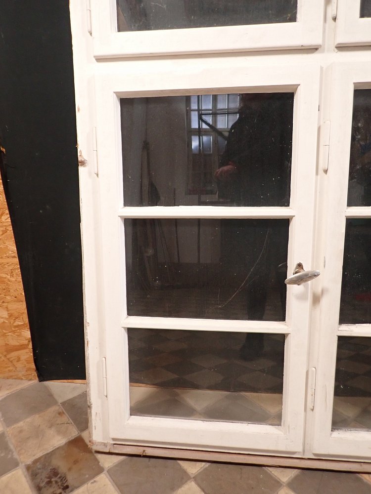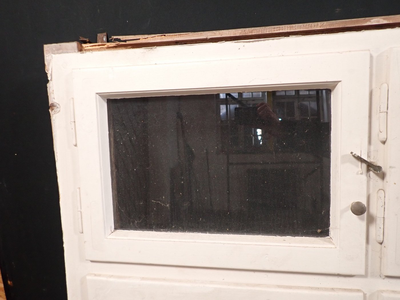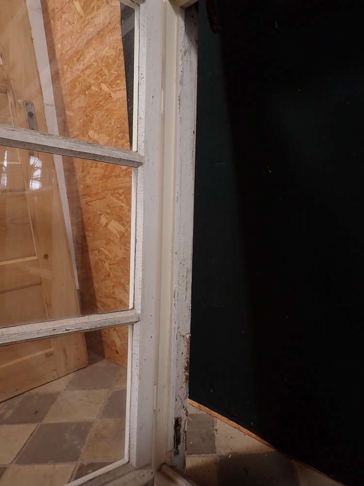 Mittlerweile löst sich der weiße Lack und blättert stark ab, außerdem weisen die Metallelemente des Fensters Rost auf.